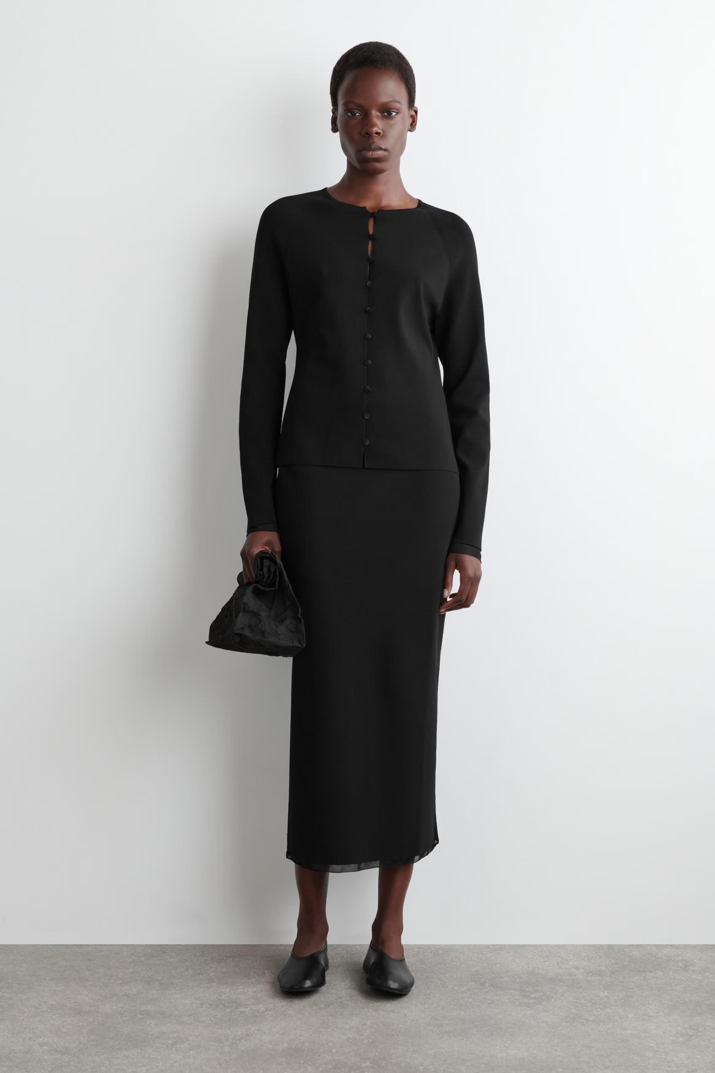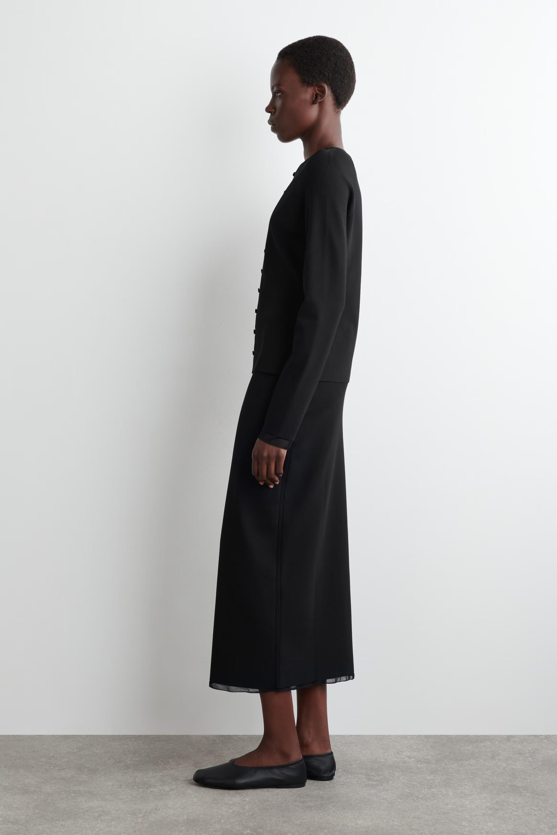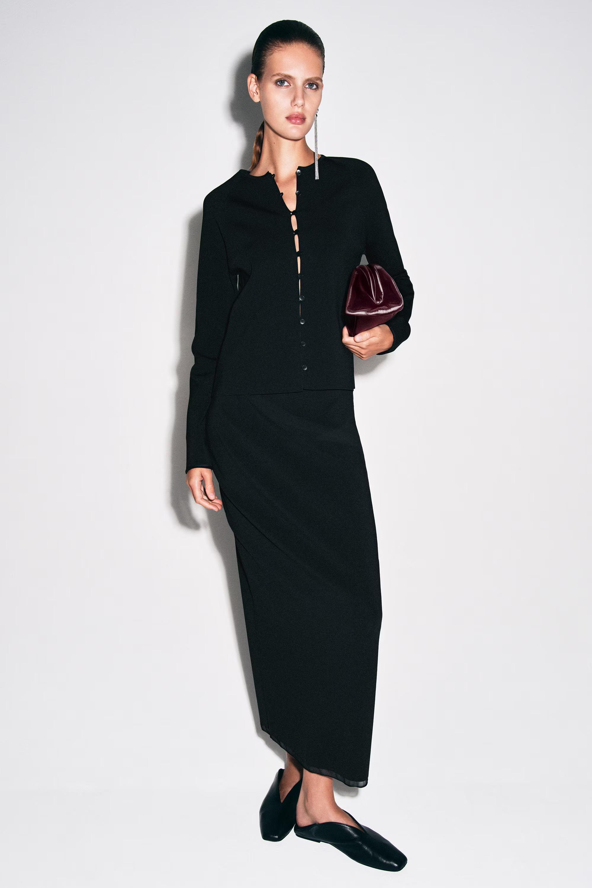Each season, the womenswear team propose a collection of refined pieces that are powerful in their simplicity. This minimal cardigan is knitted in a slim silhouette with softly structured shoulders and delicate, sheer accents that trace the cuffs. Style it into the evening with the matching bandeau and skirt.\u0026nbsp;\u0026nbsp;Slim fitButton closureRecycled polyester is polyester made from PET bottles or end-of-life textile waste. The PET bottles or textile waste is mechanically recycled and processed into new yarn\u0026nbsp;Shell: 54% Viscose, 46% Recycled polyester. Excluding trims / Machine wash\u0026nbsp;Back length of size S is 59cm / Model wears a size S
