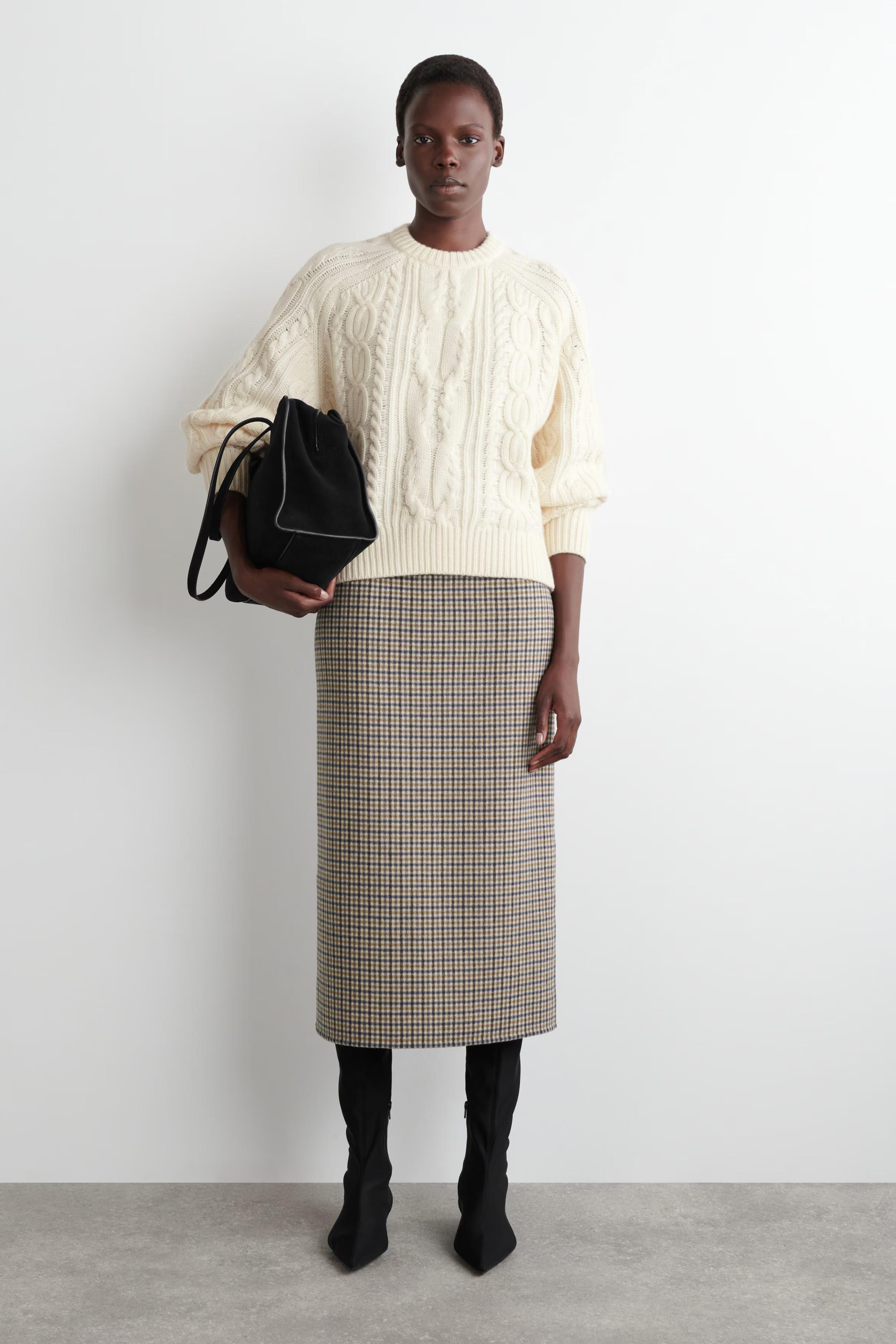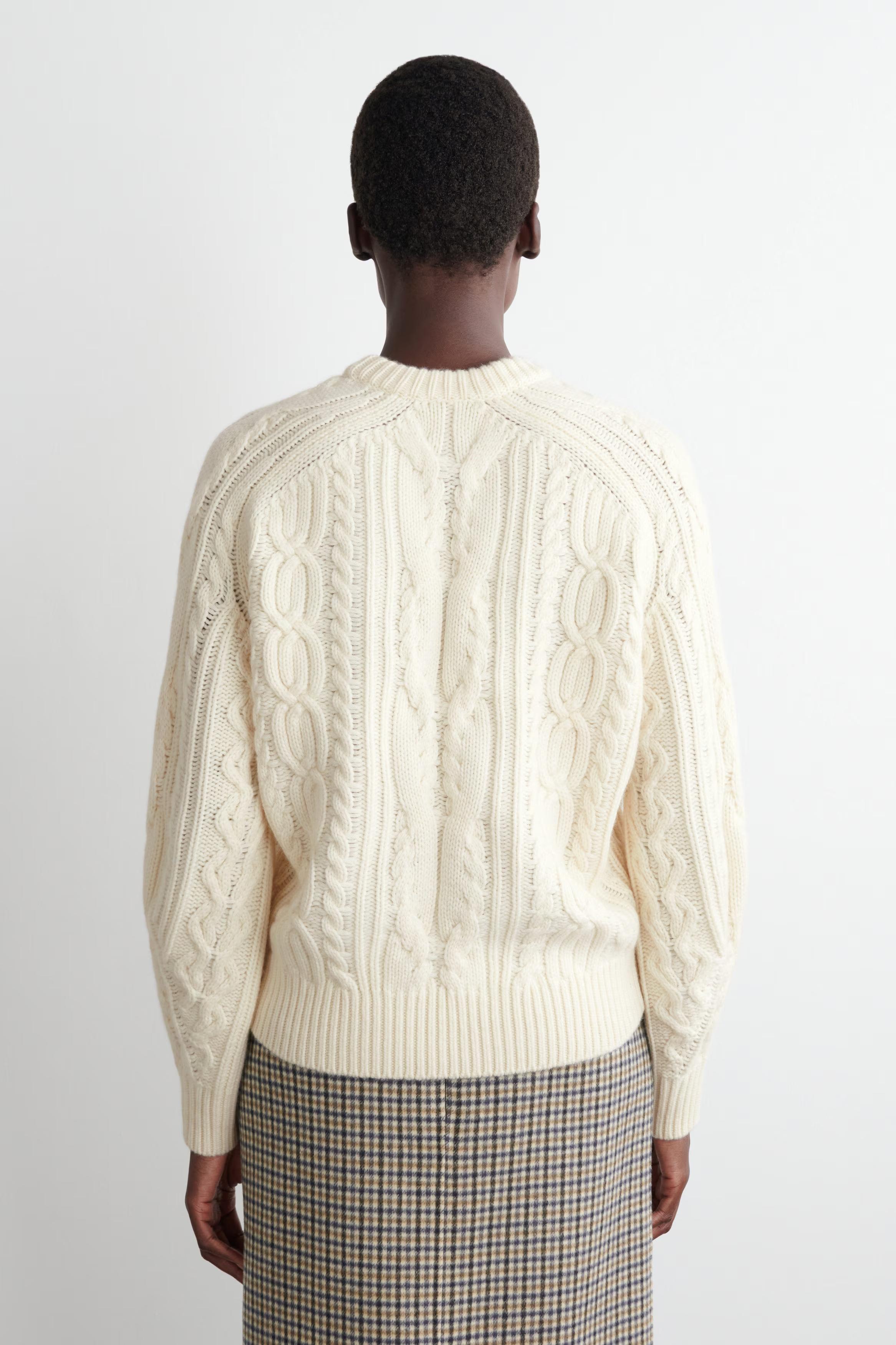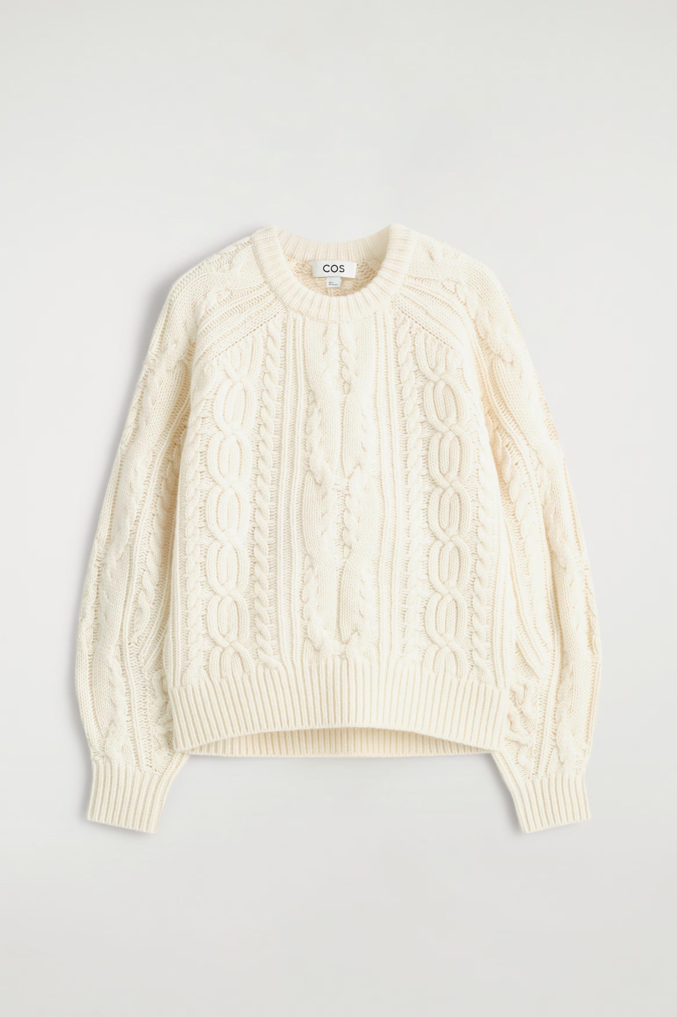 The COS designers propose a new view on heritage for Autumn Winter 2025. Inspired by alpine skiwear, this refined jumper is cable-knitted from premium merino wool and cashmere that has a luxuriously soft hand feel.\u0026nbsp;\u0026nbsp;Regular fitThis product contains Responsible Wool Standard TE-00047206 (RWS) wool fibre from farms certified to animal welfare and land-management requirements\u0026nbsp;Shell: 70% Merino wool, 30% Recycled cashmere. Excluding trims / Machine wash\u0026nbsp;Back length of size S is 60cm / Model wears a size S