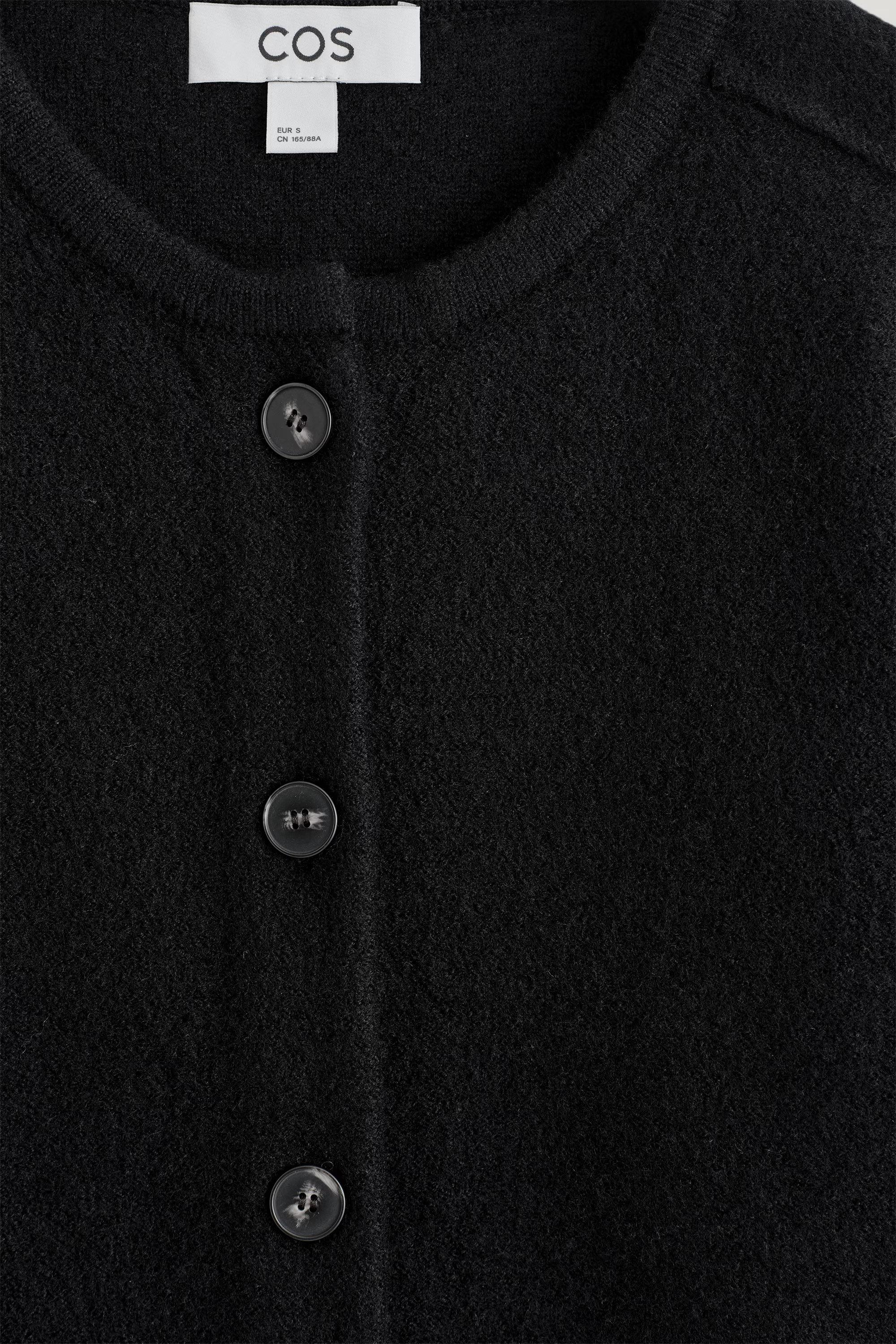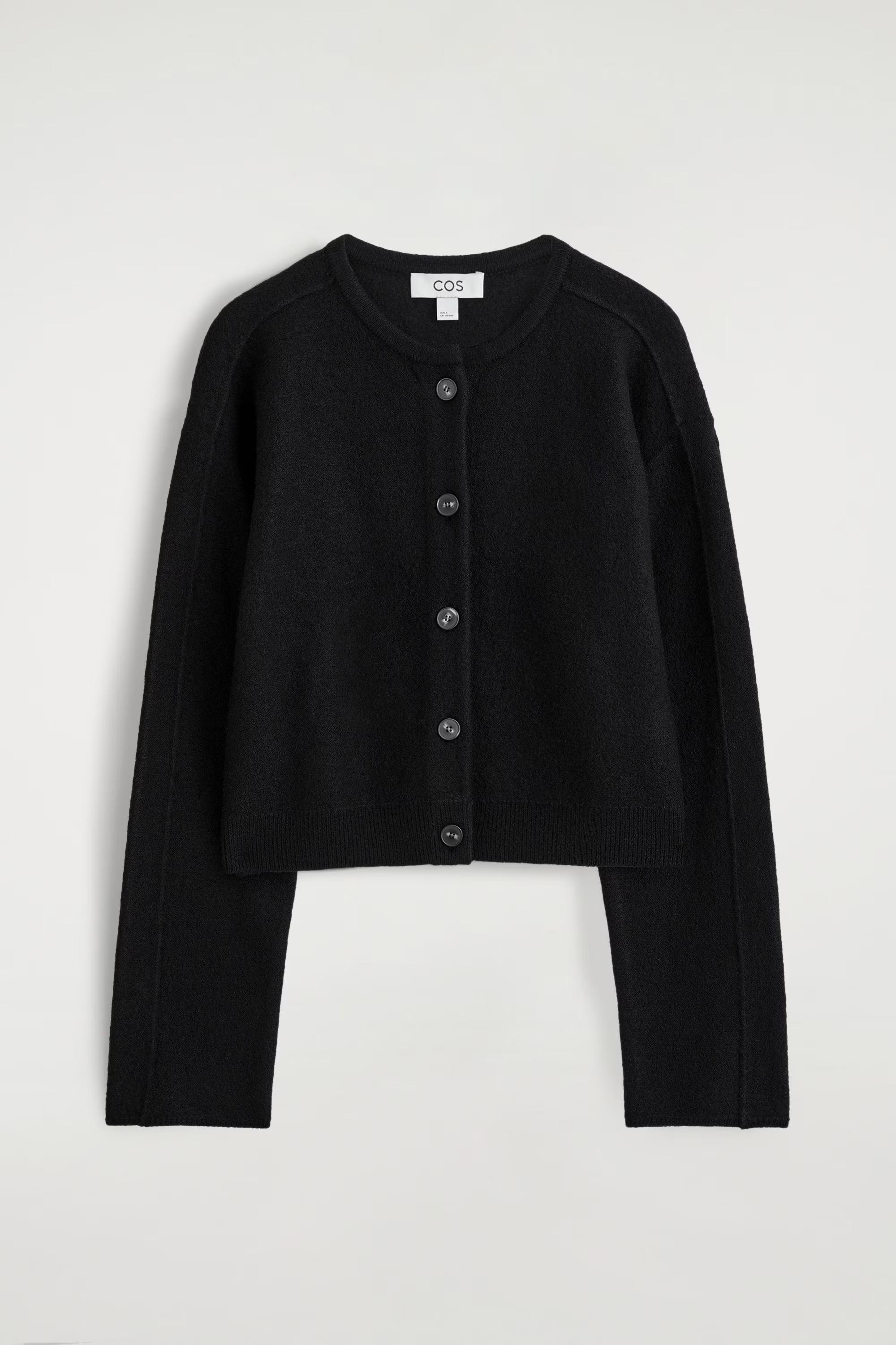 Refined silhouettes and luxuriously tactile yarns define the COS knitwear collection. Rendered in classic black, this crew-neck cardigan is made from premium merino wool that's boiled for texture and designed in a rounded shape with overlapping seams at the shoulders.\u0026nbsp;Regular fitButton closureThis product contains Responsible Wool Standard TE-00047206 (RWS) wool fibre from farms certified to animal welfare and land-management requirements\u0026nbsp;Shell: 100% Merino wool. Excluding trims / Dry clean\u0026nbsp;Back length of size S is 50cm / Model wears a size S