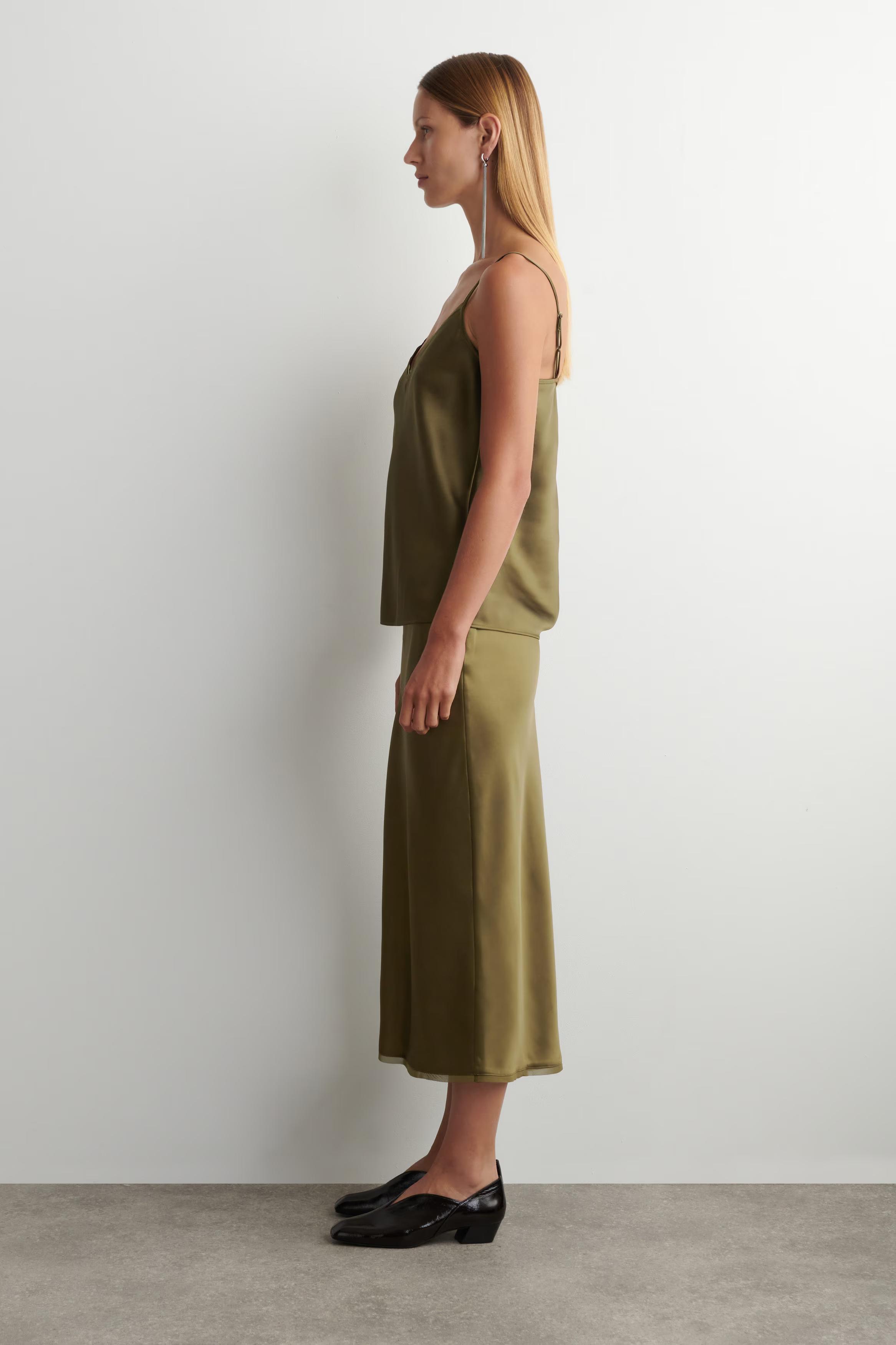 Crafted from luxuriously soft satin, this refined cami top is striking in its simplicity. It's designed with a laser-cut V-neckline, slim shoulder straps and delicate bias-cut chiffon trims. Style it with the matching skirt for a tonal look.\u0026nbsp;Regular fitRecycled polyester is polyester made from PET bottles or end-of-life textile waste. The PET bottles or textile waste is mechanically recycled and processed into new yarn\u0026nbsp;Shell: 100% Recycled polyester. Excluding trims / Machine wash\u0026nbsp;Back length of size EU 36 is 38.7cm / Model wears a size EU 36