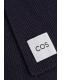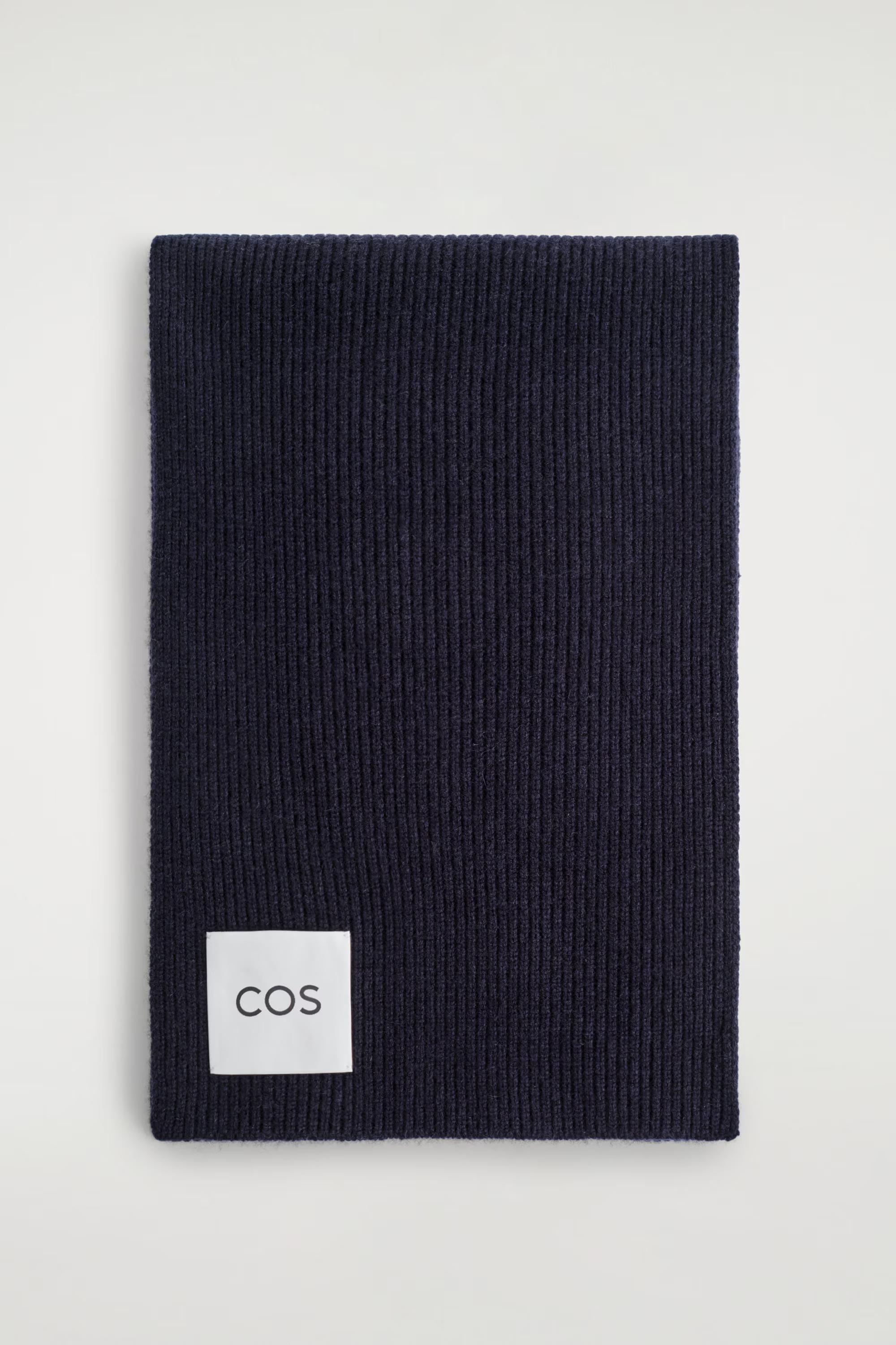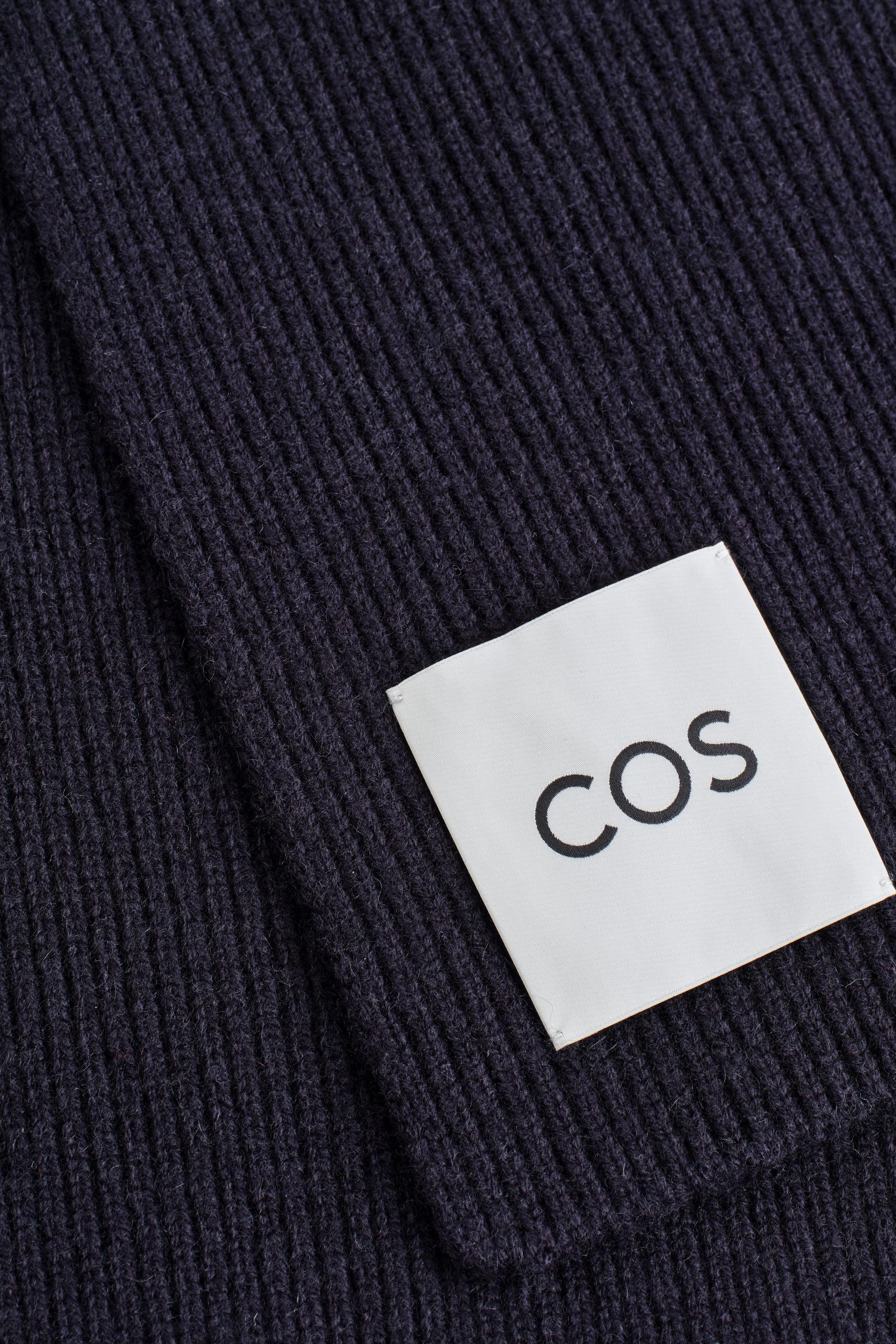 This chunky scarf can be effortlessly draped around your shoulders when the weather cools. Supremely soft to the touch, it's knitted from a premium blend of wool and cashmere that's ribbed for tactility and finished with the signature COS motif. The classic navy tone lends itself to a winter palette.\u0026nbsp;This product contains Responsible Wool Standard TE-00047206 (RWS) wool fibre from farms certified to animal welfare and land-management requirements\u0026nbsp;Shell: 70% RWS Wool, 30% Recycled cashmere. Excluding trims / Hand wash\u0026nbsp;Length: 170cm, Width: 26cm