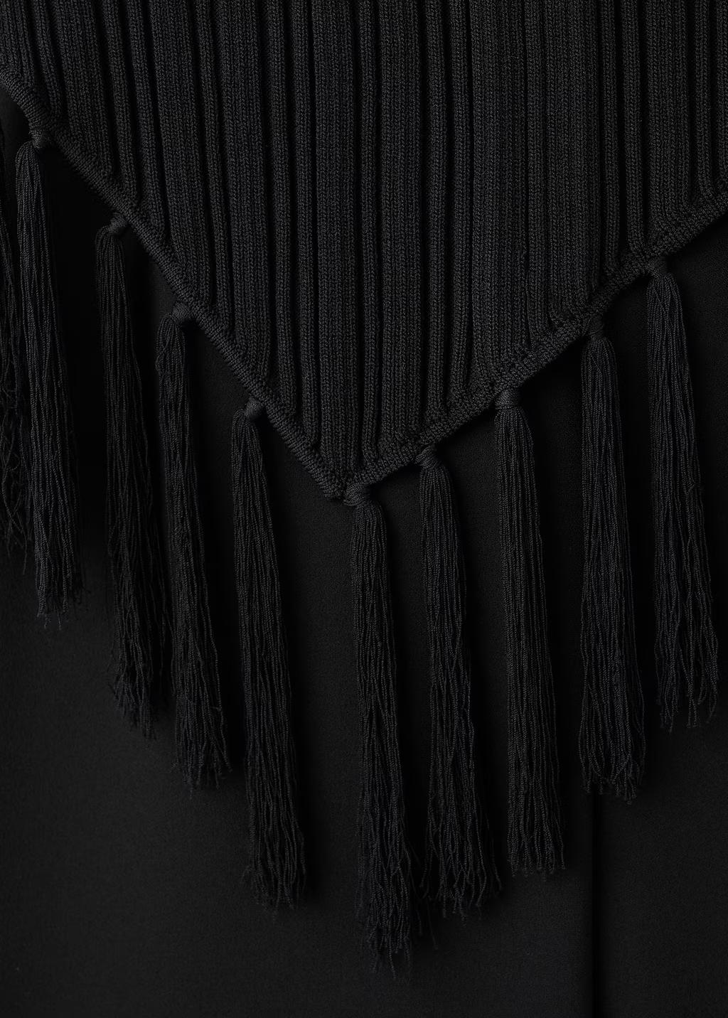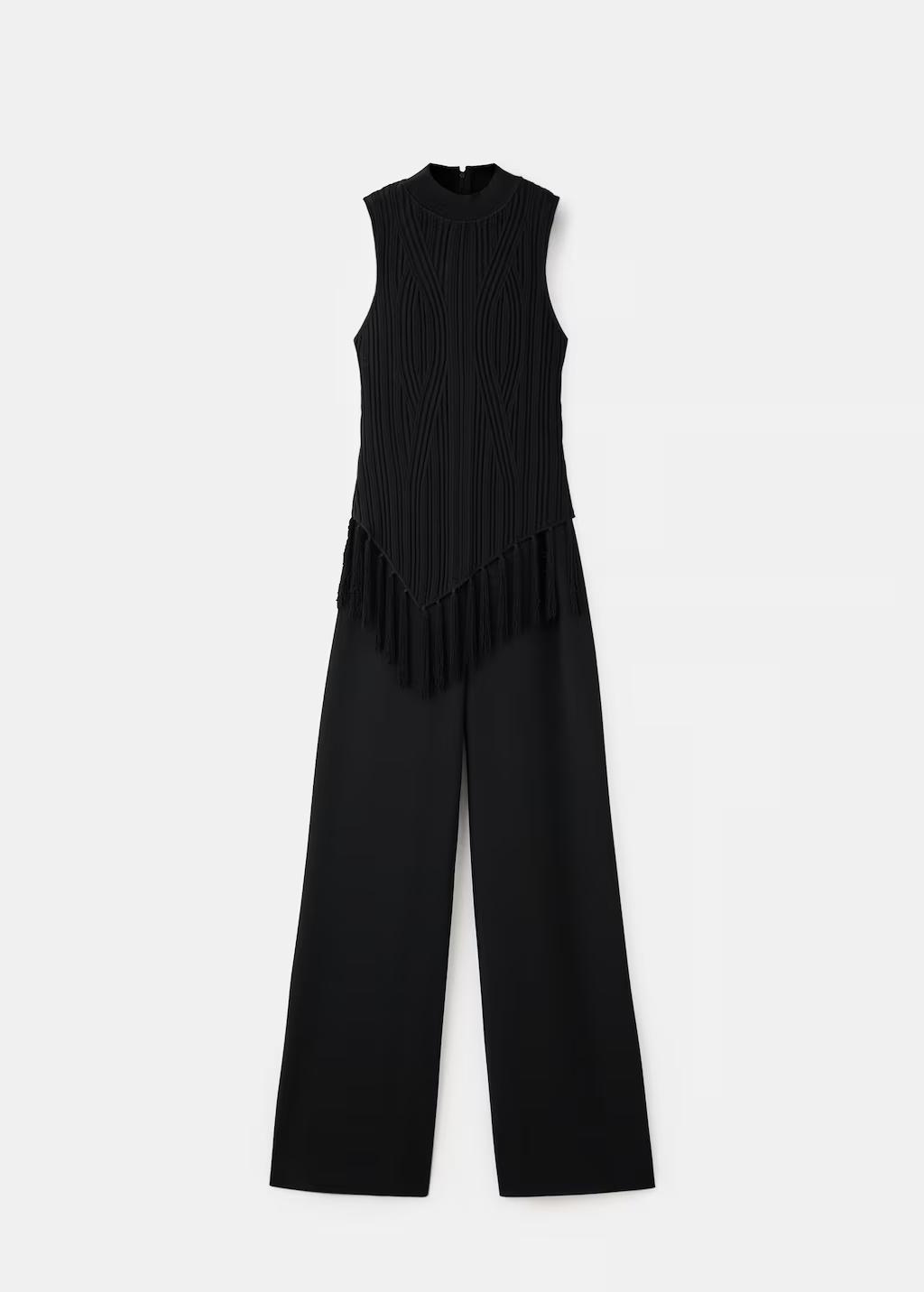 Tejido con textura. Diseño largo. Diseño combinado. Cuello perkins. Sin mangas. Tirantes anchos. Detalle de flecos. Cierre de cremallera en la parte posterior. Forro interior. Esta prenda pertenece a nuestra colección de fiesta y evento, diseñada para elevar tus looks en ocasiones especiales