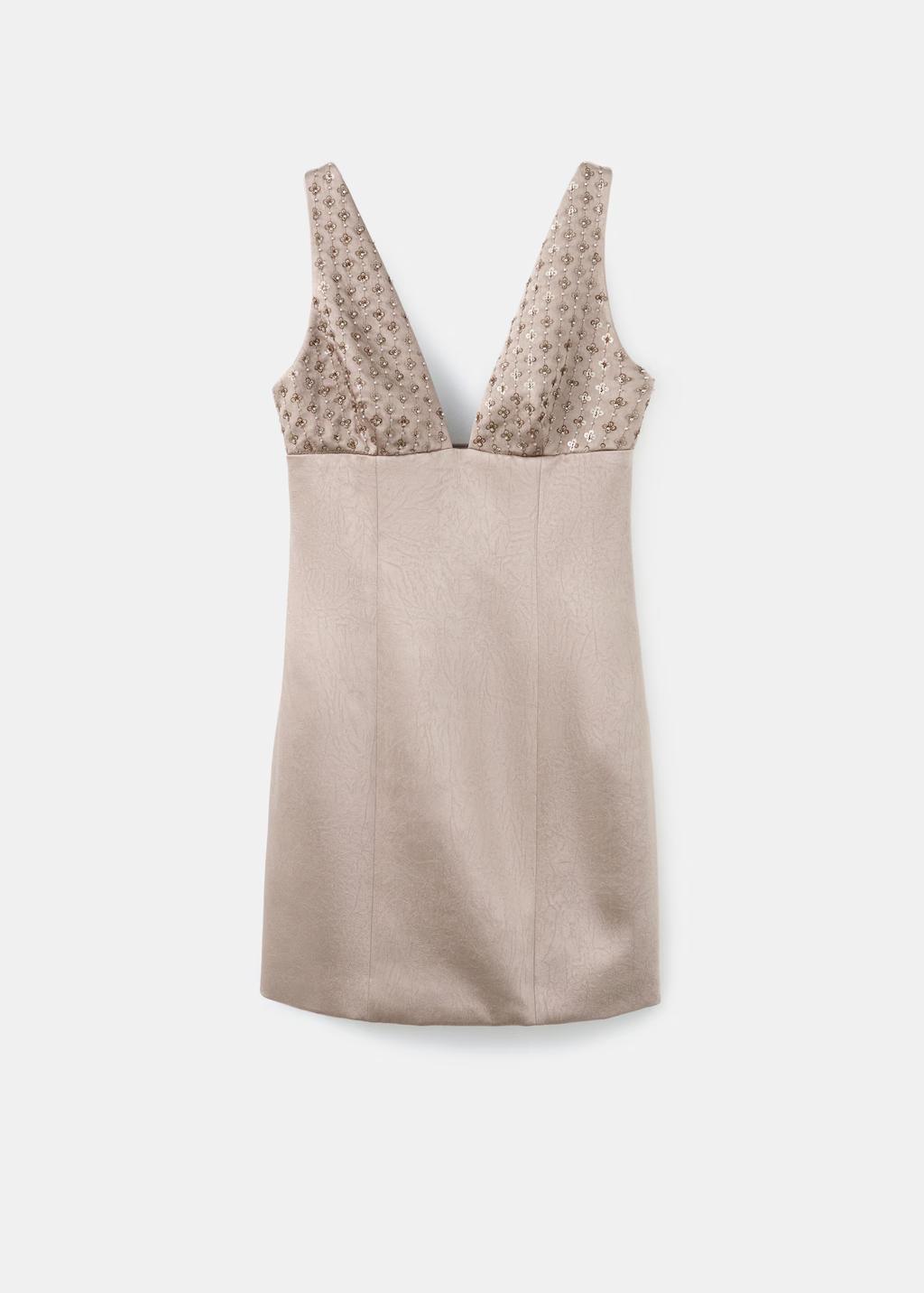 Tejido satinado. Efecto arrugado. Diseño corto. Diseño entallado. Escote de pico. Sin mangas. Tirantes anchos. Adorno de lentejuelas. Cierre de cremallera en la parte posterior. Forro interior. Esta prenda pertenece a nuestra colección de fiesta y evento, diseñada para elevar tus looks en ocasiones especiales