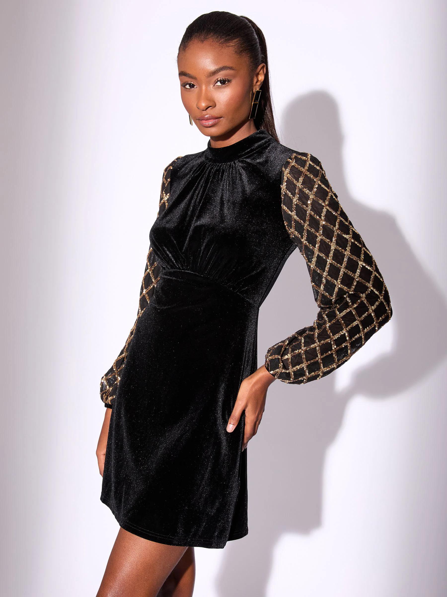 Lipsy Black Mini Velvet Sequin Detail Long Sleeve Shift Dress