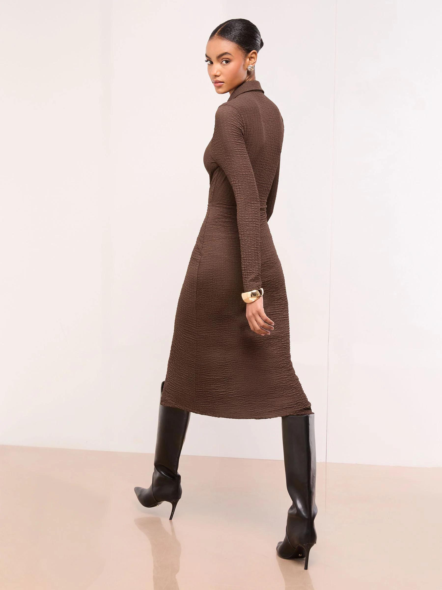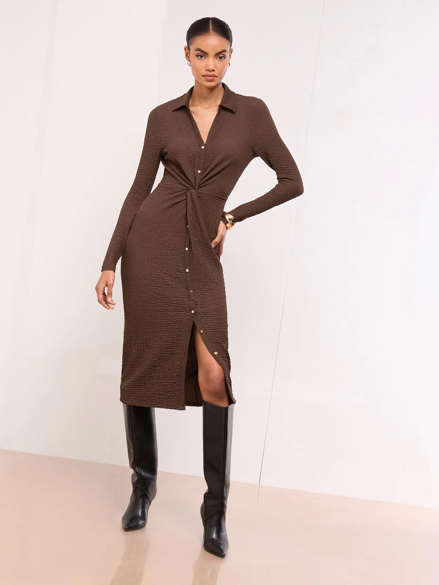 Lipsy Chocolate Brown Textured Jersey Knot Midi Shirt Dress