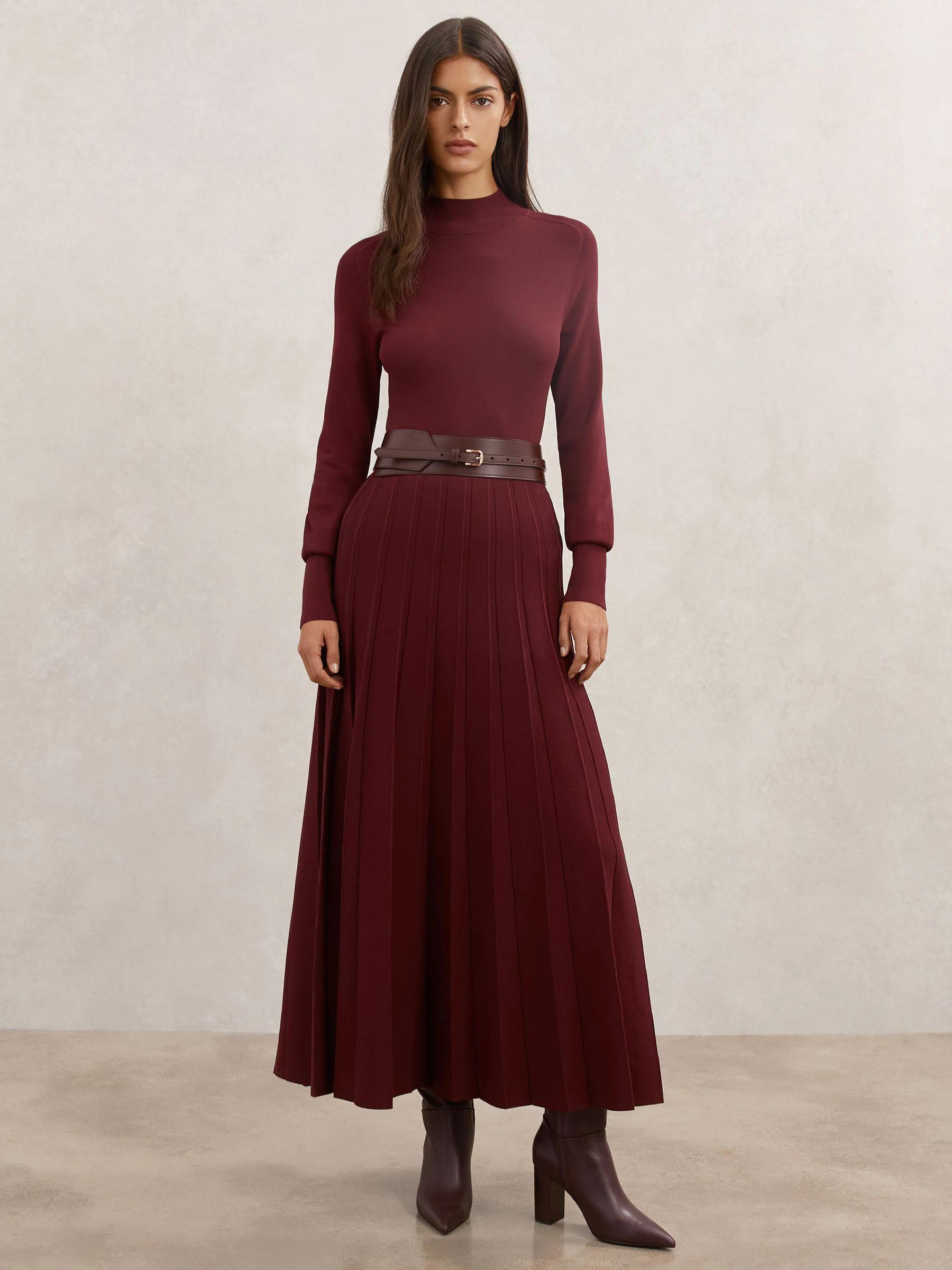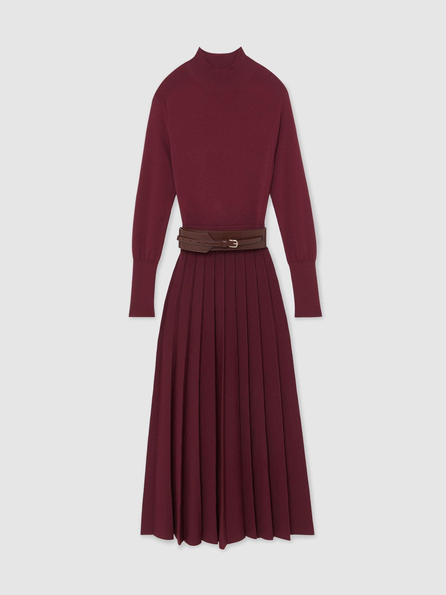 Reiss Raspberry Red Alicia Belted Knit Pleated Midi Dress