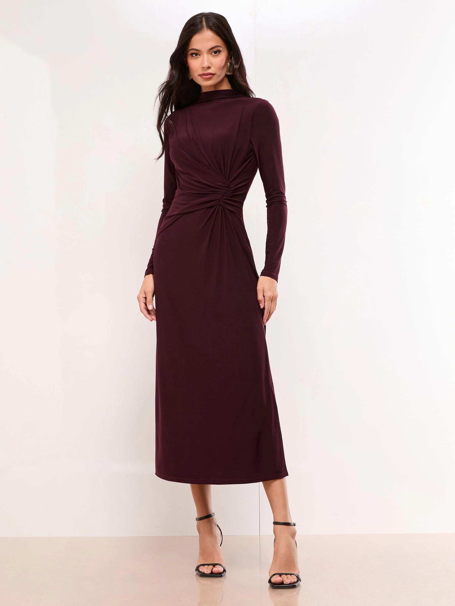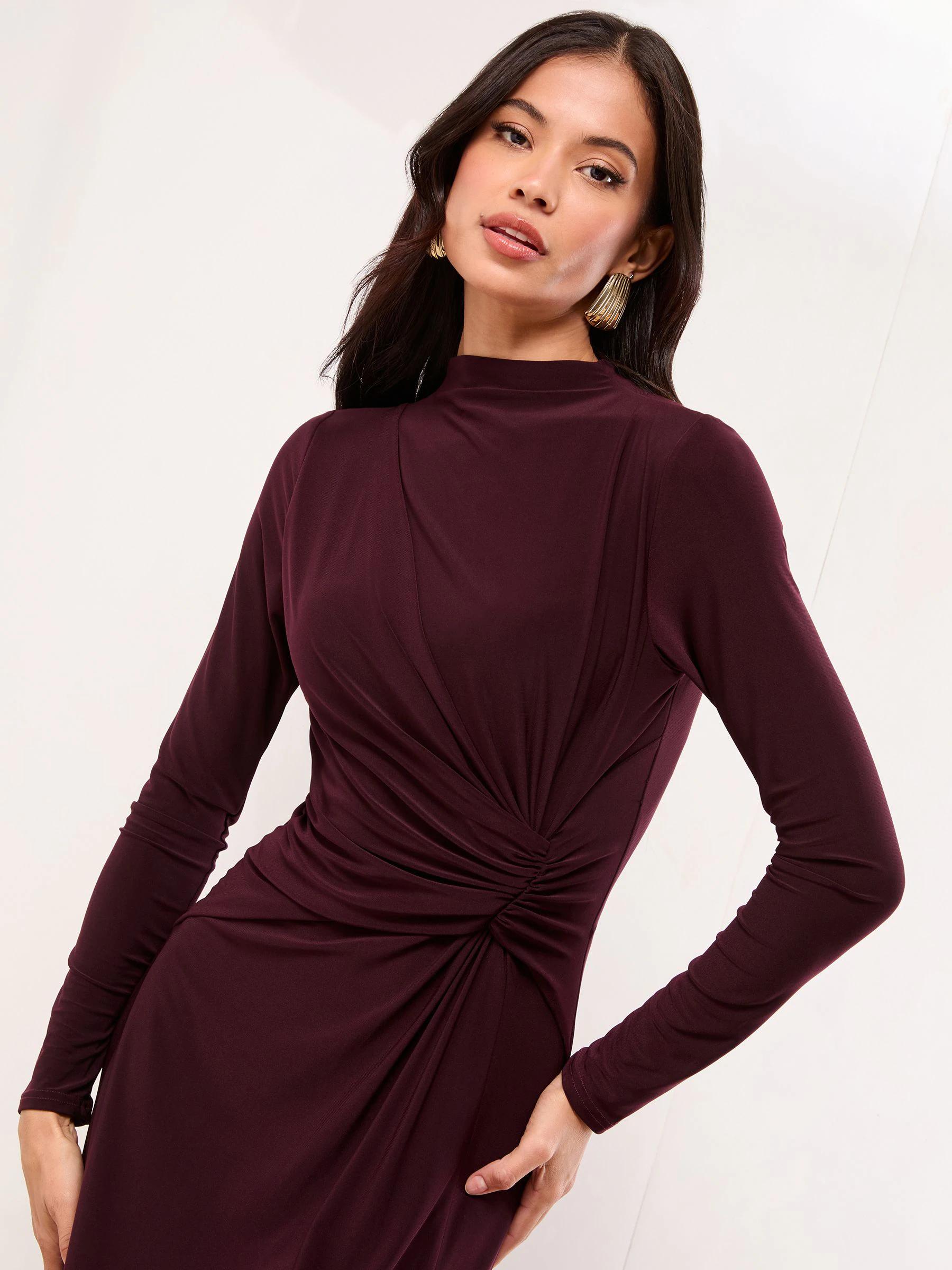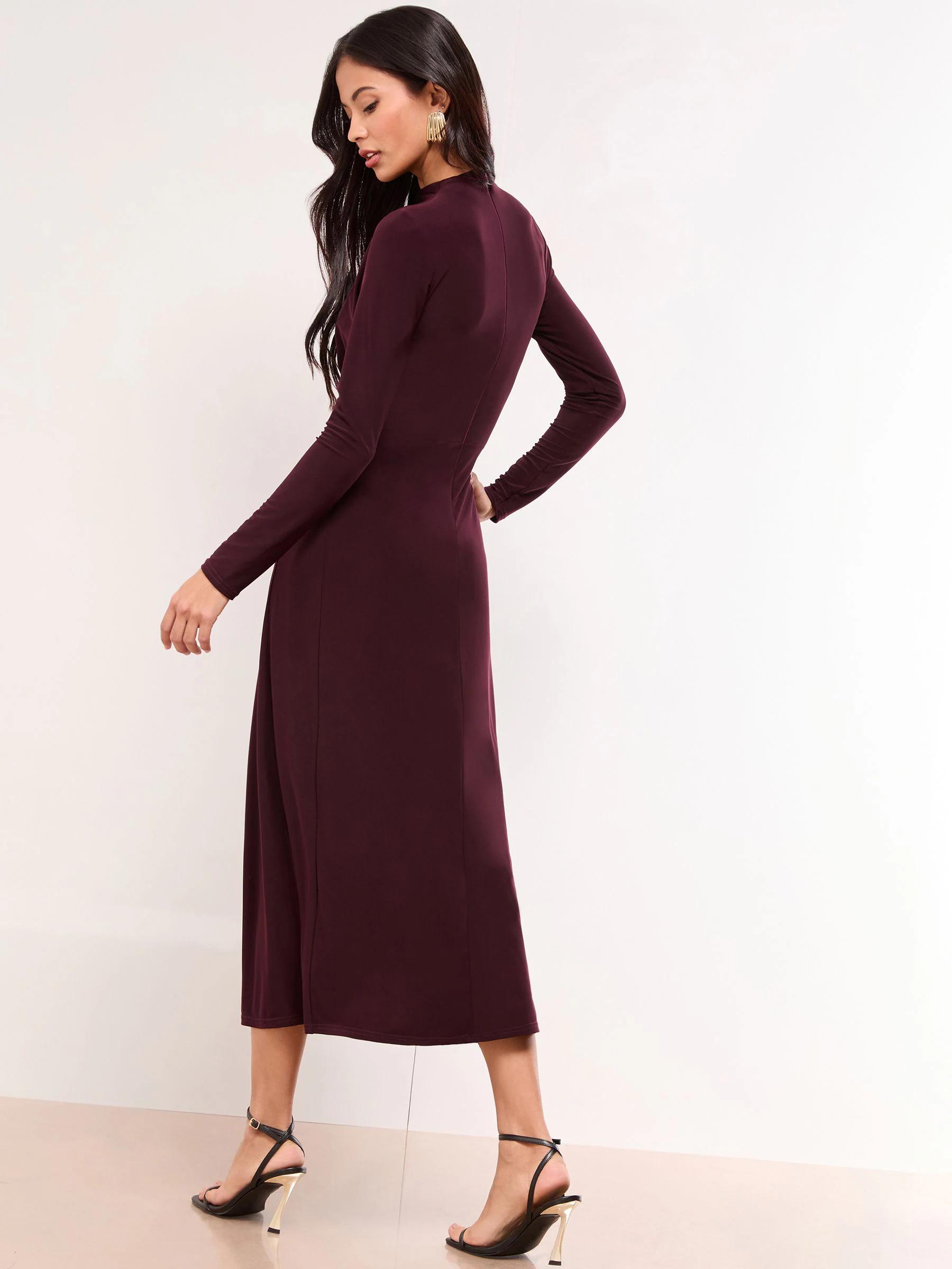 Lipsy Burgundy Red Petite Long Sleeve Jersey Knot side Midi Dress