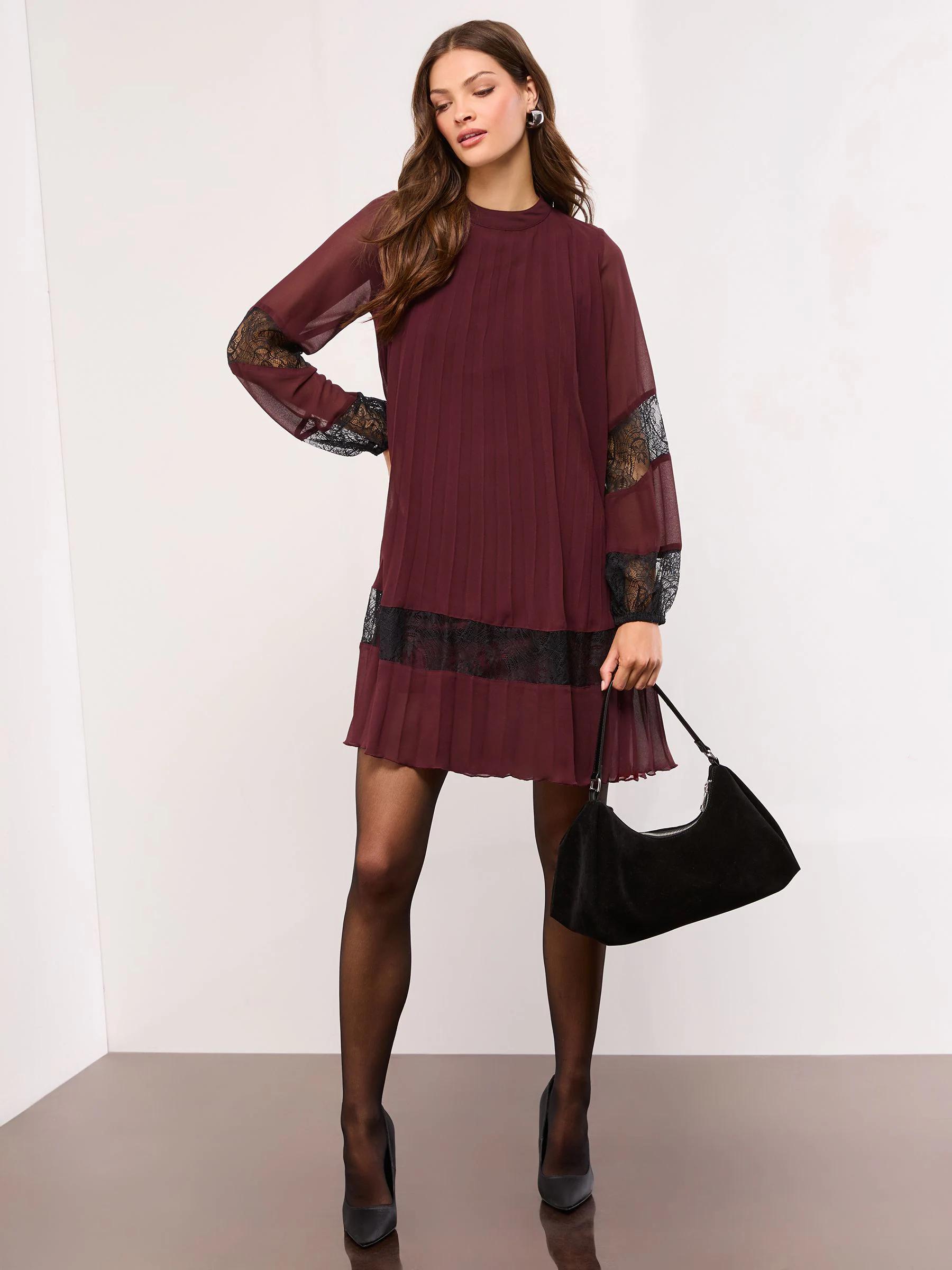 Lipsy Burgundy Red Pleated Lace Detail Mini Dress