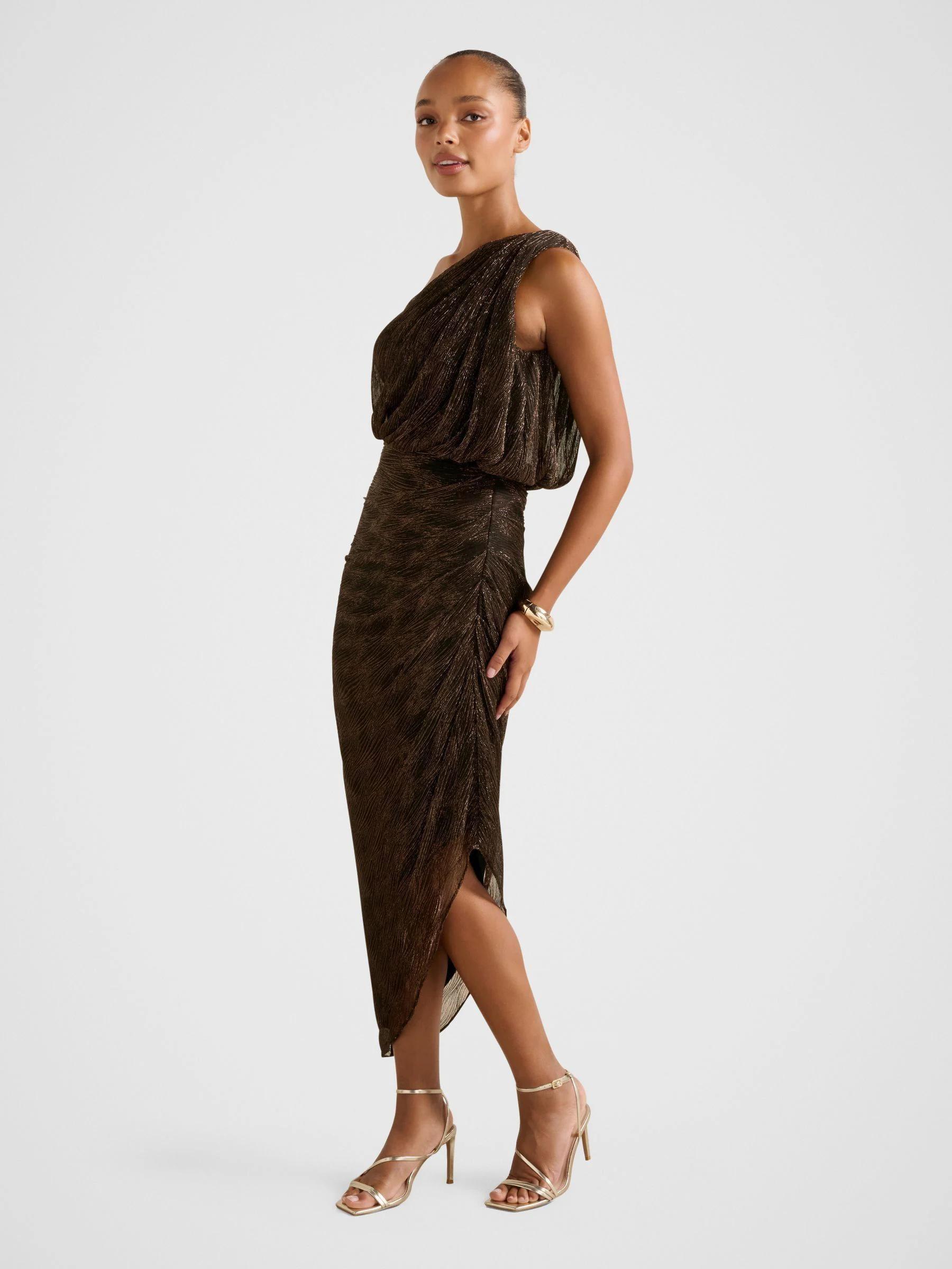 Forever New Metallic Cassidy One Shoulder Plisse Midi Dress