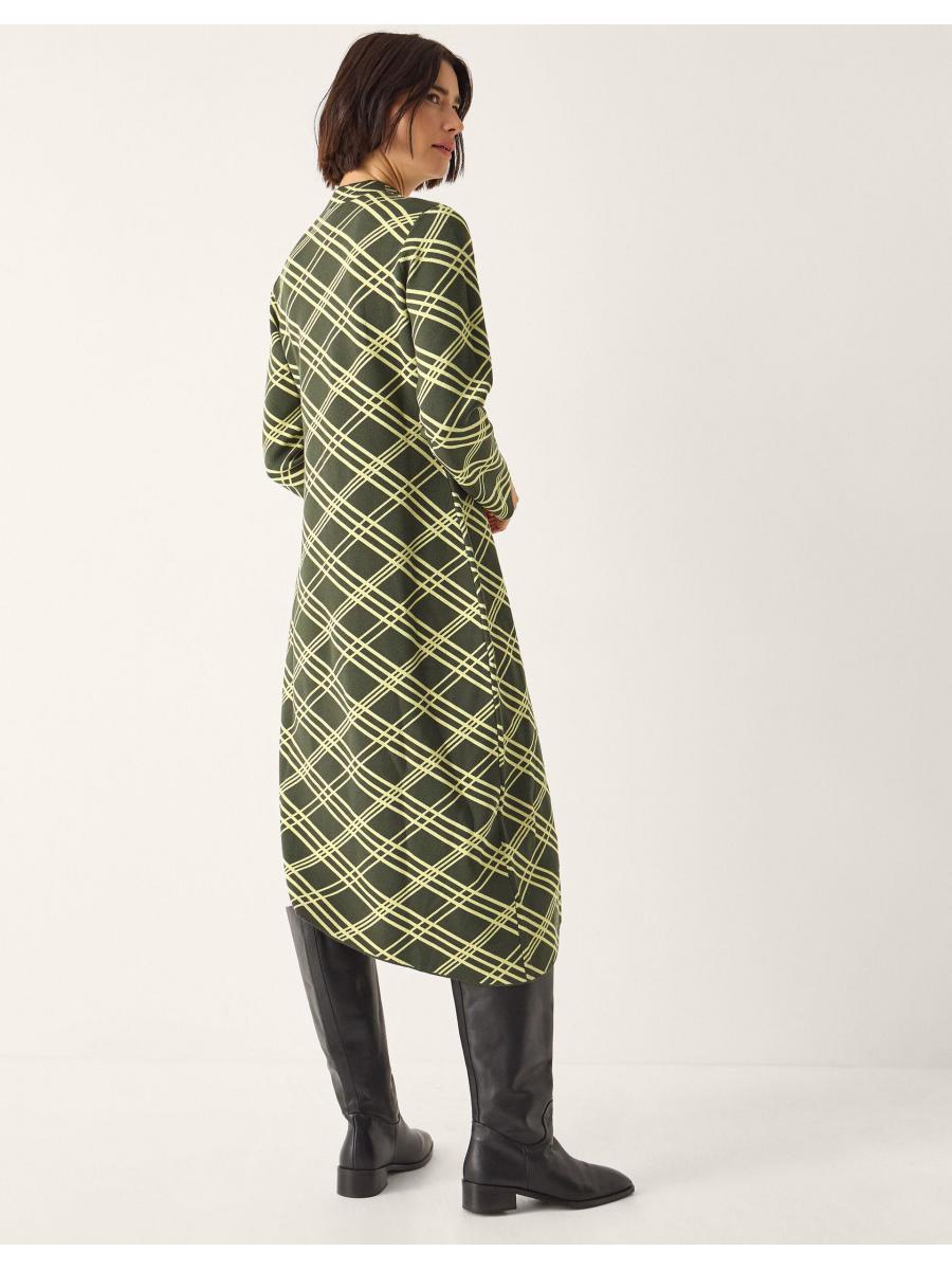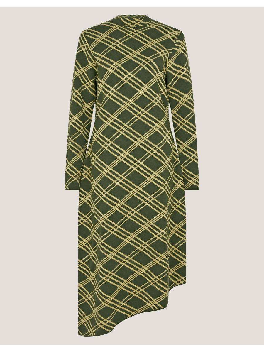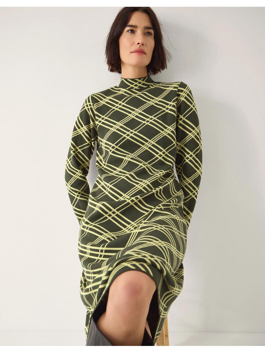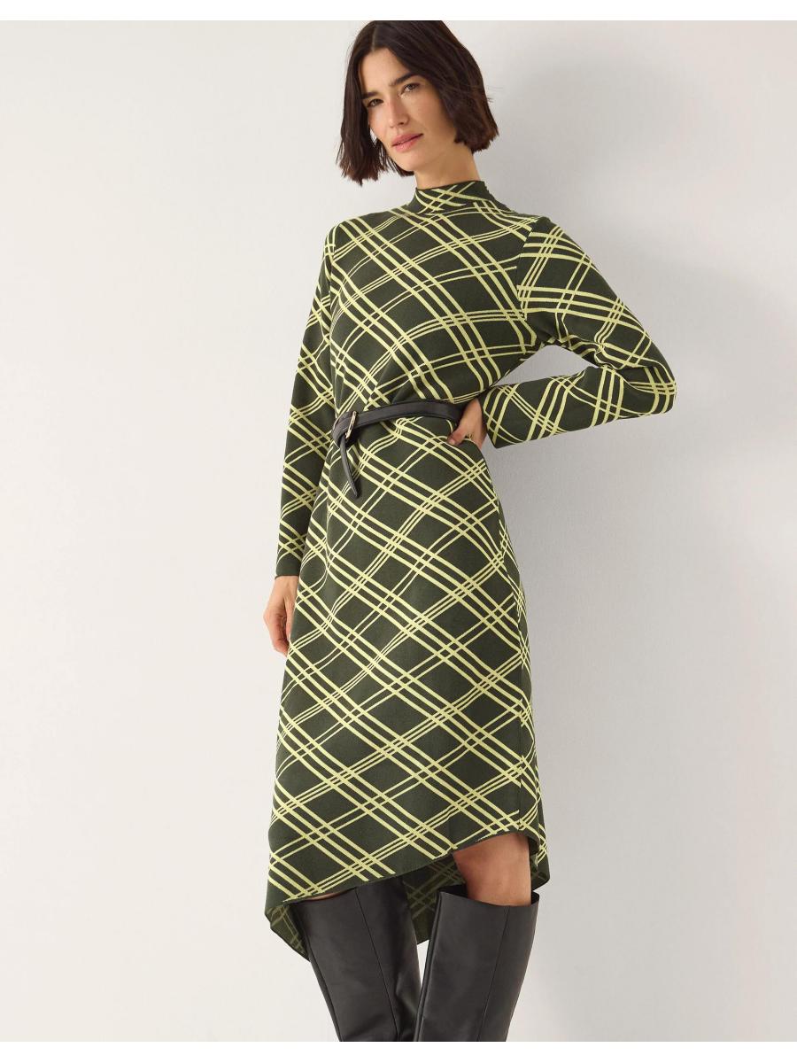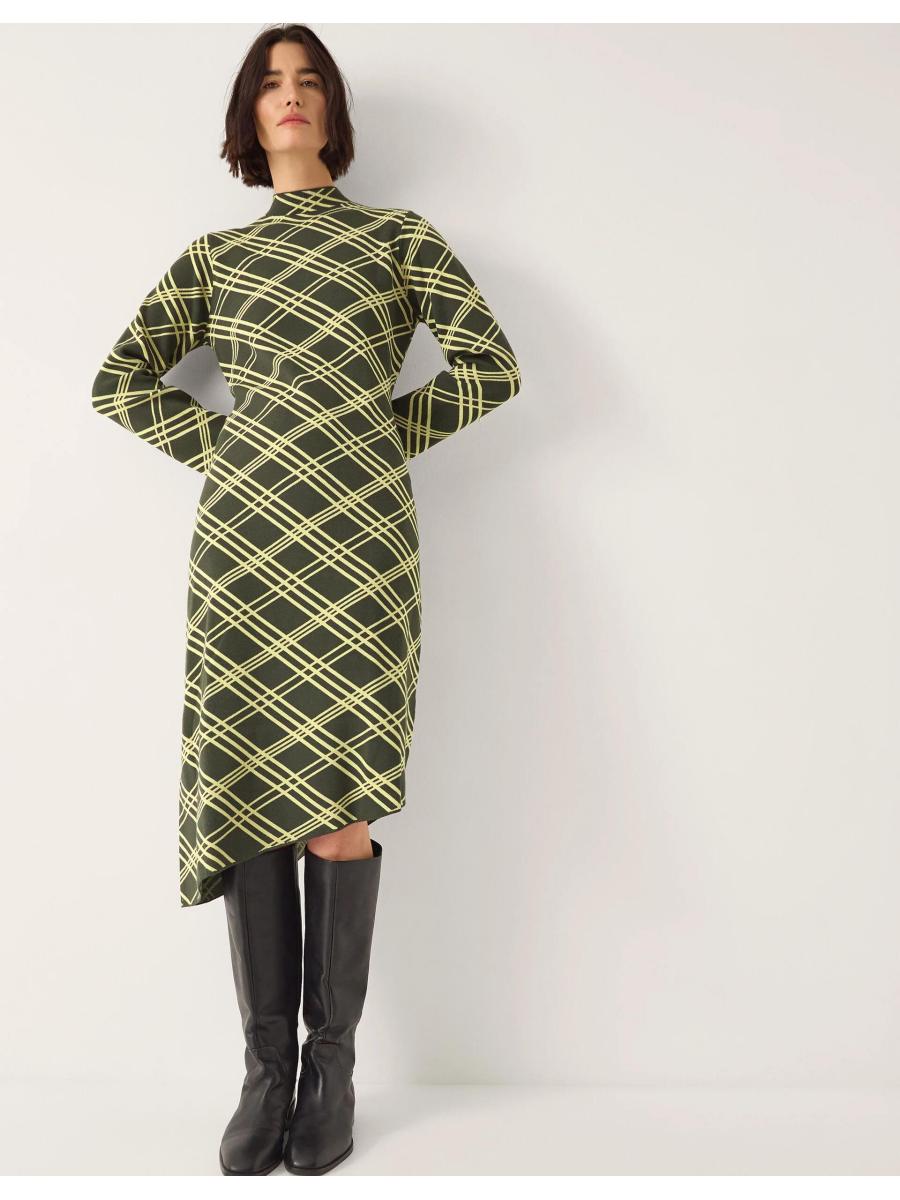 Bringing our love for the butter yellow trend into the new season, this dress showcases a striking checkered pattern over the earthy green backdrop. Knitted with a high neckline and asymmetrical hem, it makes the perfect accompaniment to knee high boots and a belt to cinch the waist. Green