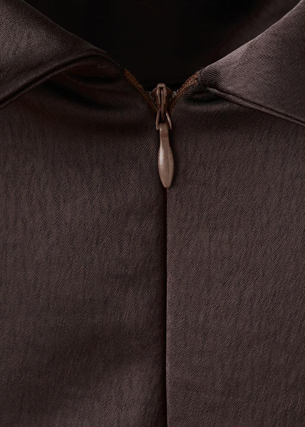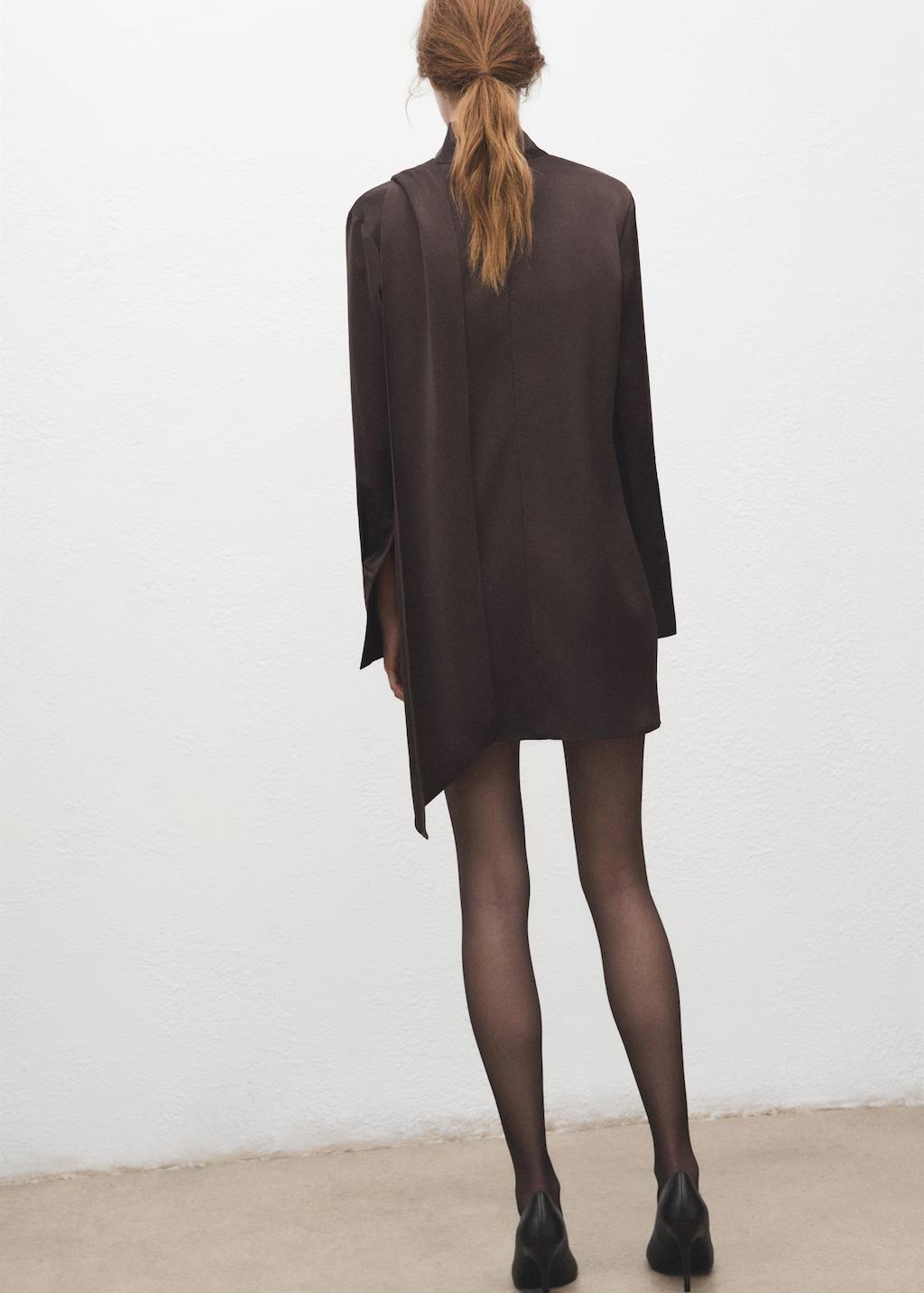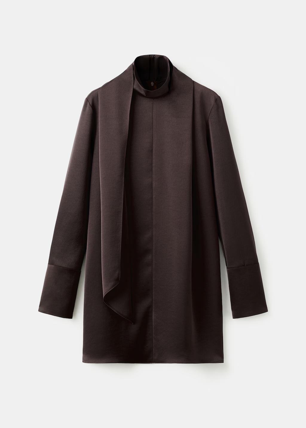 Tejido satinado. Diseño corto. Diseño recto. Cuello alto. Manga larga. Adorno de fular en el cuello. Cinturón decorativo. Cierre de cremallera en la parte posterior. Exclusivo Online. Esta prenda pertenece a nuestra colección de fiesta y evento, diseñada para elevar tus looks en ocasiones especiales