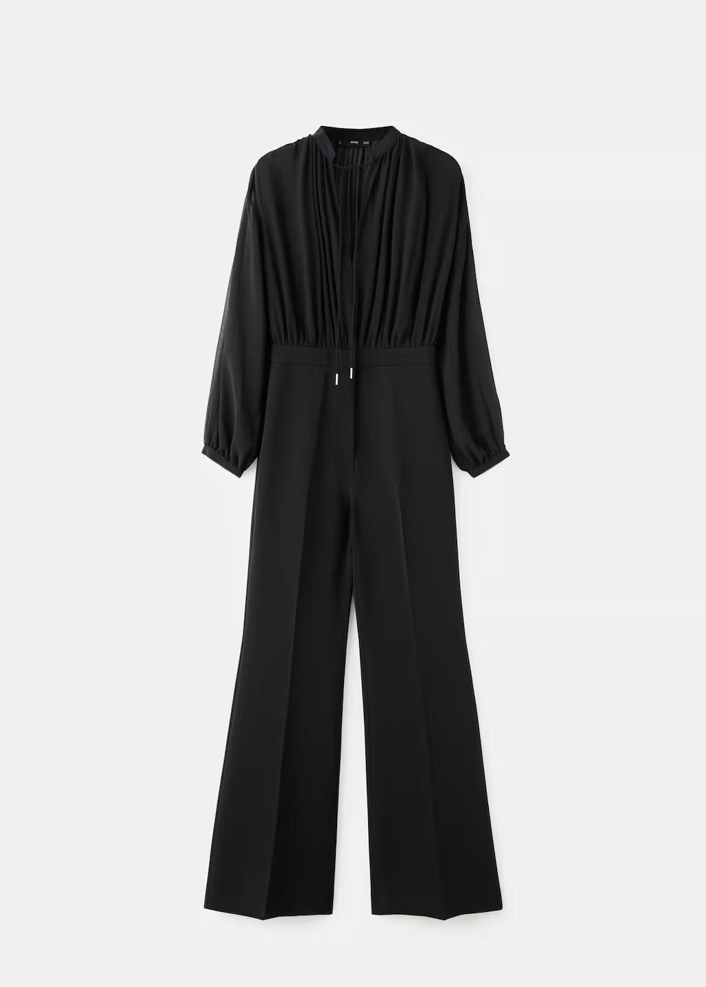Tejido combinado. Diseño largo. Diseño recto. Cuello de pico. Manga larga. Cierre de lazo en el cuello. Cierre oculto de botón, gancho y cremallera. Esta prenda pertenece a nuestra colección de fiesta y evento, diseñada para elevar tus looks en ocasiones especiales