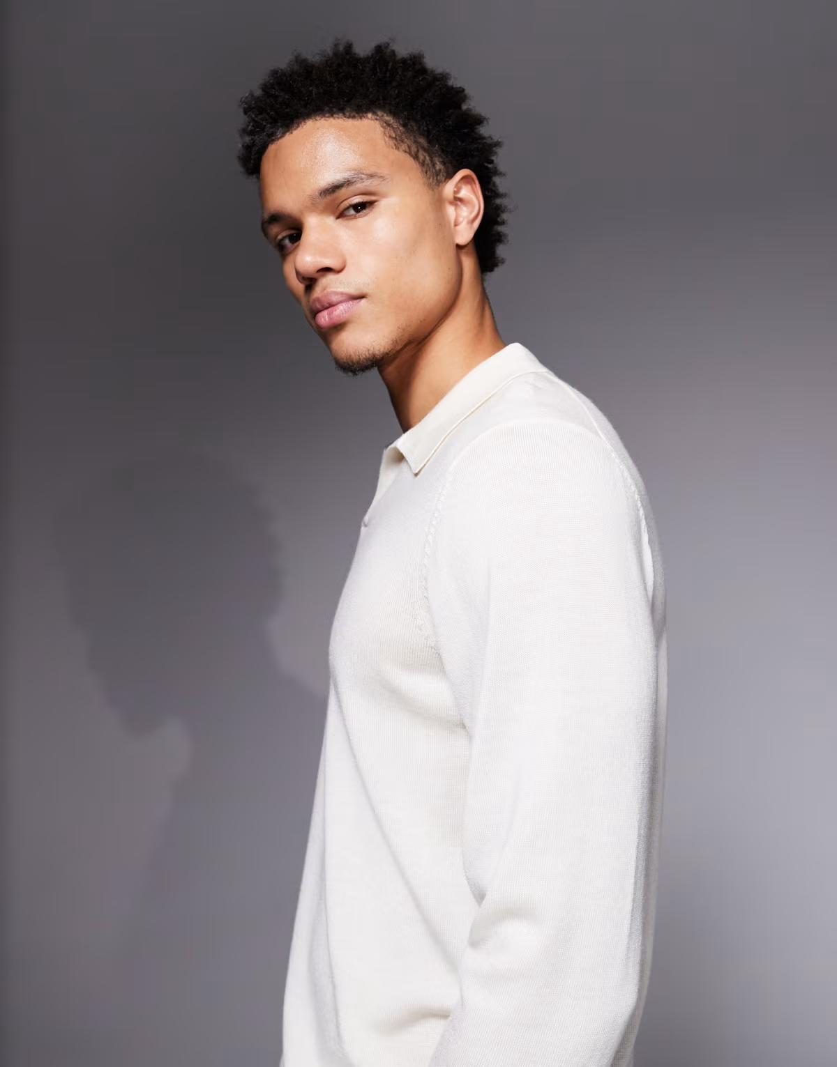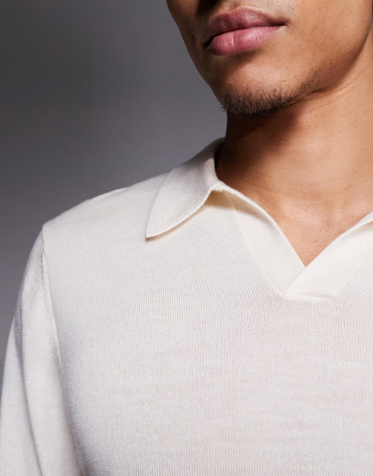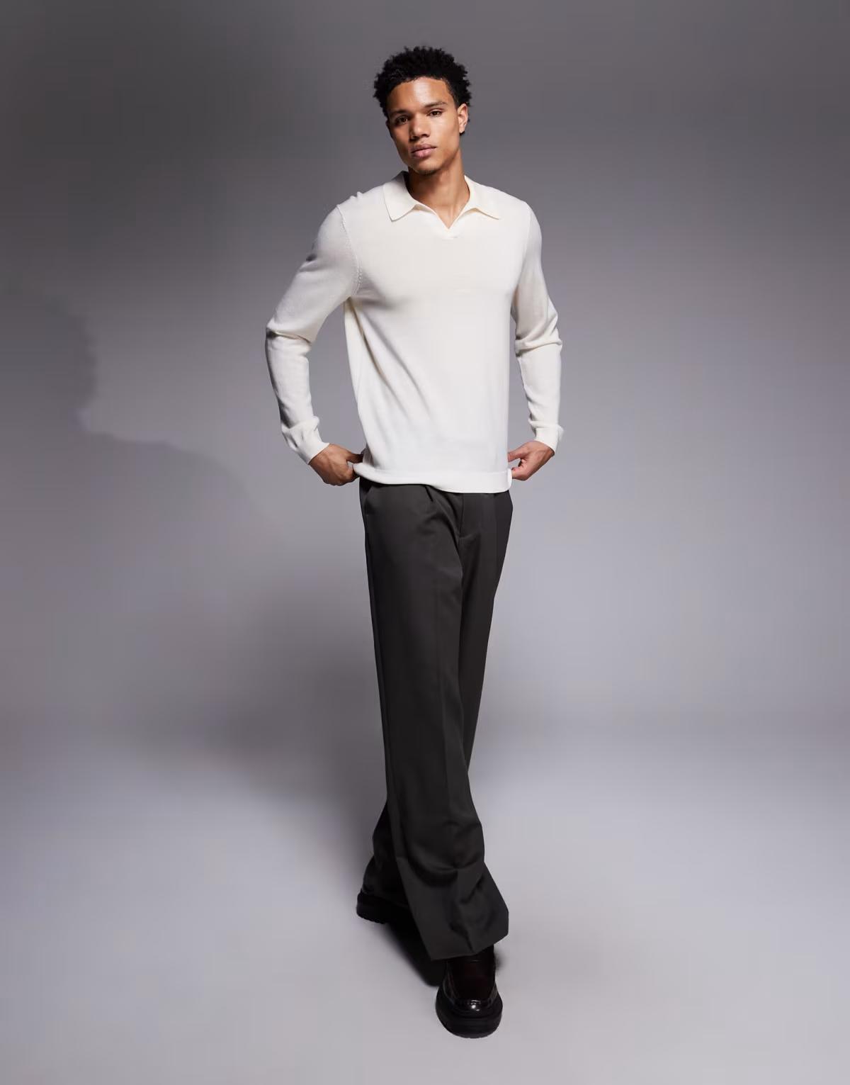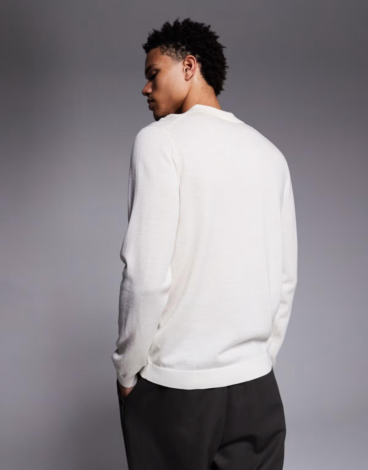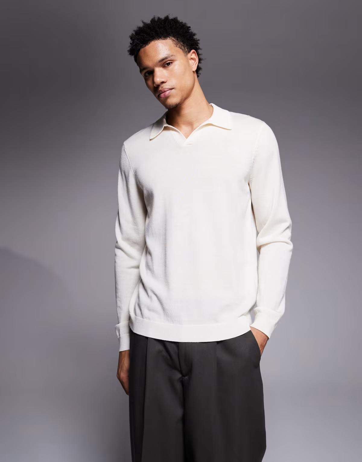 ASOS DESIGN knitted long sleeve pure merino wool notch neck polo in ecru