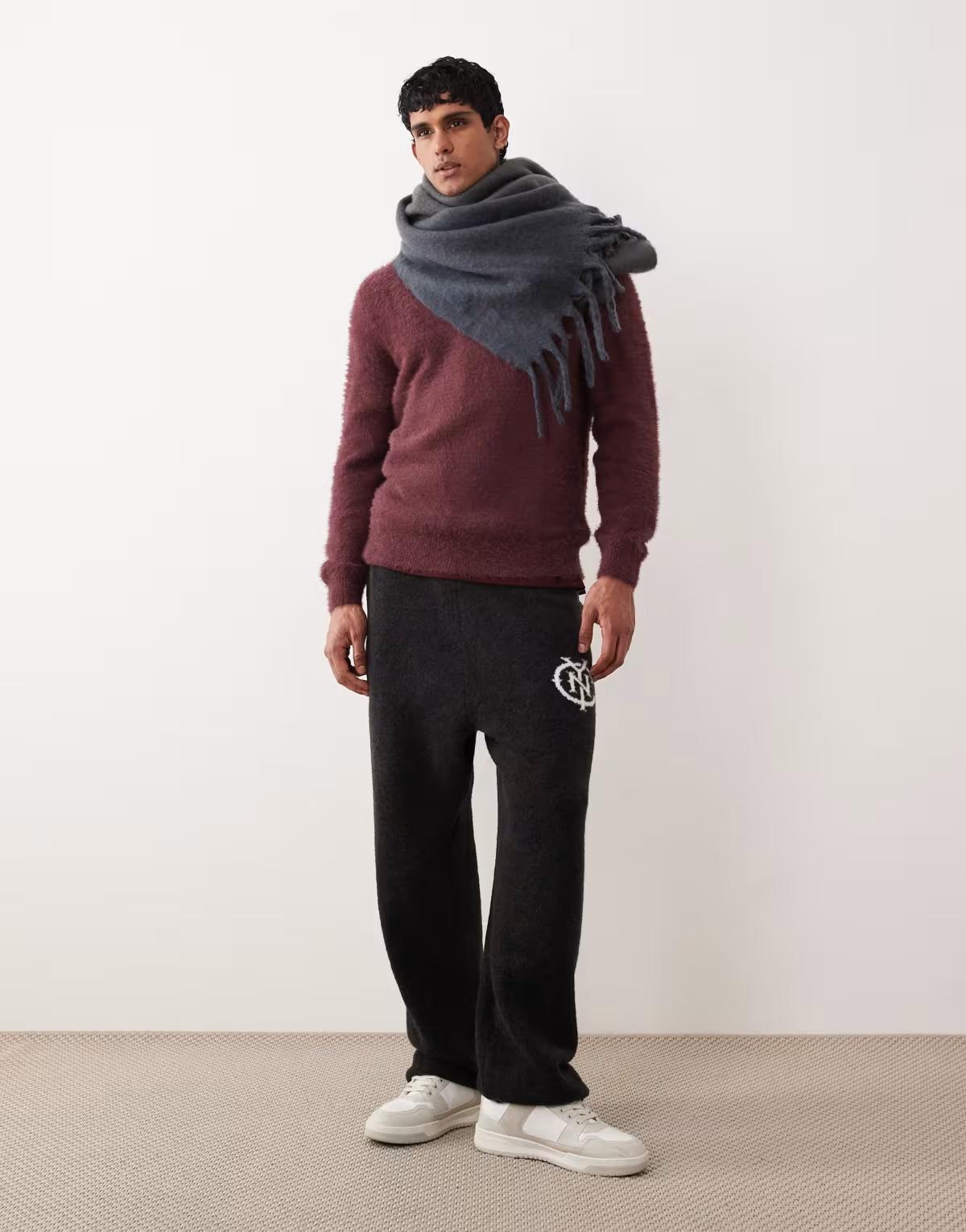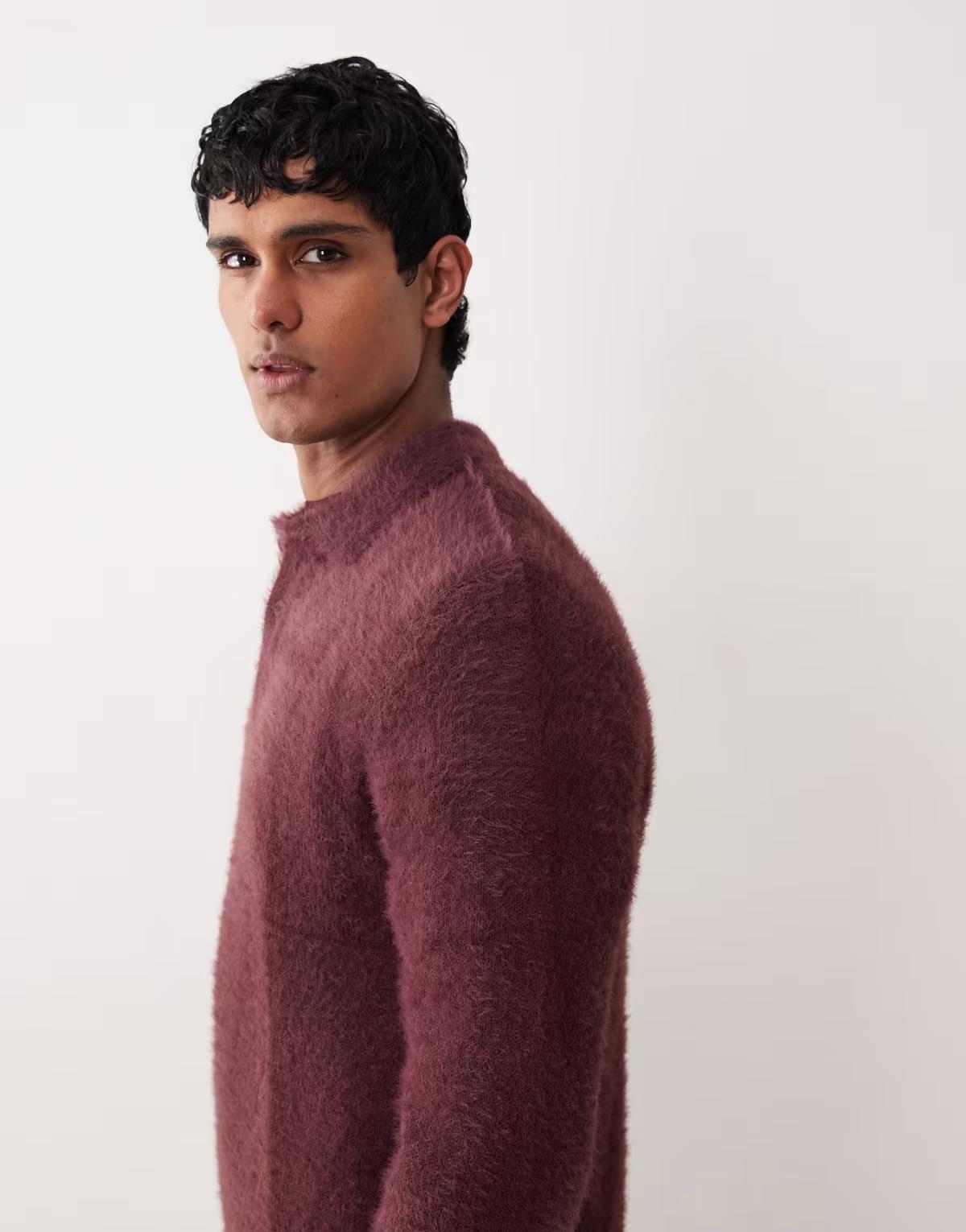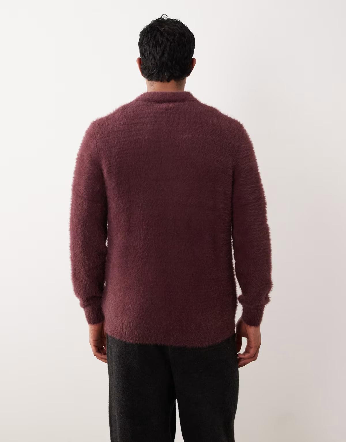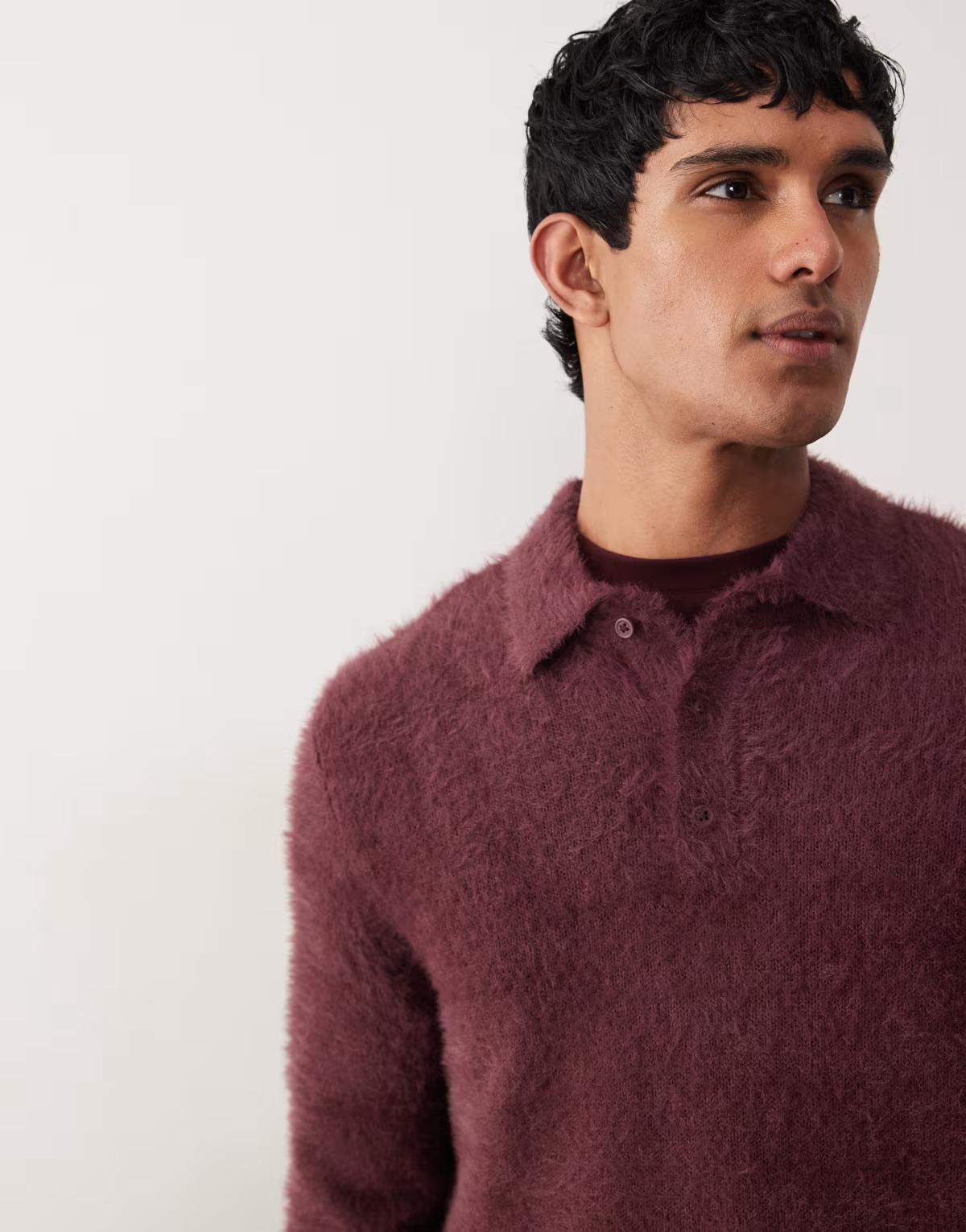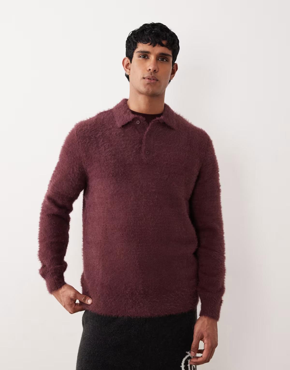 ASOS DESIGN knitted fluffy polo jumper in burgundy