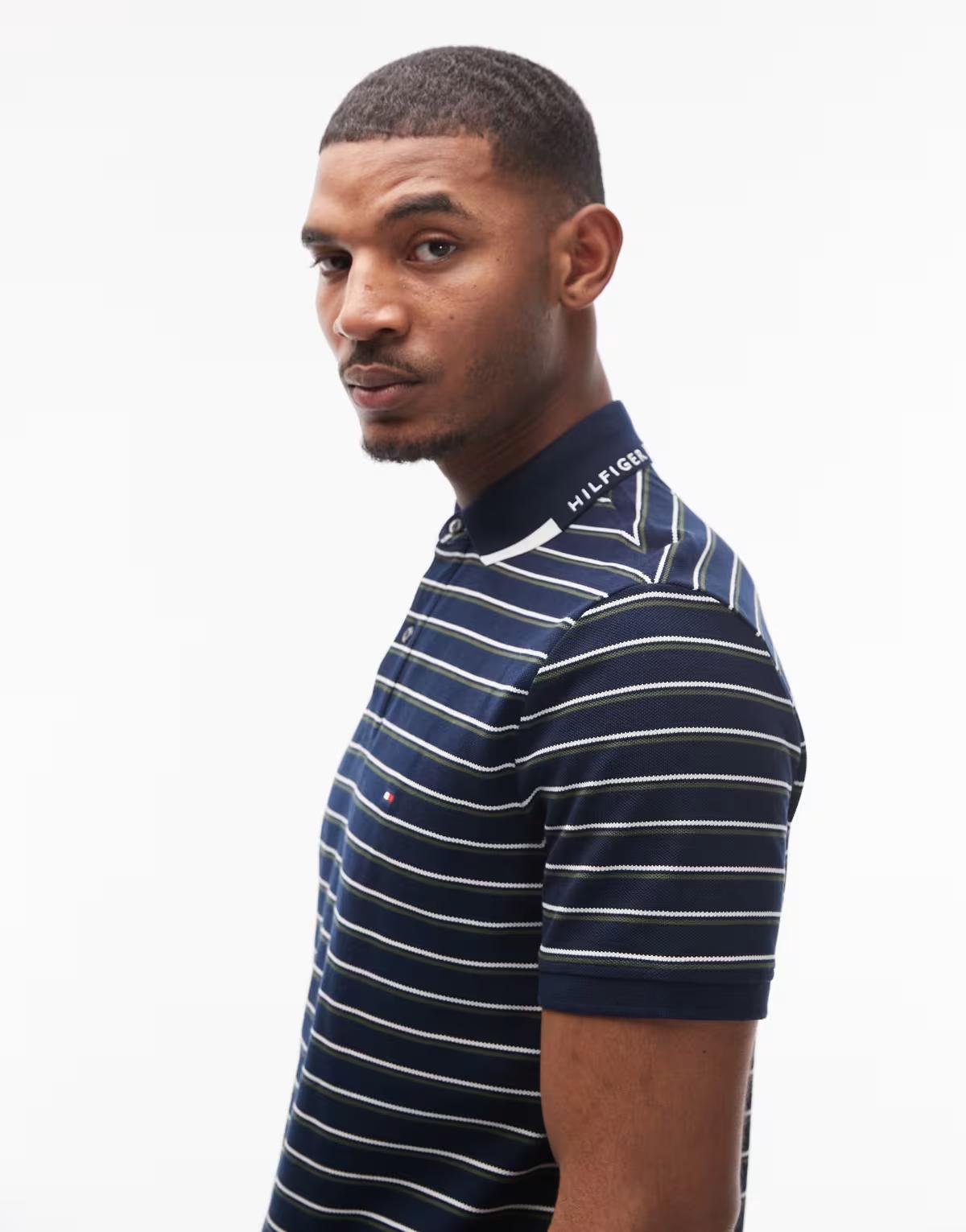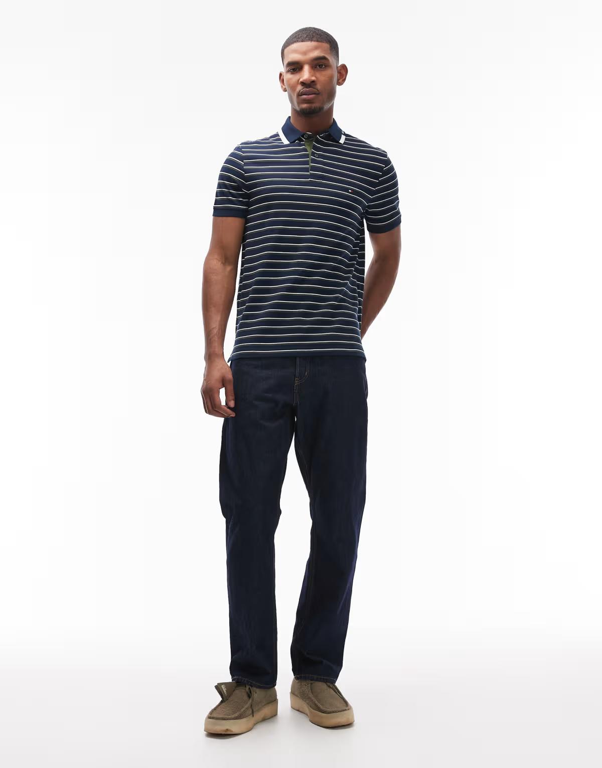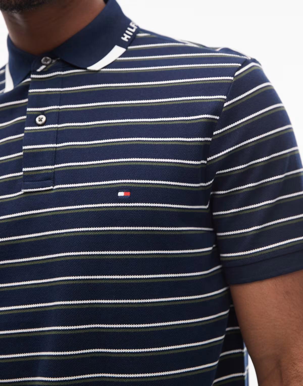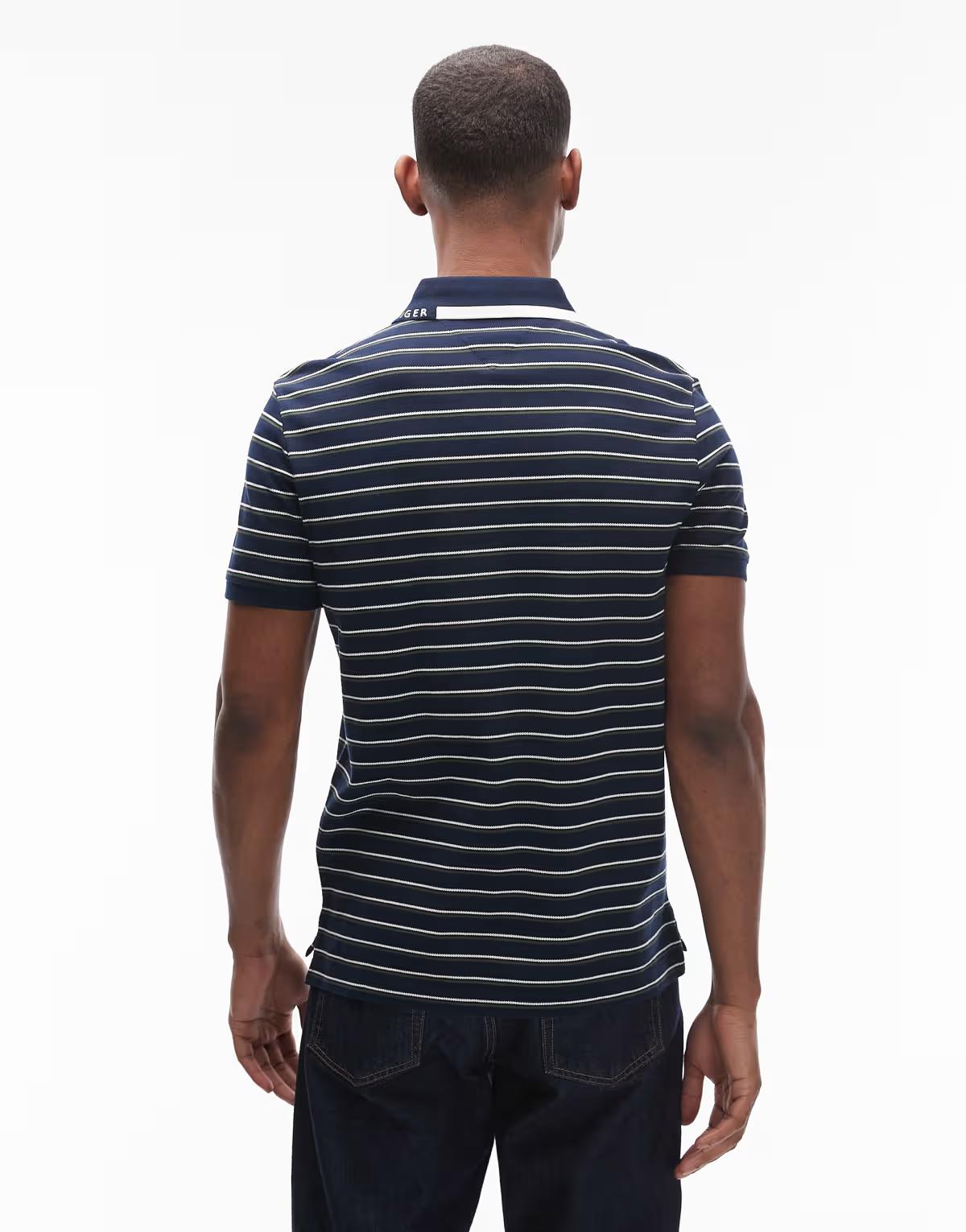 Tommy Hilfiger stripe polo shirt chest logo in navy and white