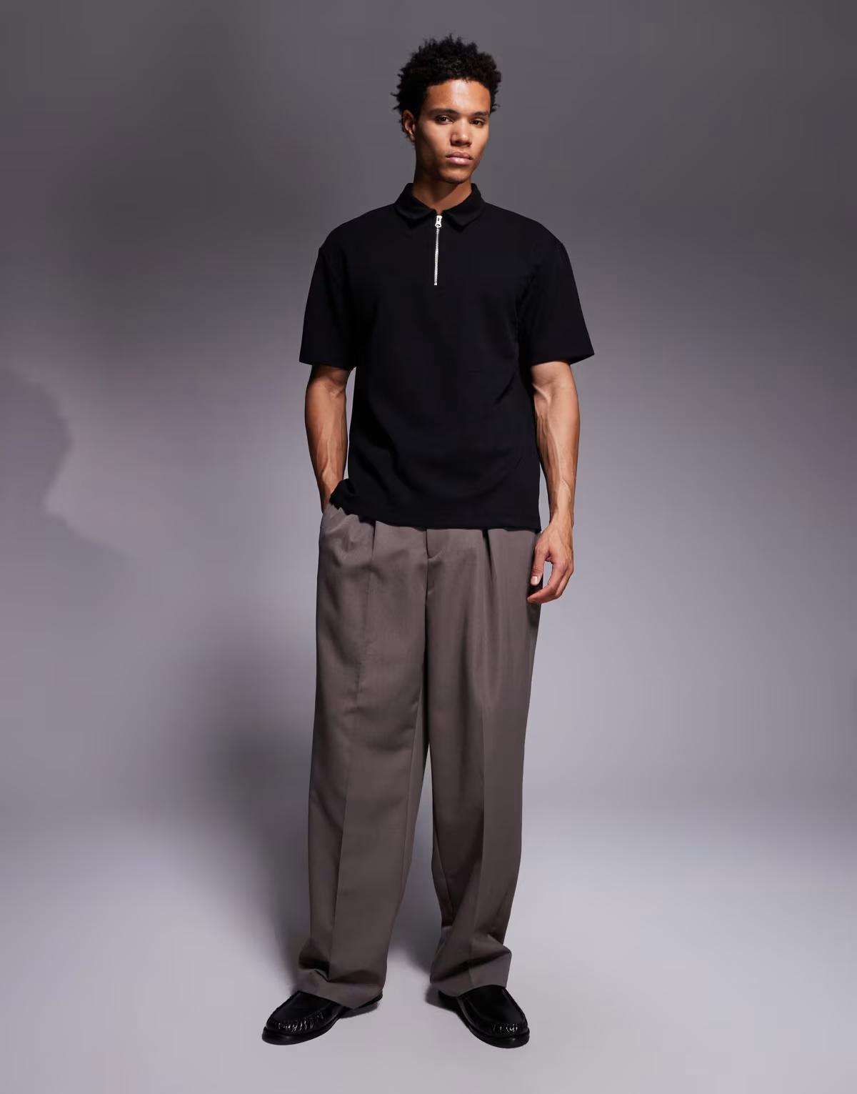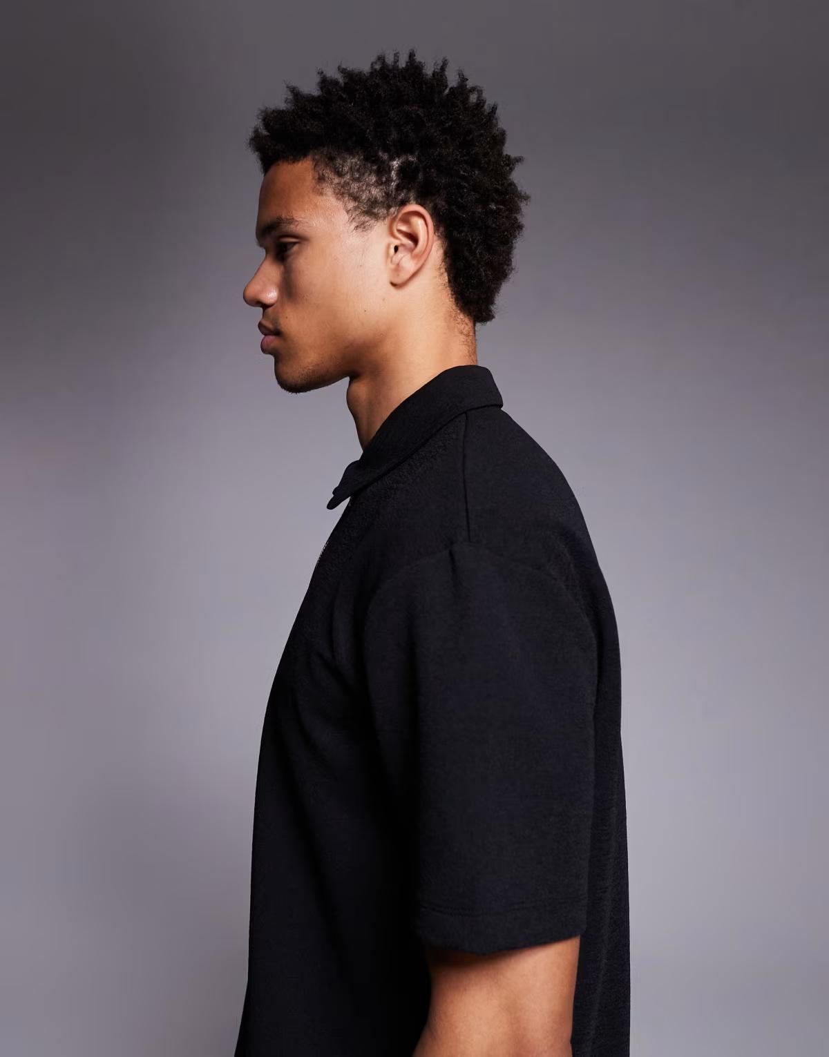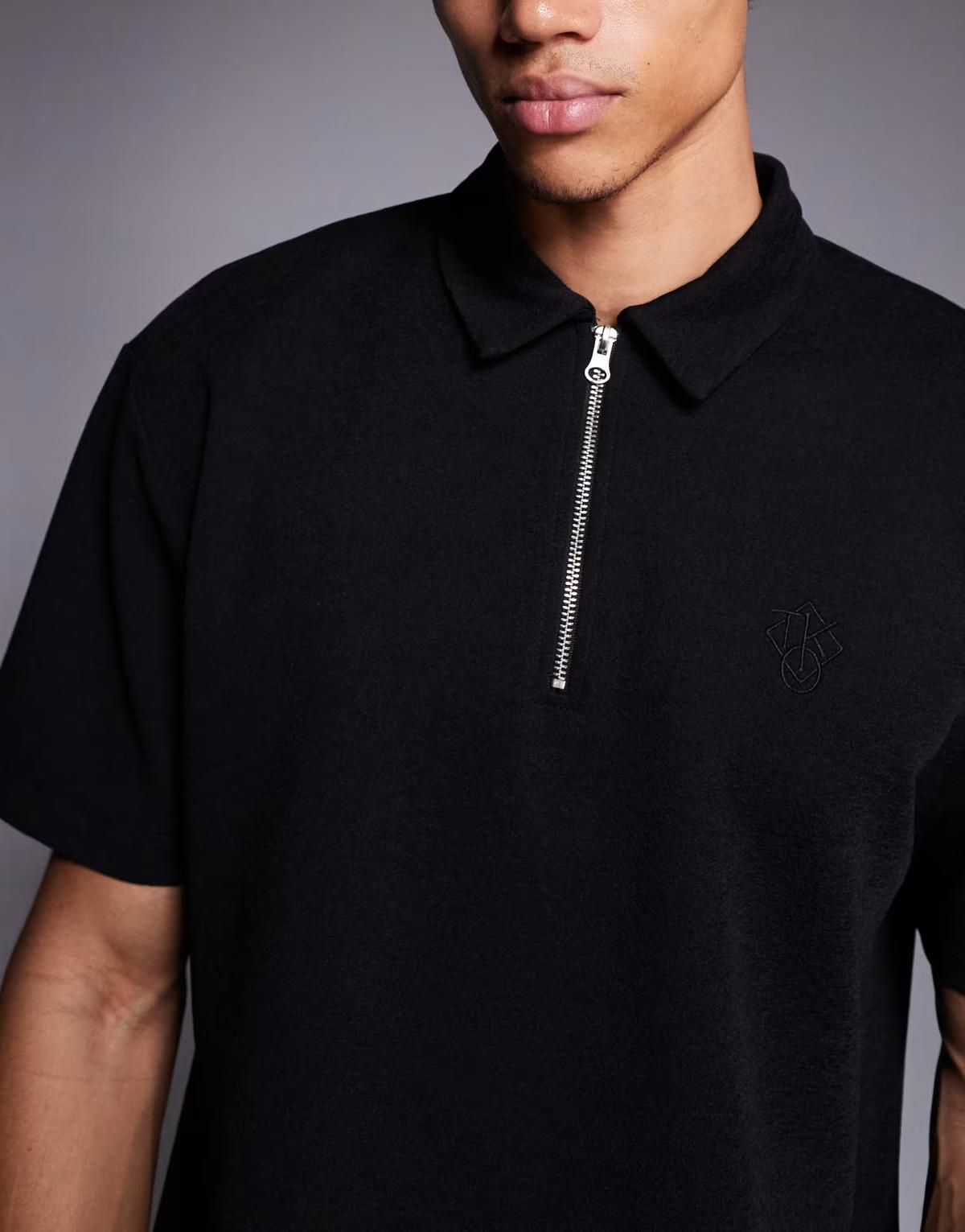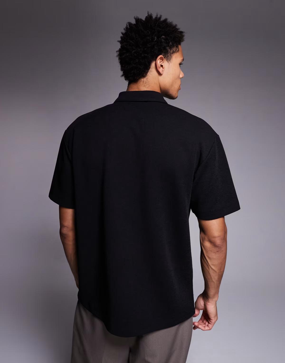 ASOS DESIGN heavyweight relaxed polo with chest sign off in black texture