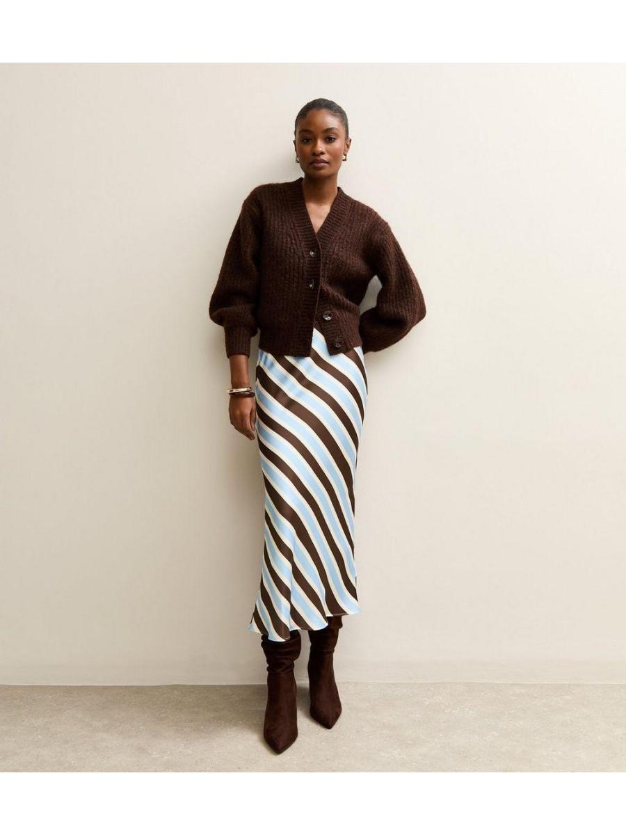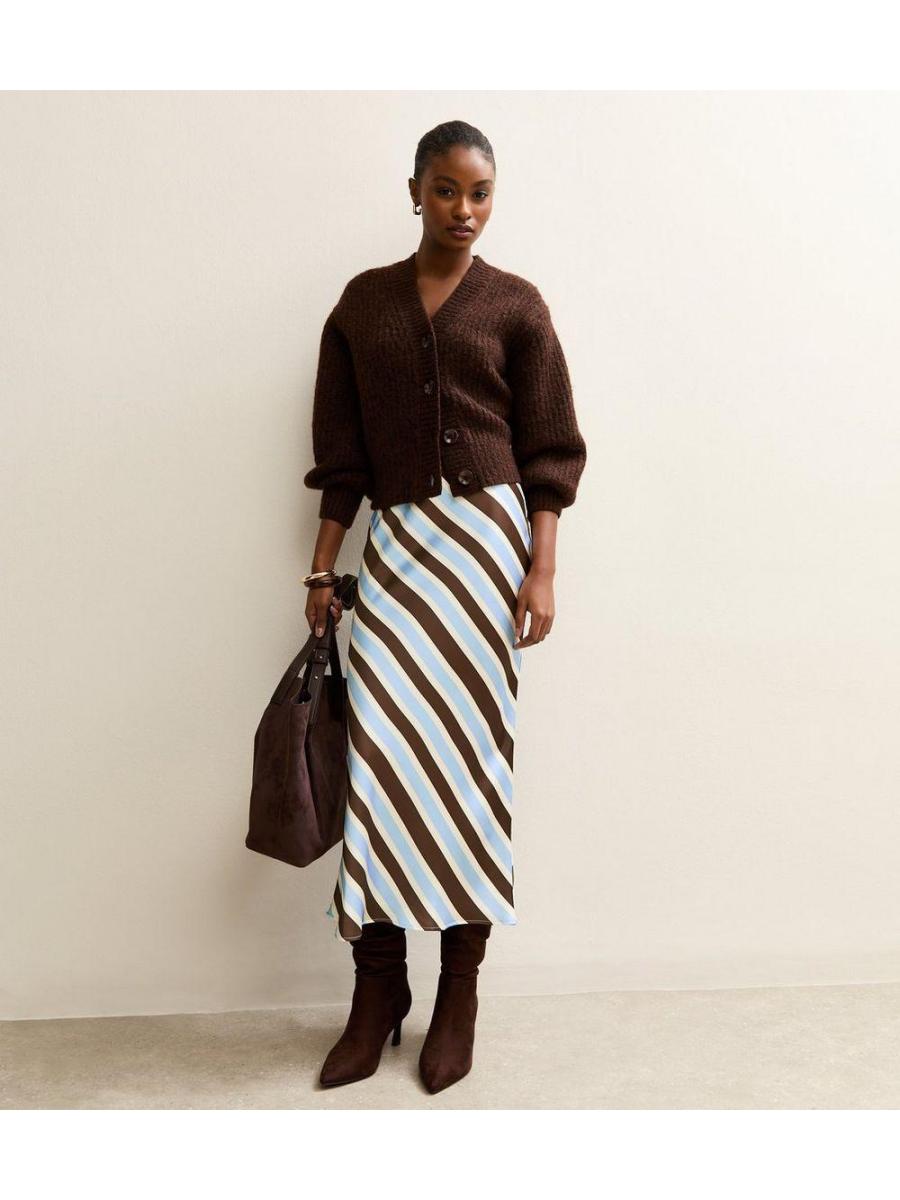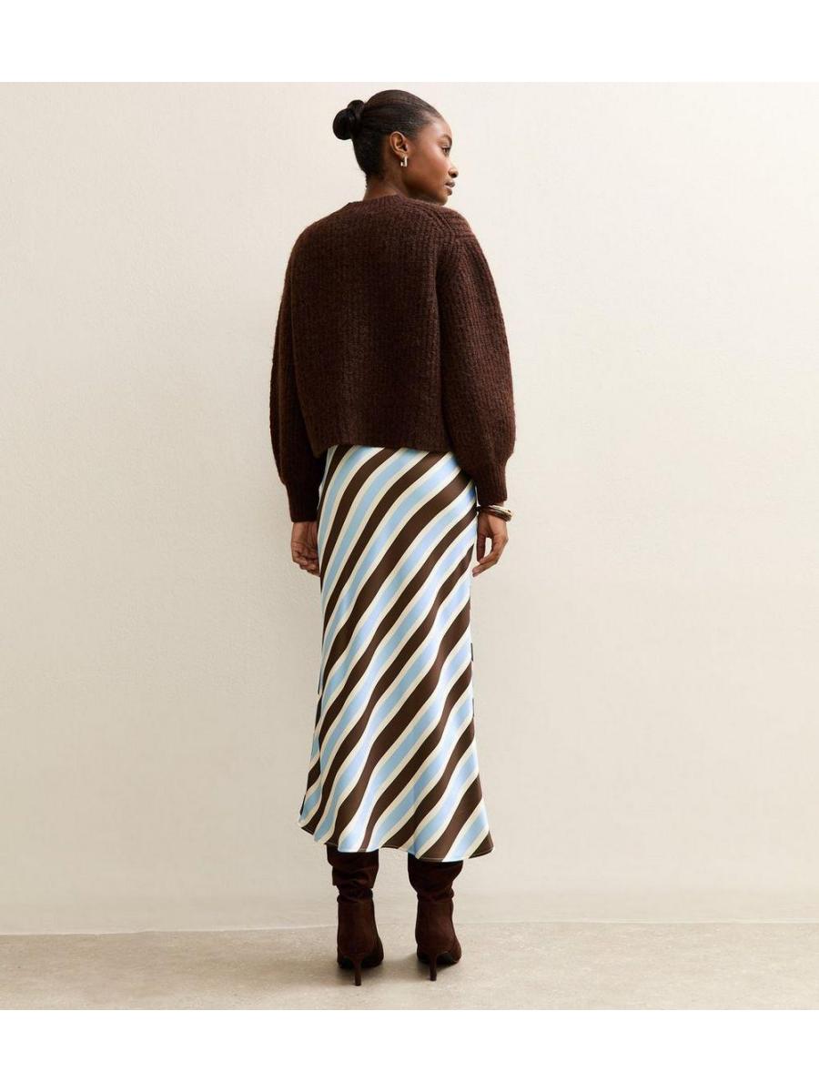 Brown Satin Striped Bias Cut Midi Skirt
