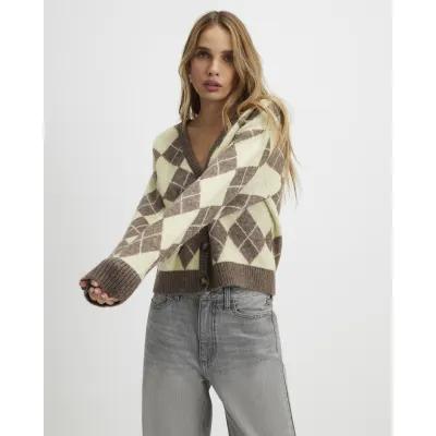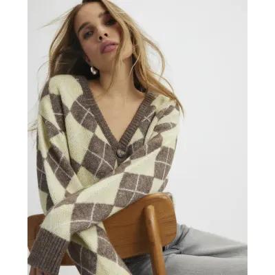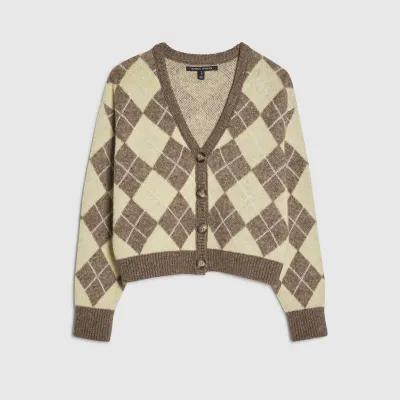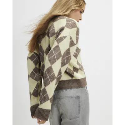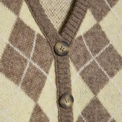 Yellow Knitted Argyle Long Sleeve Cardigan