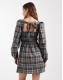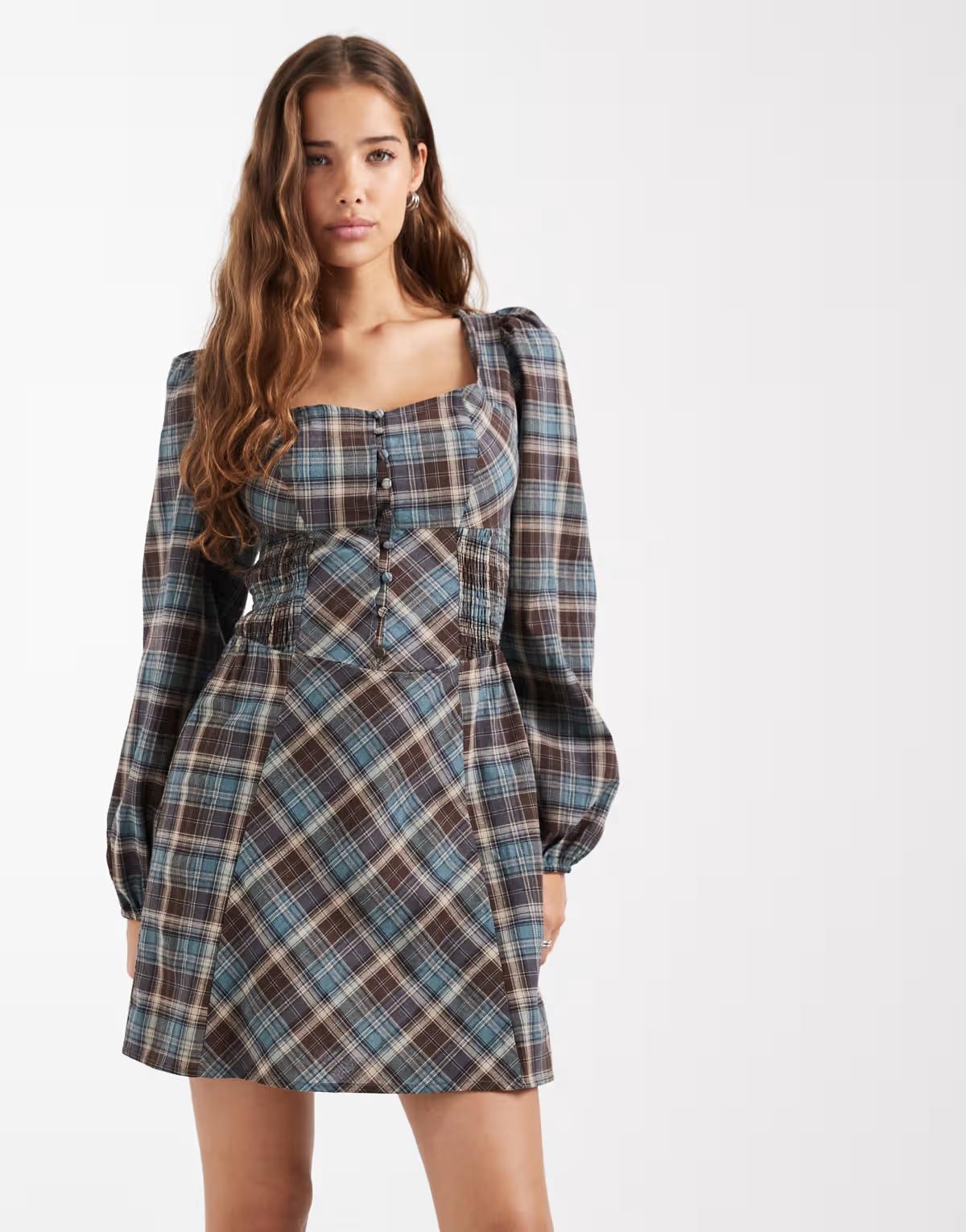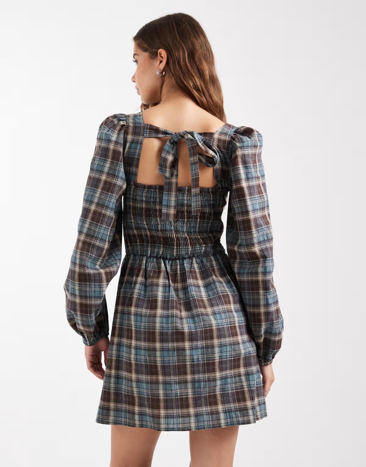 Daisy Street puff sleeve shirred mini dress in brown blue check