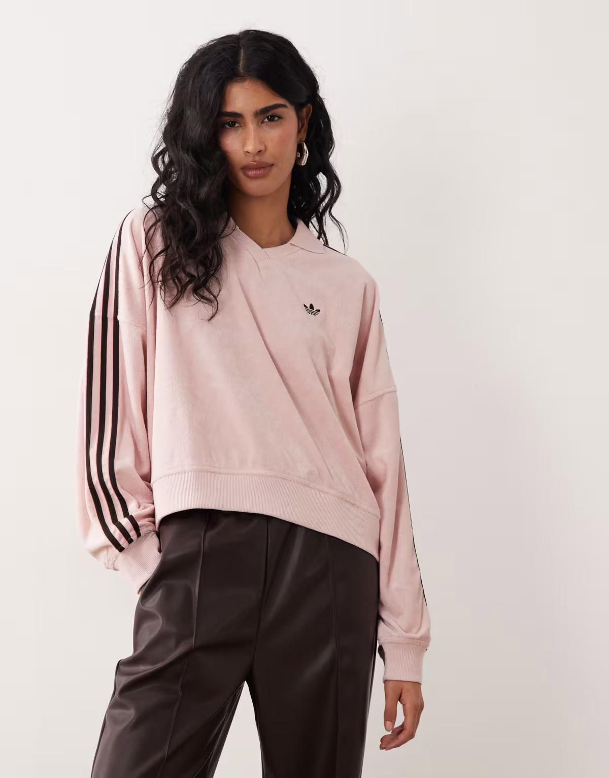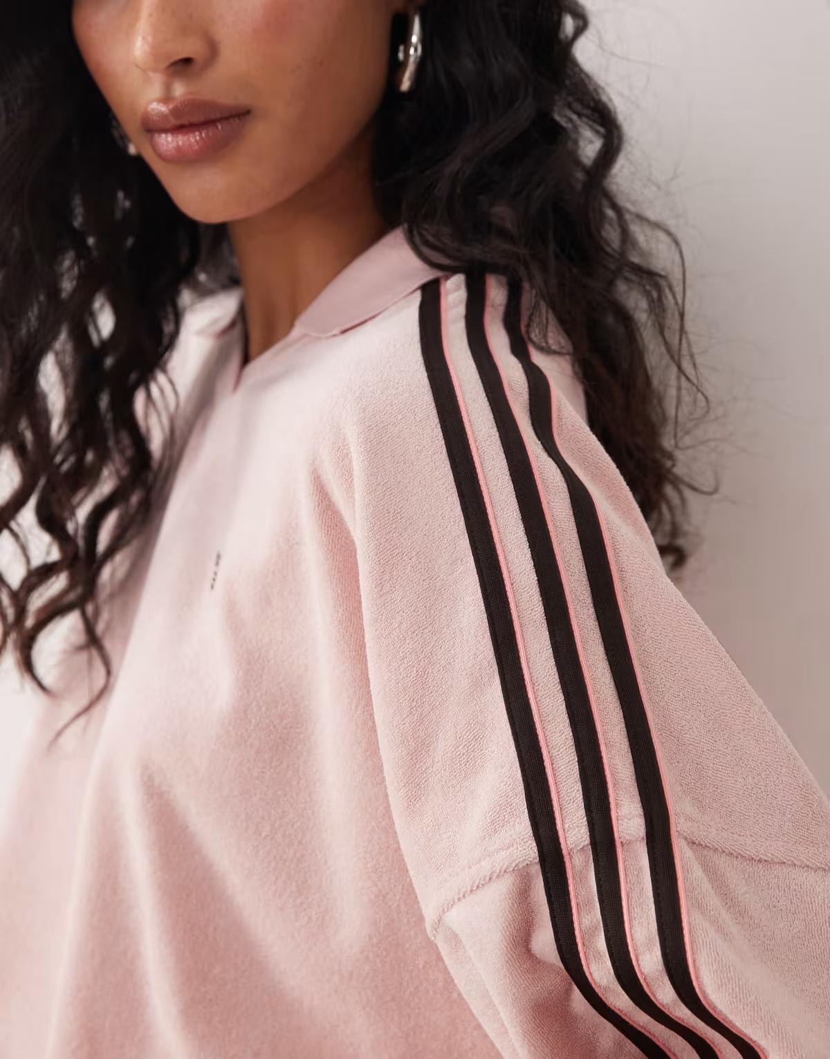 adidas Originals Terry towel v neck long sleeves polo shirt in sandy pink