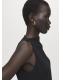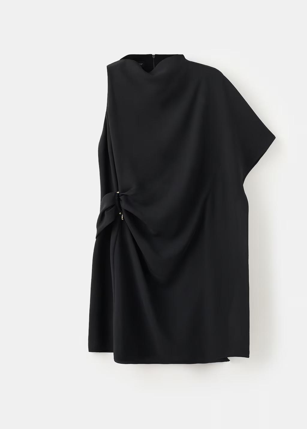 Diseño recto. Diseño corto. Manga corta. Mangas asimétricas. Detalle metálico en la cintura. Cuello drapeado. Cierre de cremallera en la parte posterior