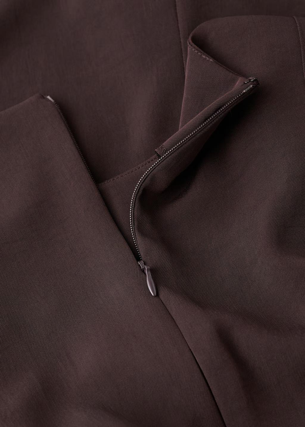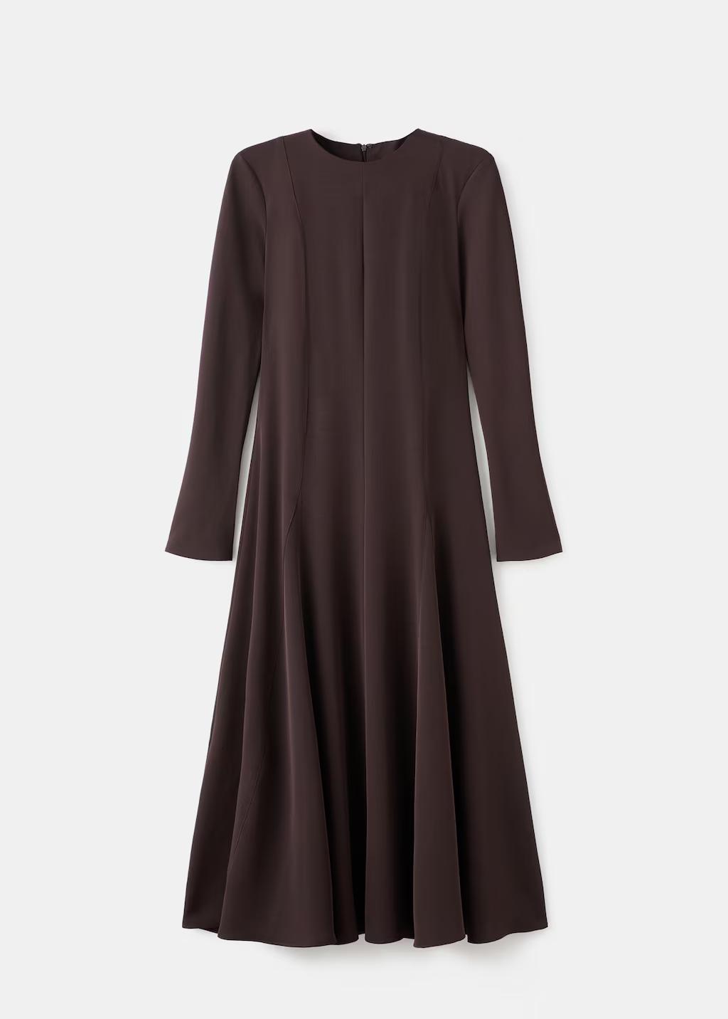 Diseño midi. Diseño evasé. Cuello redondo. Manga larga. Detalle godets. Cierre de cremallera en la parte posterior