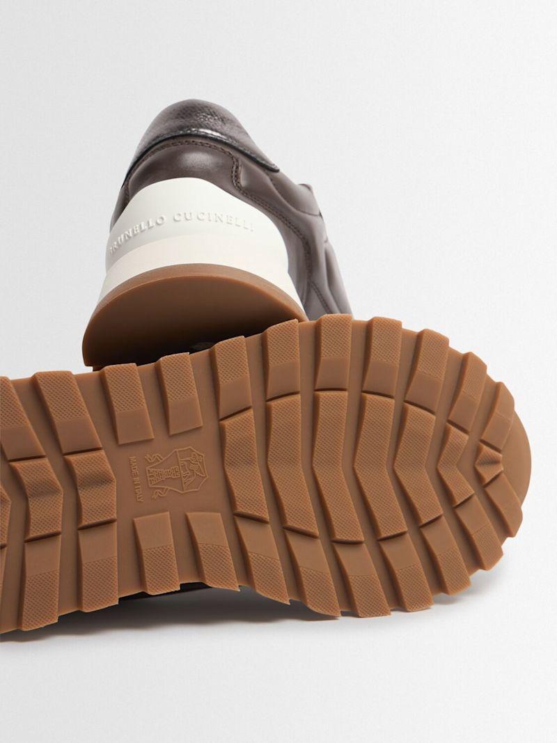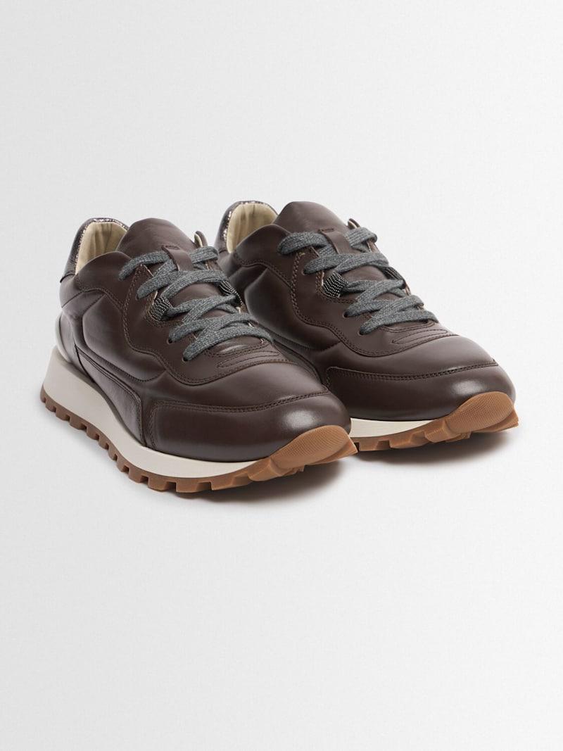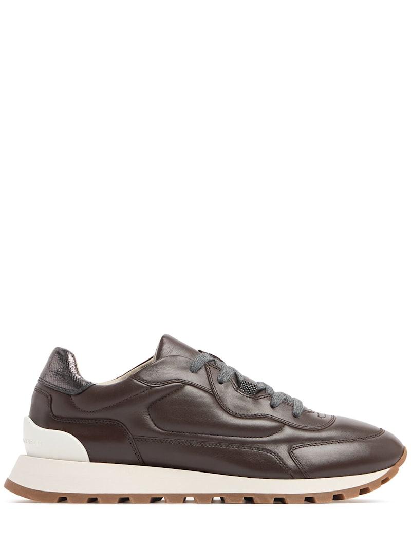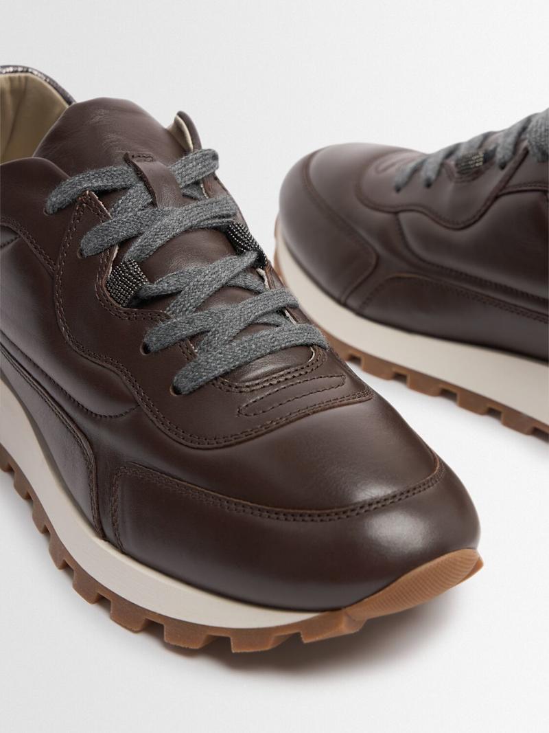 皮革系带运动鞋 - 深棕色 - 女士 - Brunello Cucinelli - 正面系带开合.