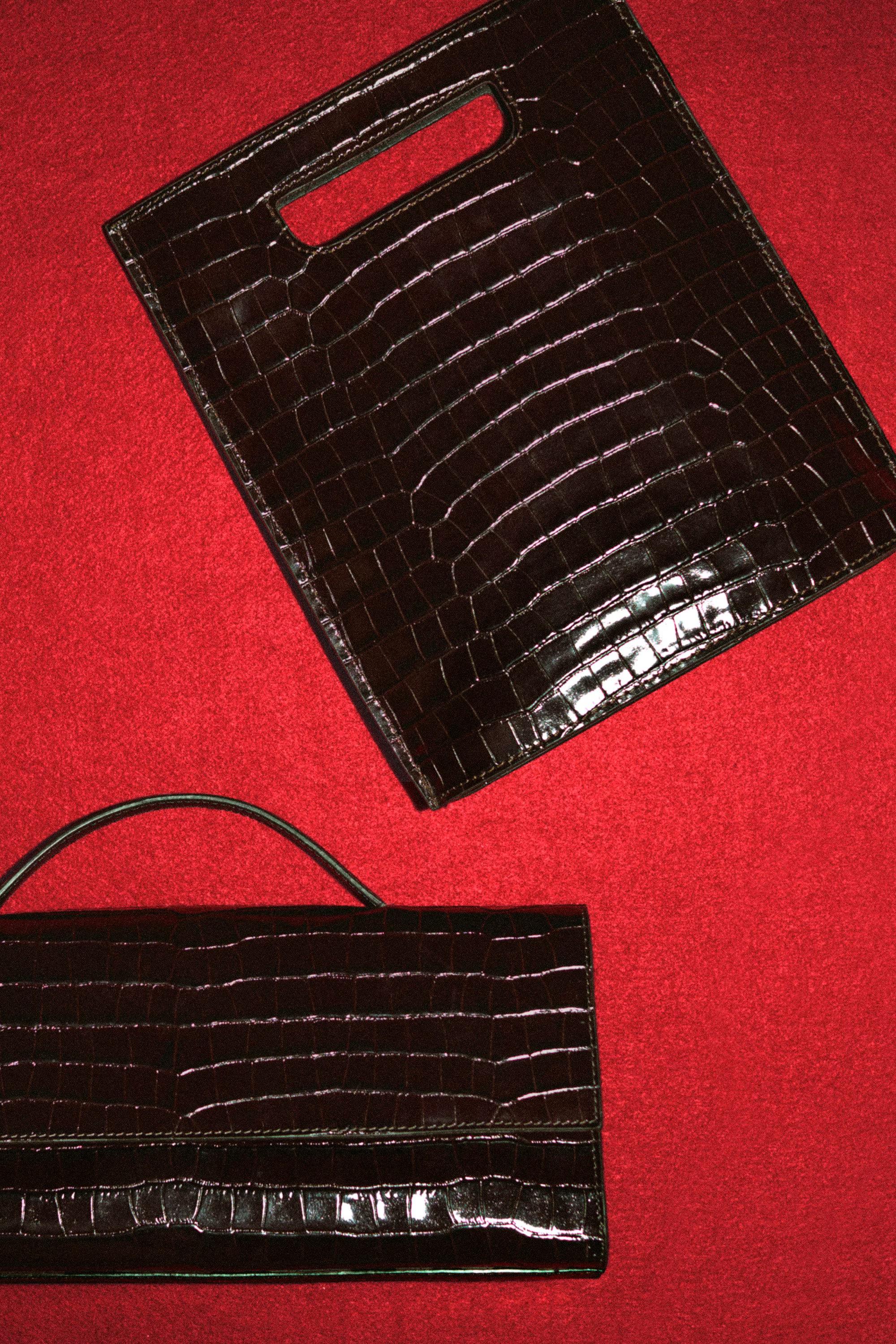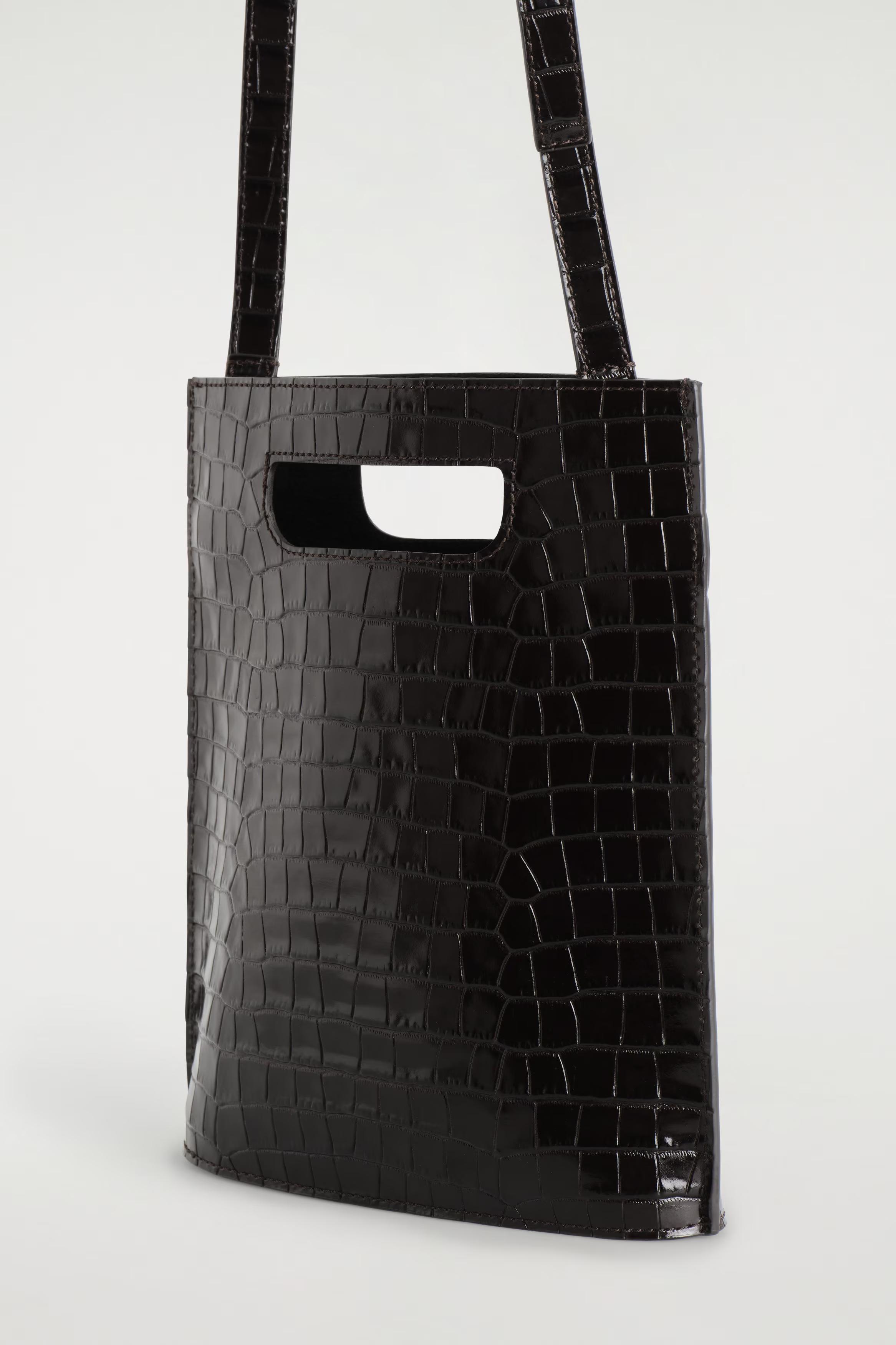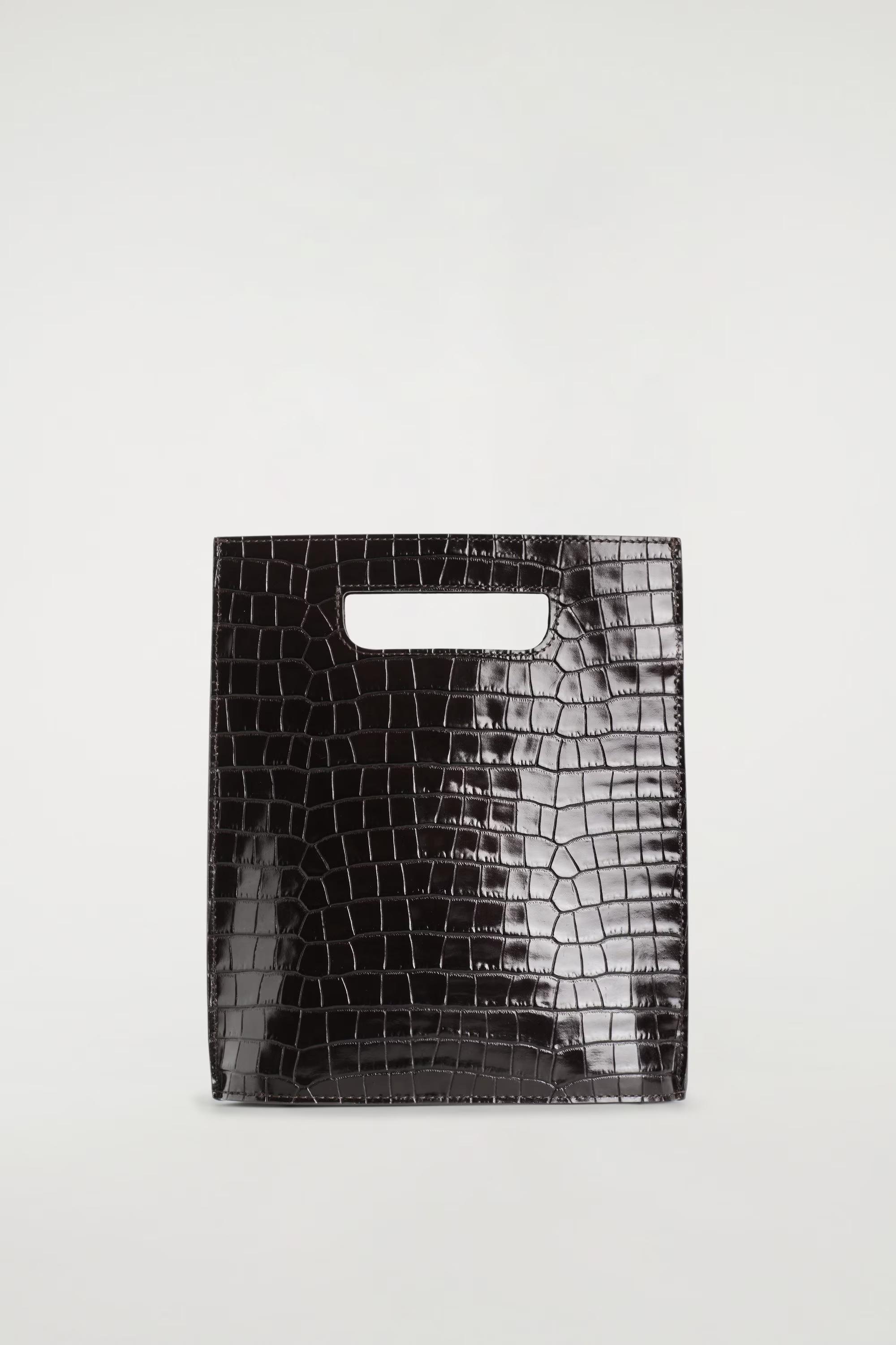 Introducing the Folio bag: revisited from the COS archive, renewed for the upcoming season. This mini version is crafted from the most supple crocodile-effect leather and retains its distinctive, slim silhouette with angular sides and an oval-shaped base. Style it across the body or carry it by the cutout handle.\u0026nbsp;Magnetic closureDetachable crossbody strapCOS supports responsible manufacturing via the Leather Working Group\u0026nbsp;Shell and lining: 100% Leather. Excluding trims\u0026nbsp;Height: 25cm, Width: 19.5cm, Depth: 7.5cm