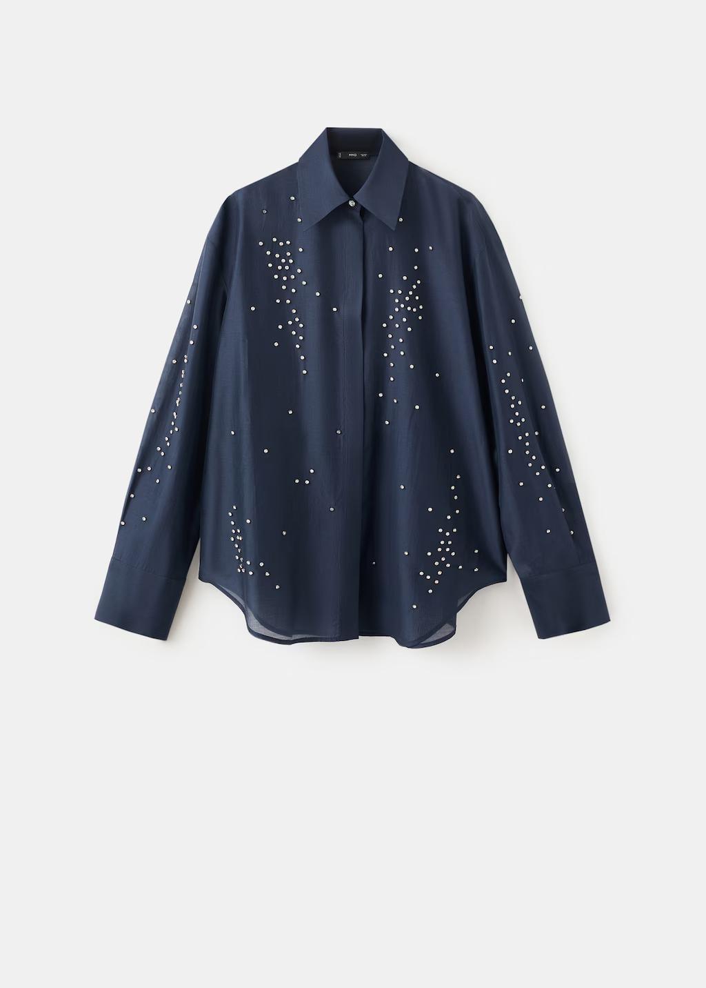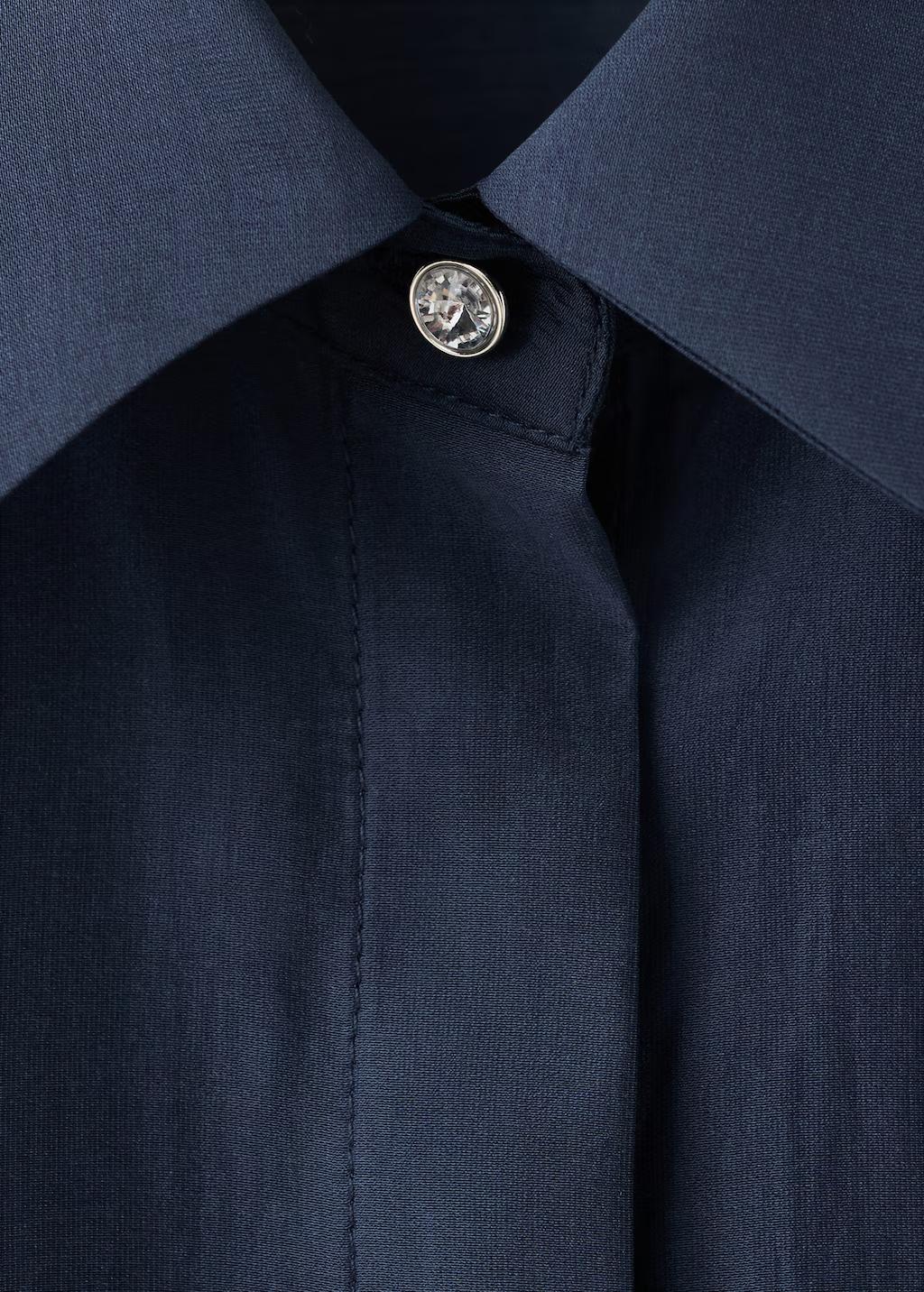 Tejido de lyocell. Detalle de strass. Cuello camisero. Manga larga con puños abotonados. Cierre delantero de botones oculto con tapeta