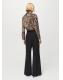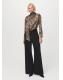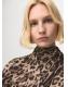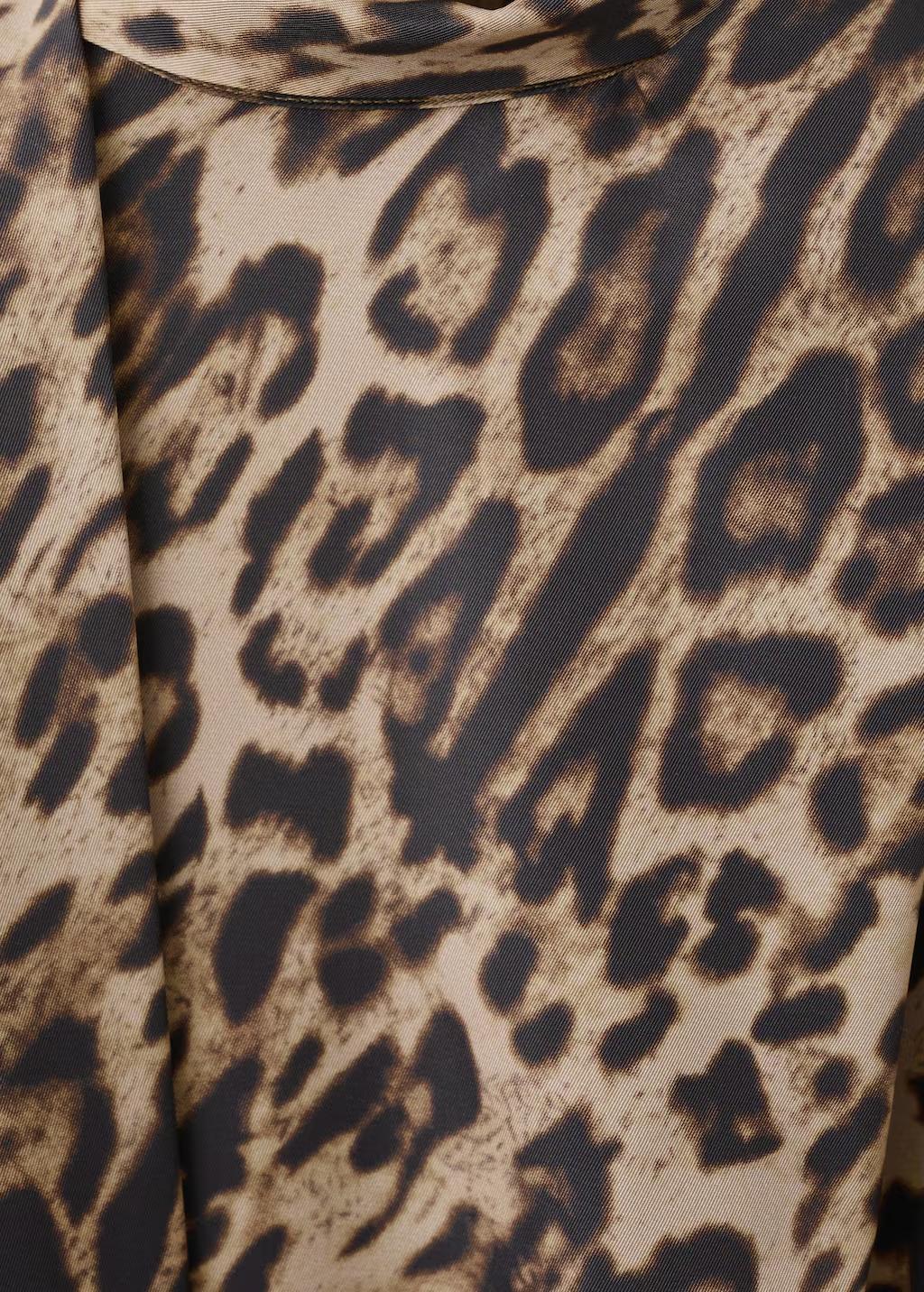 Con diseño recto y estampado animal print, esta prenda presenta un cuello perkins con adorno de fular. Las mangas largas tienen puños abotonados y el cierre de botones se encuentra en la parte posterior