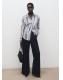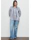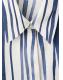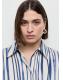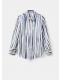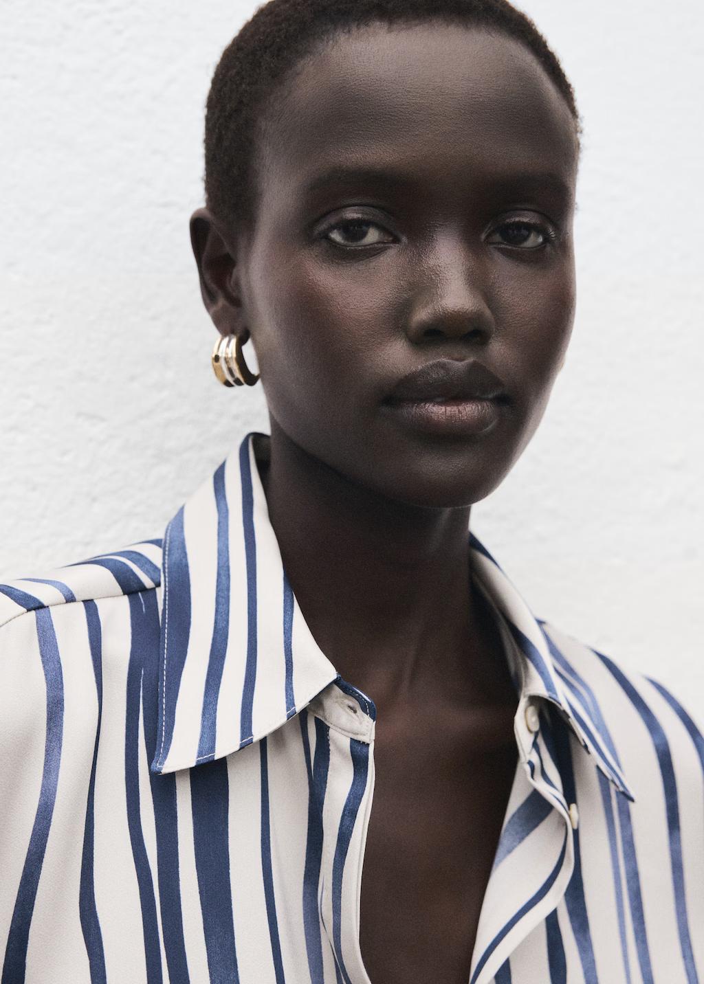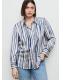 Tejido fluido con acabado satinado. Diseño recto. Estampado de rayas. Cuello camisero. Manga larga con puños abotonados. Cierre de botones en la parte delantera. Disponible Plus