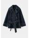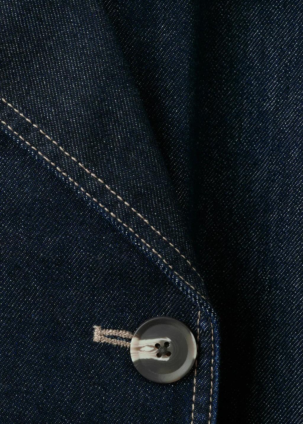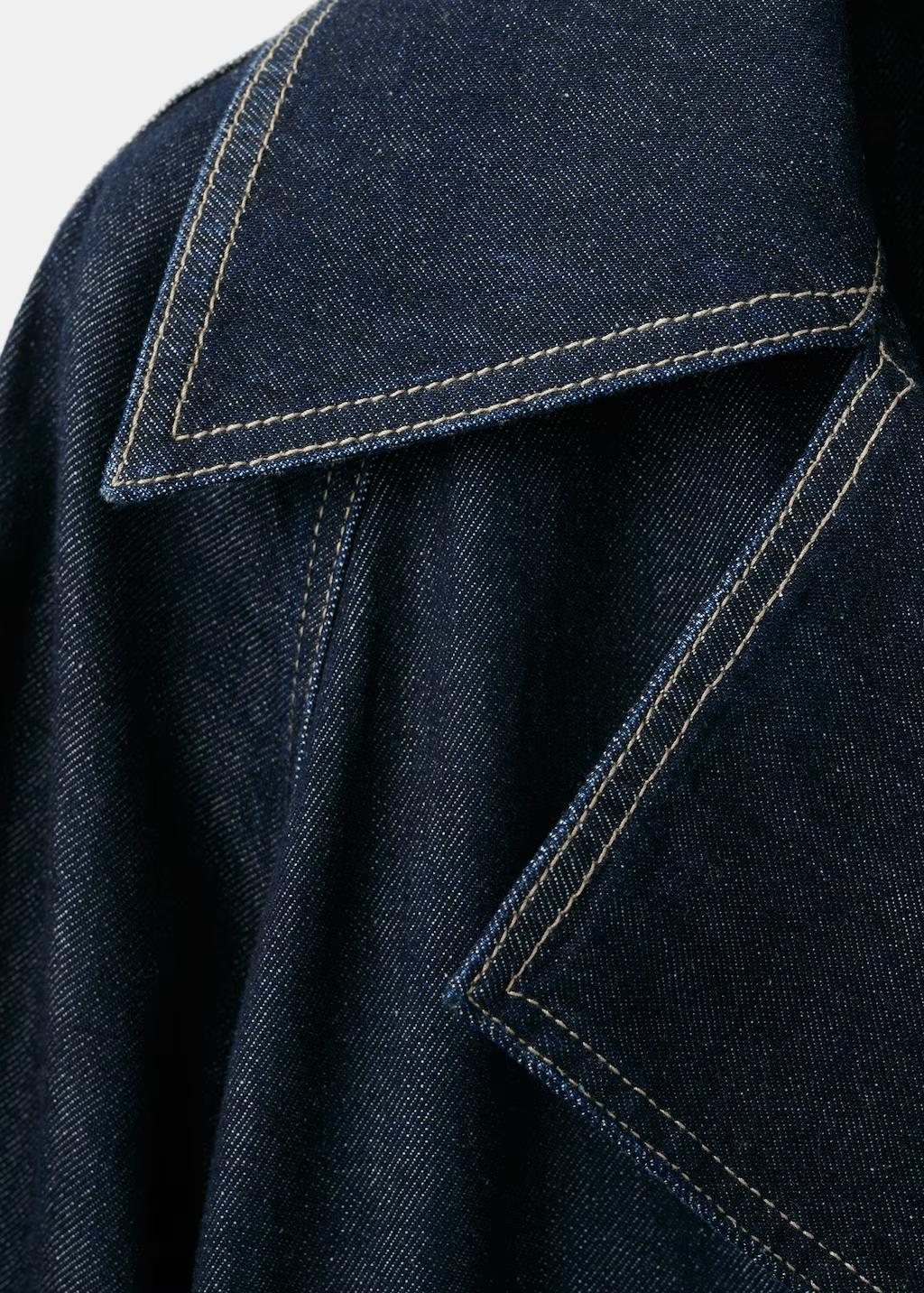 Tejido de algodón estilo tejano vaquero. Rinse wash. Diseño recto. Diseño largo. Manga larga con puños abotonados. Cuello pico con solapa. Solapas con muesca. Dos bolsillos laterales. Cierre de botones. Total look