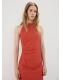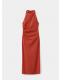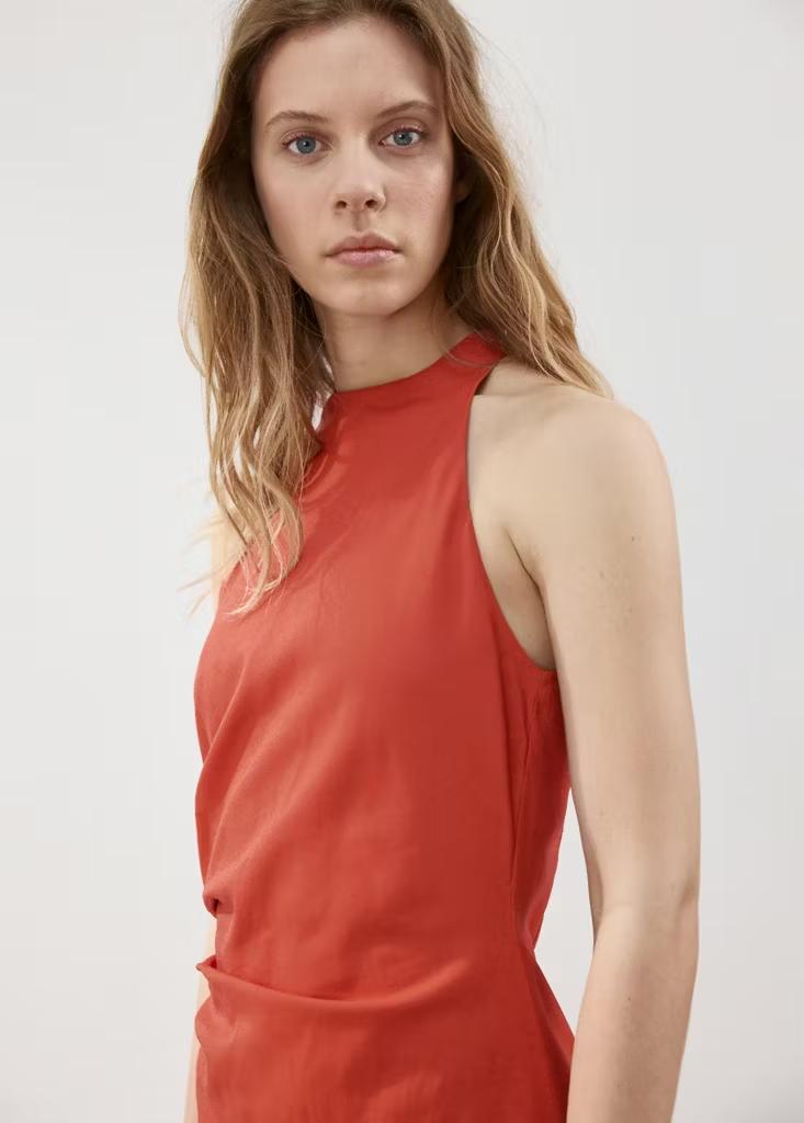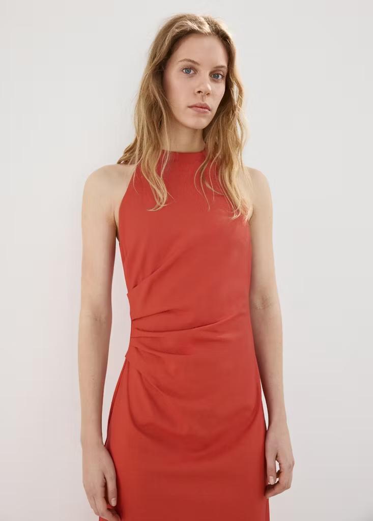 Diseño midi. Diseño entallado. Detalle drapeado. Cuello halter. Sin mangas. Cierre de cremallera en la parte posterior. Forro interior