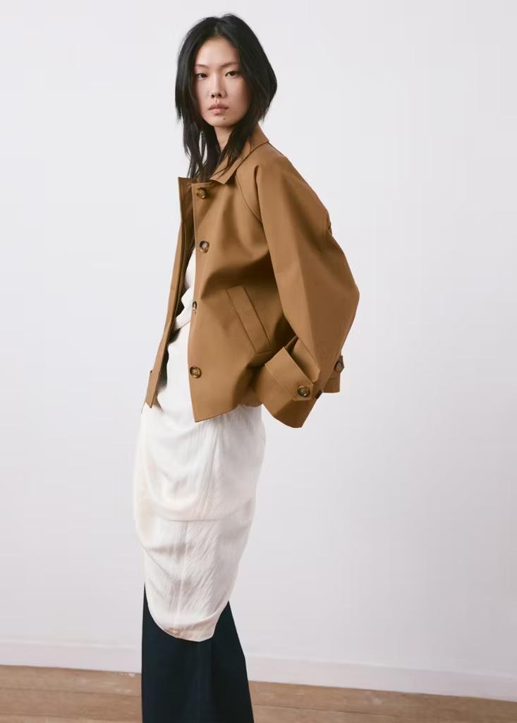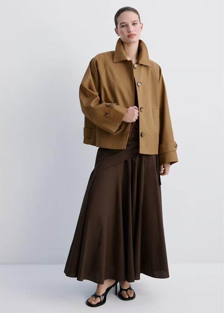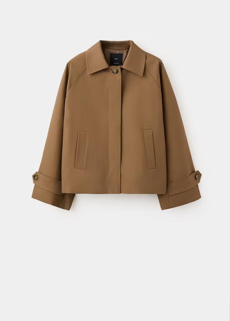 Tejido de algodón. Diseño corto. Diseño oversize. Cuello pico con solapa. Solapas con muesca. Manga larga con puño de tira abotonada. Dos bolsillos laterales. Cierre delantero con botones. Forro interior