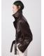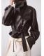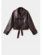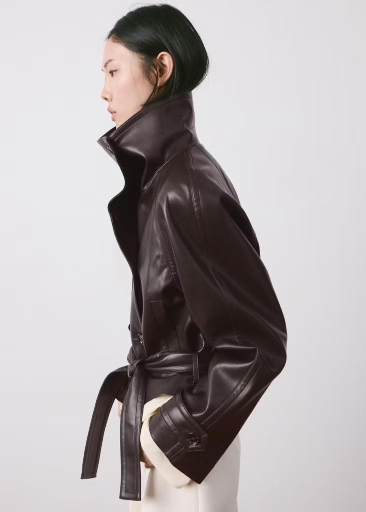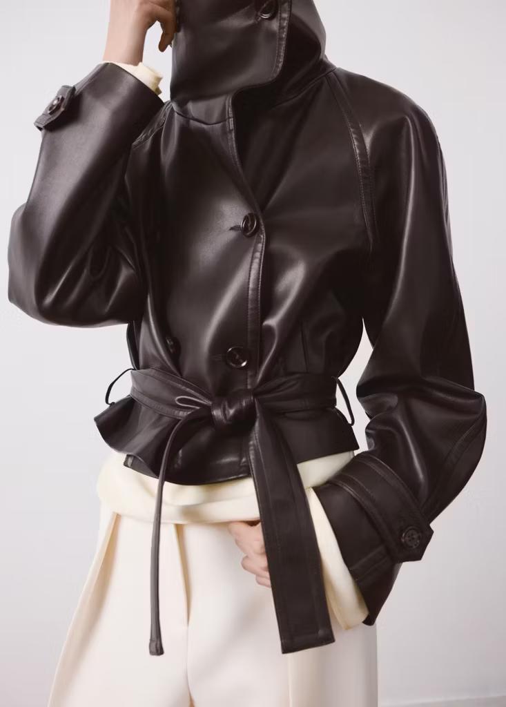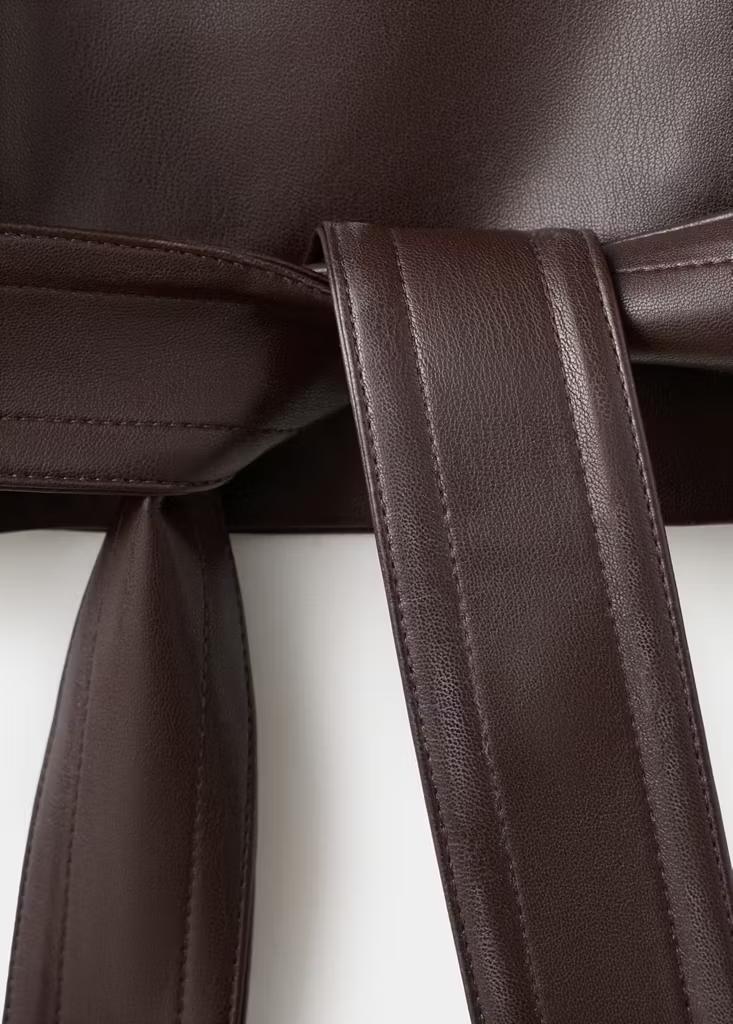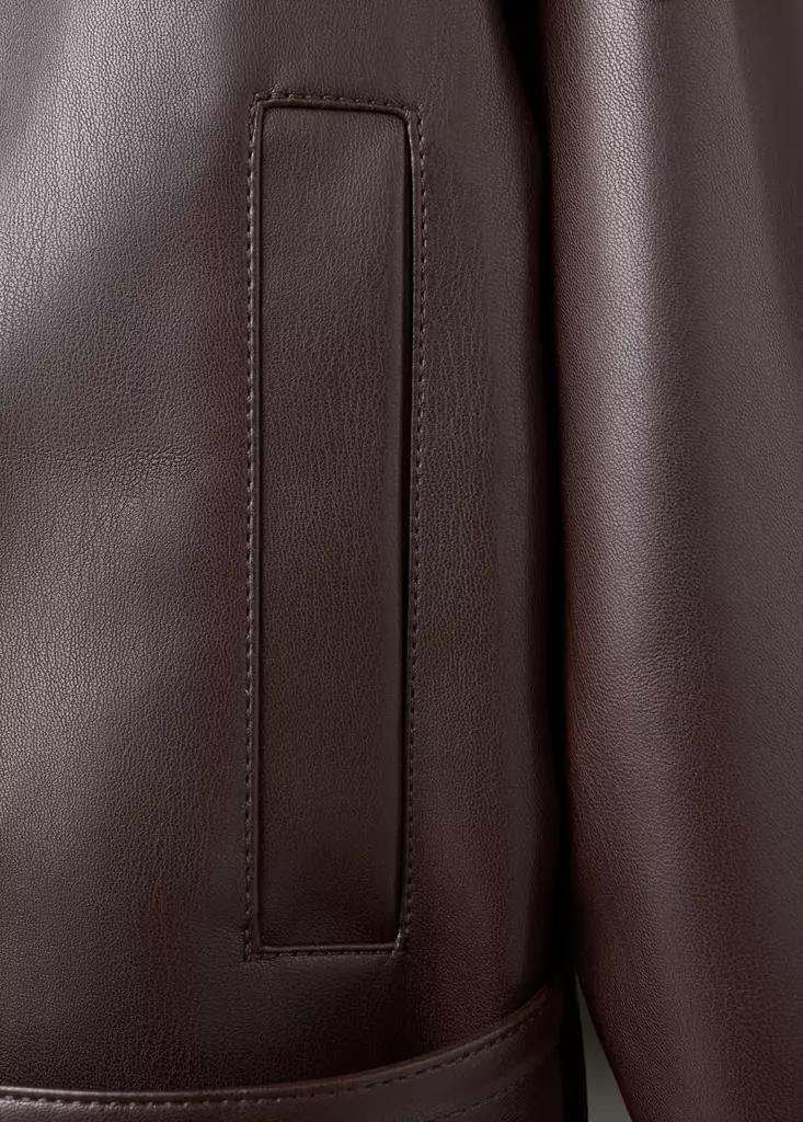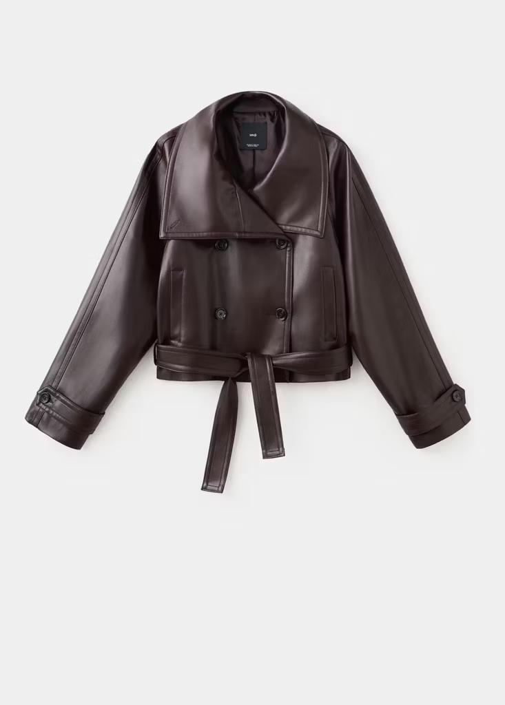 Efecto piel. Diseño recto. Diseño corto. Cuello cruzado con solapa. Solapas amplias. Manga larga con puños abotonados. Dos bolsillos laterales. Cierre de doble botonadura. Cinturón tipo batín. Forro interior