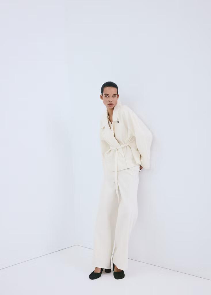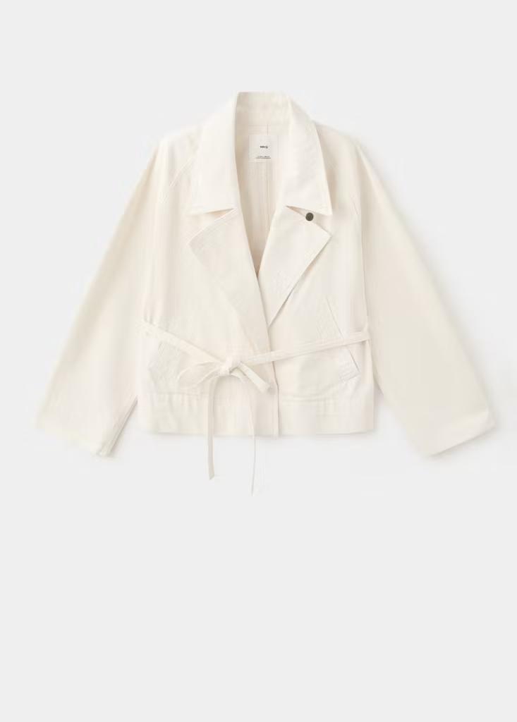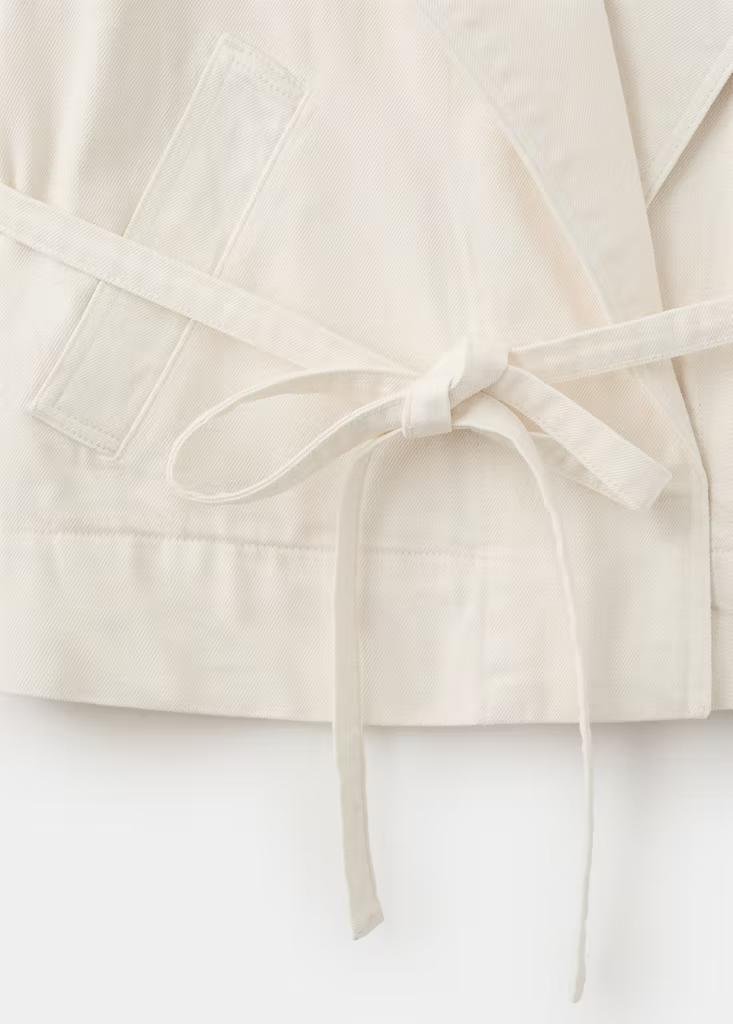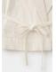 Tejido 100% algodón. Diseño corto. Diseño recto. Cuello pico con solapa. Solapas con muesca. Dos bolsillos laterales. Cinturón tipo batín. Cierre delantero con botones