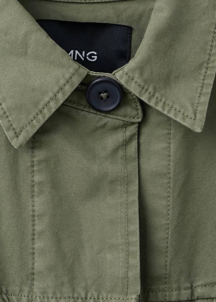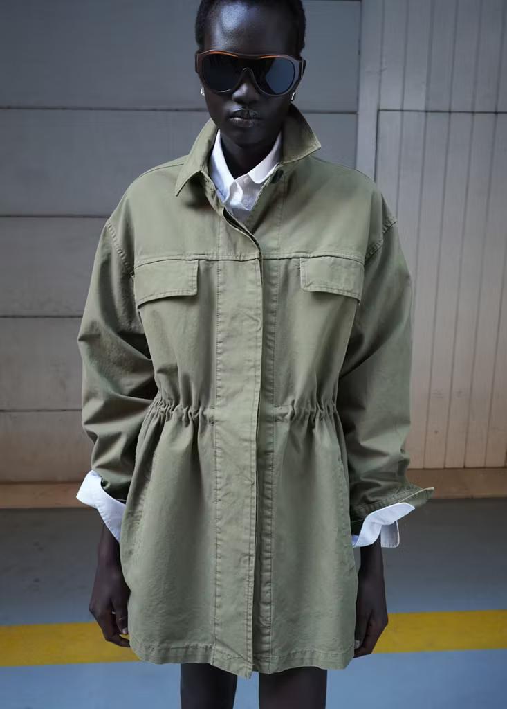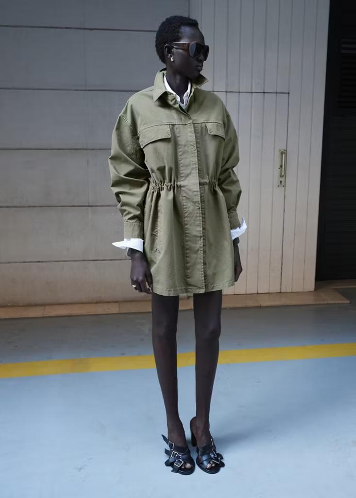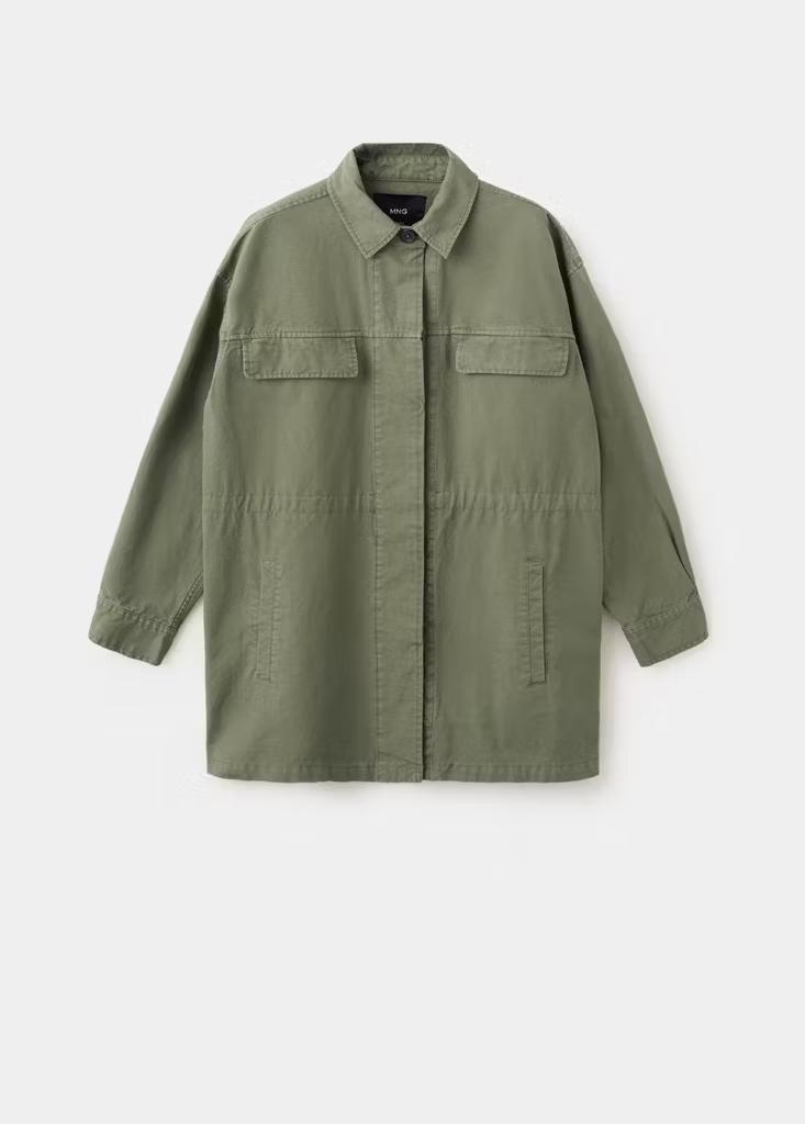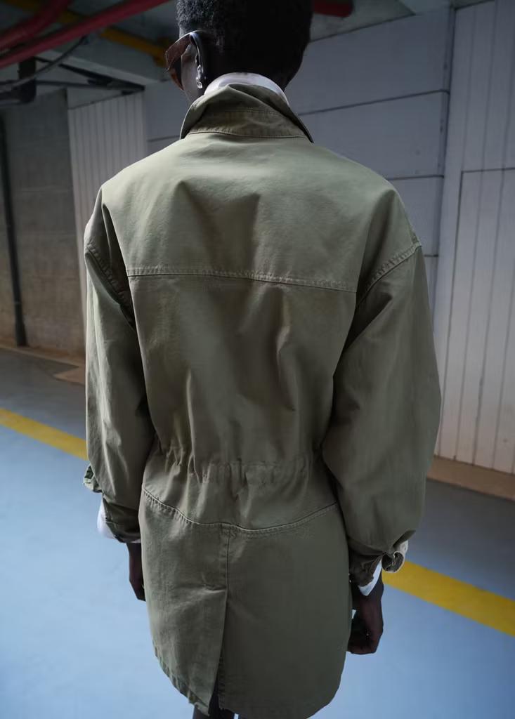 Tejido de algodón estilo tejano vaquero. Diseño oversize. Cuello camisero. Manga larga. Dos bolsillos laterales. Dos bolsillos de solapa en el pecho. Cierre de botones oculto