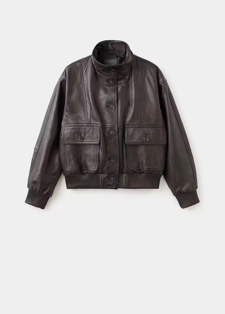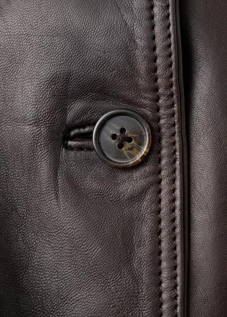 100% piel ovino. Diseño recto. Cuello alto. Manga larga. Dos bolsillos de solapa y botón en la parte delantera. Cierre de botones. Forro interior