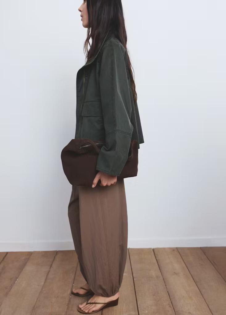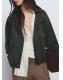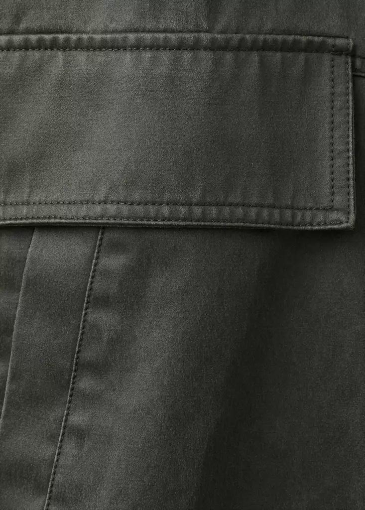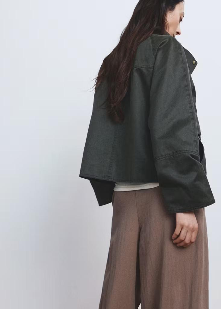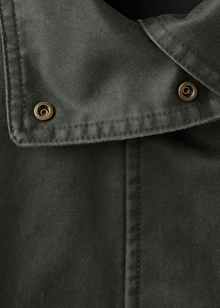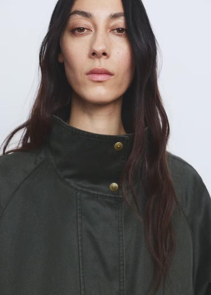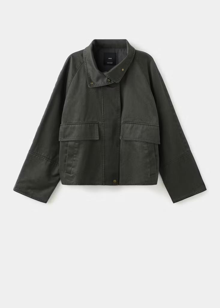 Tejido de algodón estilo tejano vaquero. Diseño oversize. Cuello embudo. Manga larga. Dos bolsillos laterales. Dos bolsillos de solapa laterales. Cierre delantero con cremallera y botones ocultos. Forro interior