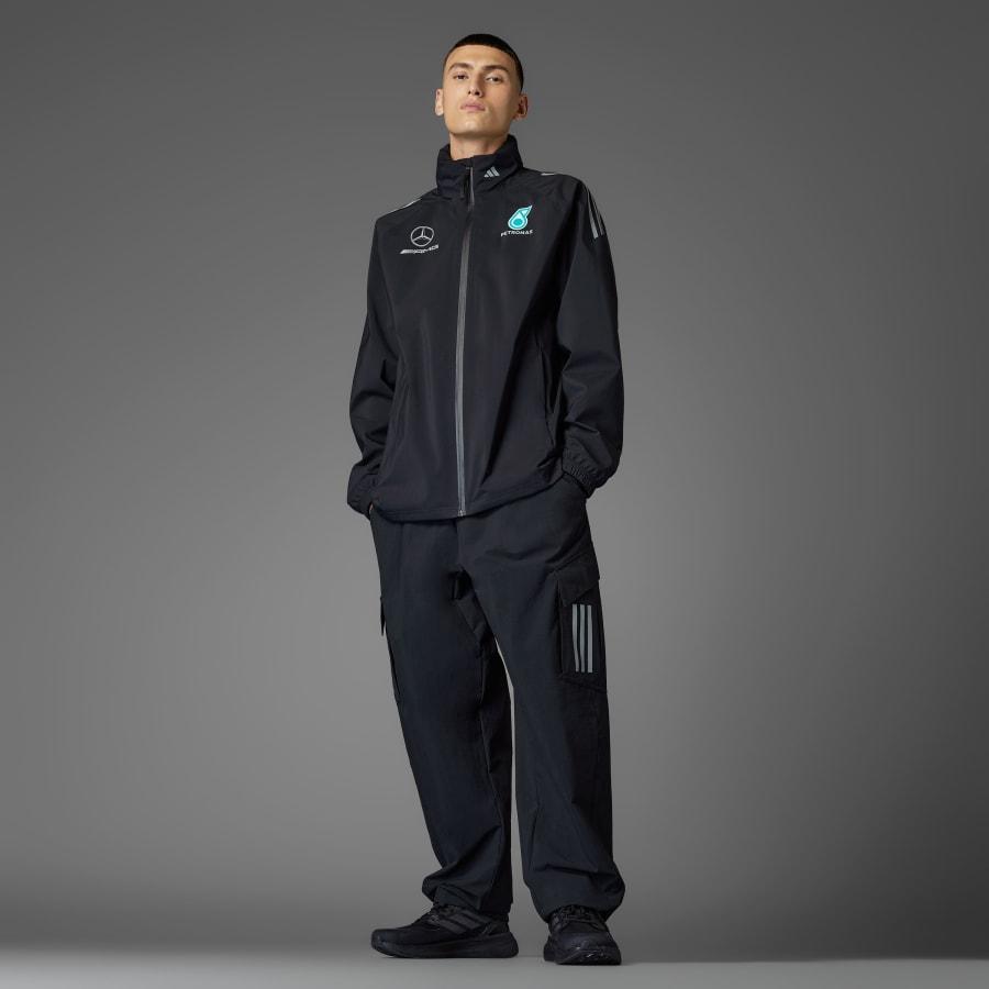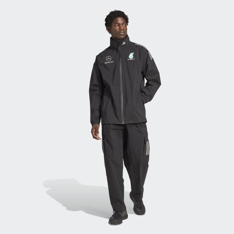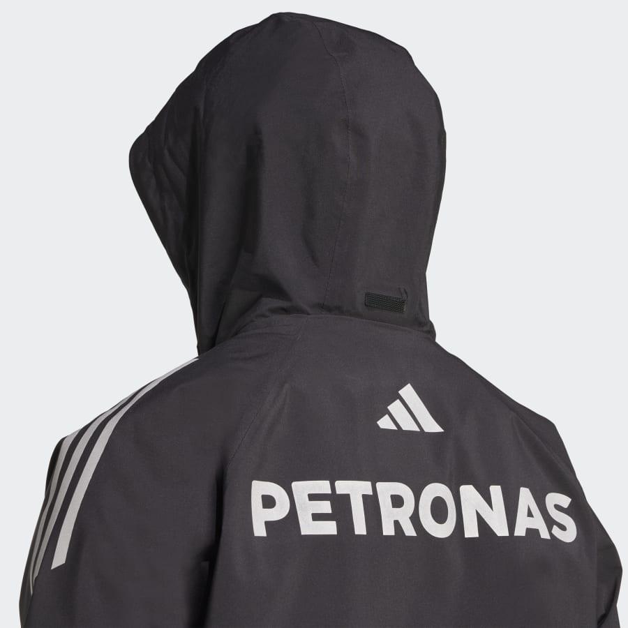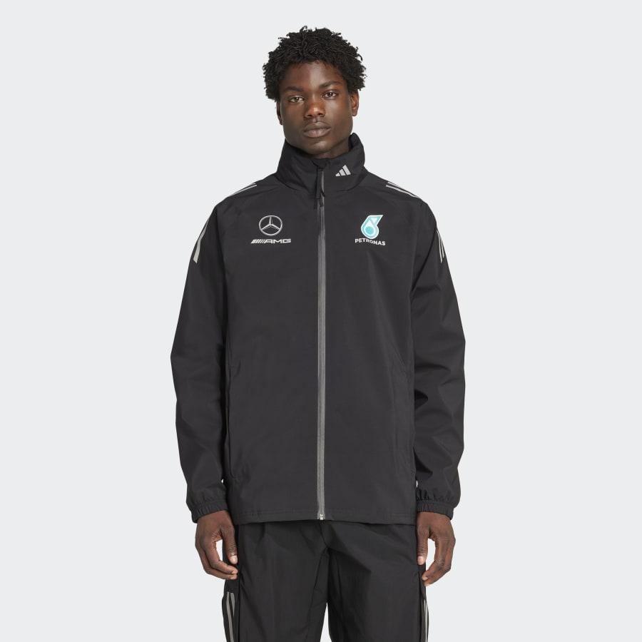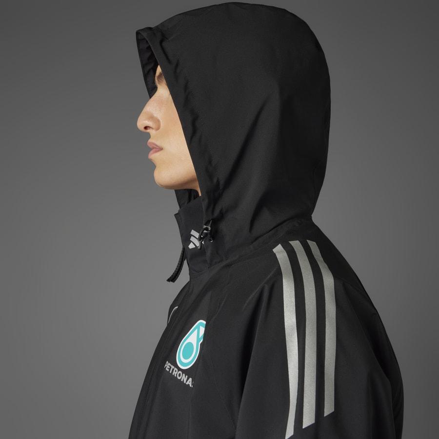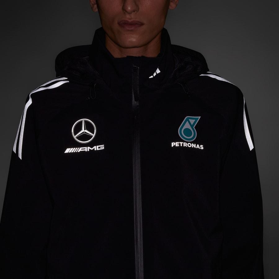Regular fit","Full zip with bungee-adjustable hood","Outer:100% polyester (recycled); Inner:100% polyurethane","RAIN.RDY","Front pockets","Mesh lining","Packable hood","Mercedes - AMG Petronas Formula One Team logo"