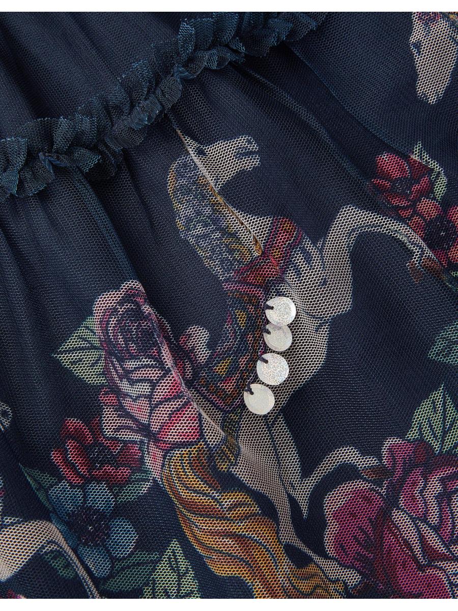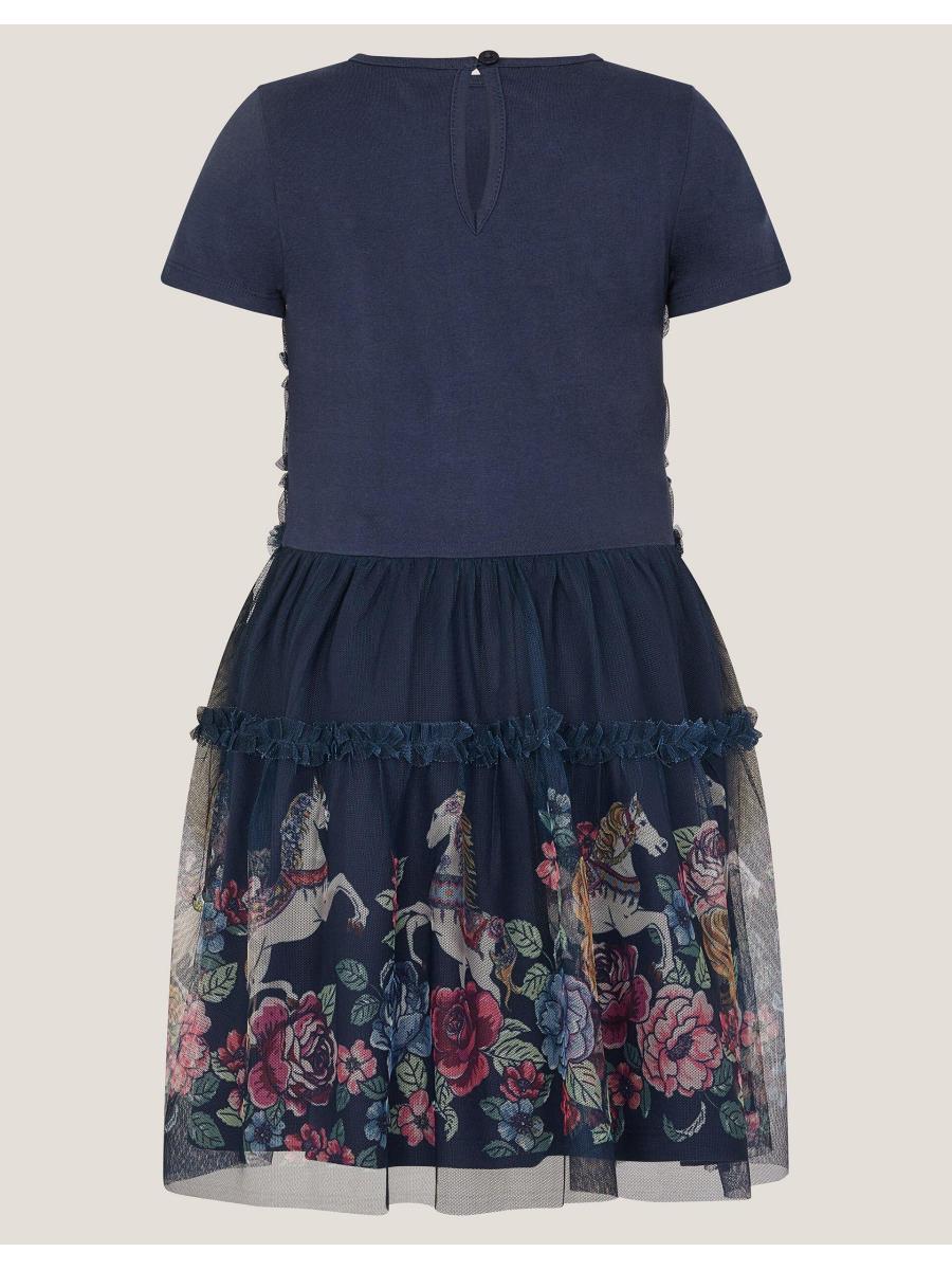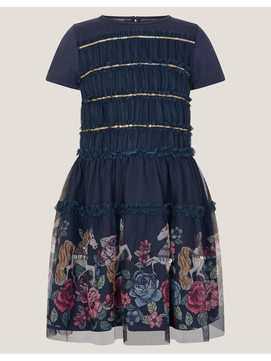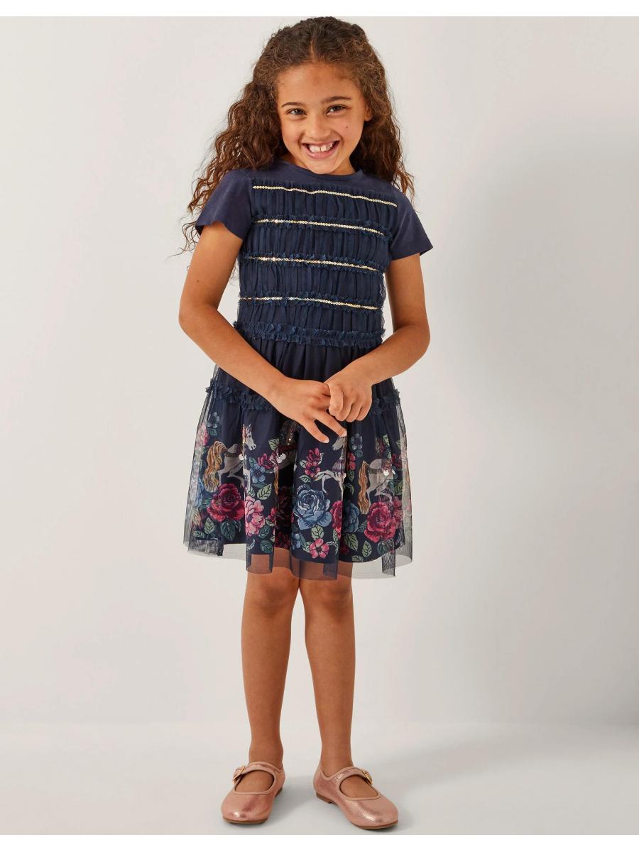 Everyday magic. Made from soft jersey fabric, this dress is a dazzling addition to their weekend looks. Decorated with a frilly sequin bodice and a border of unicorns and flowers at the mesh layered hem. Blue