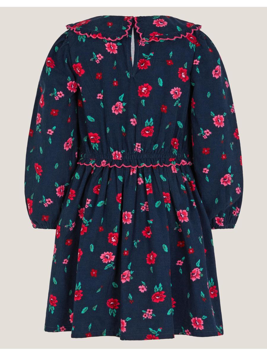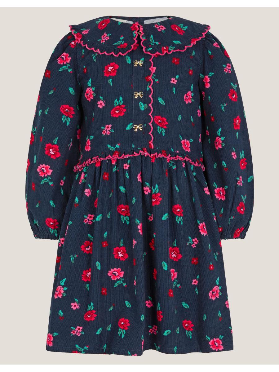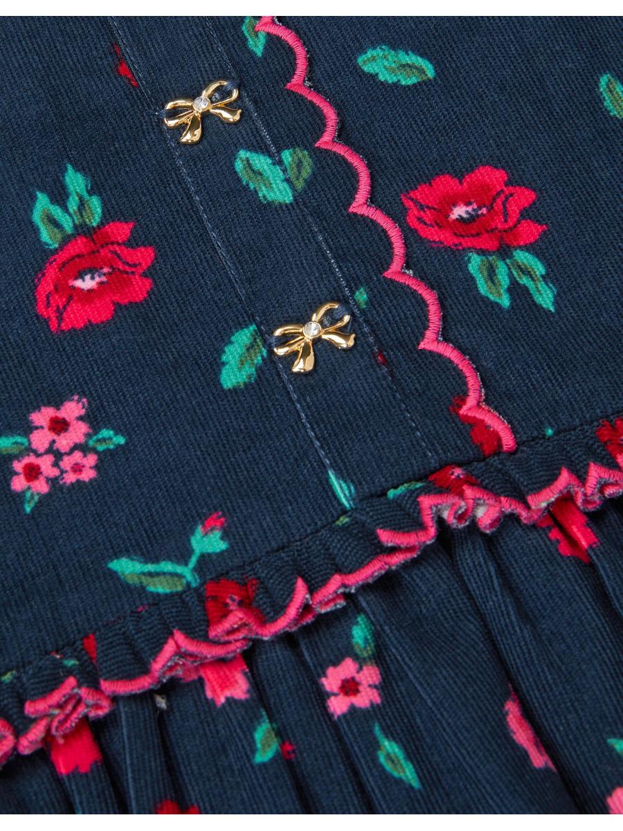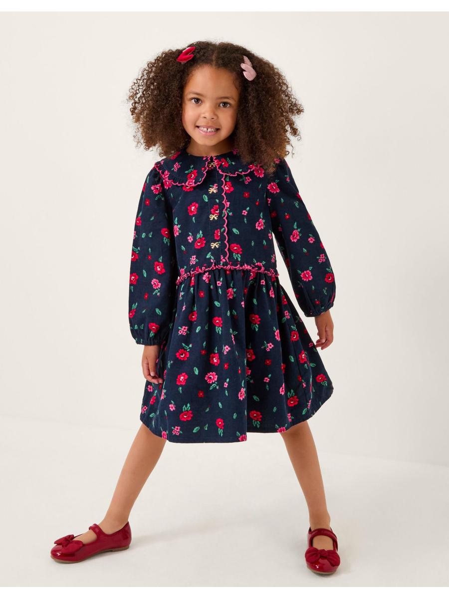 Cutest thing ever! A vintage frock you can style them in for every season, this corduroy dress is decorated with scalloped frills and floral embroidery. Finished with full-length sleeves and teeny gold-tone bows on the bodice. Blue