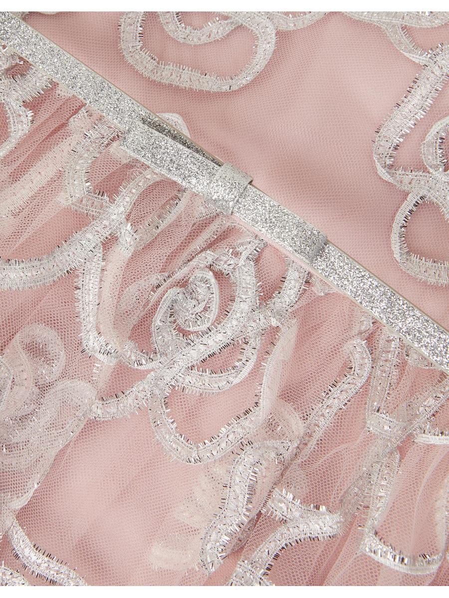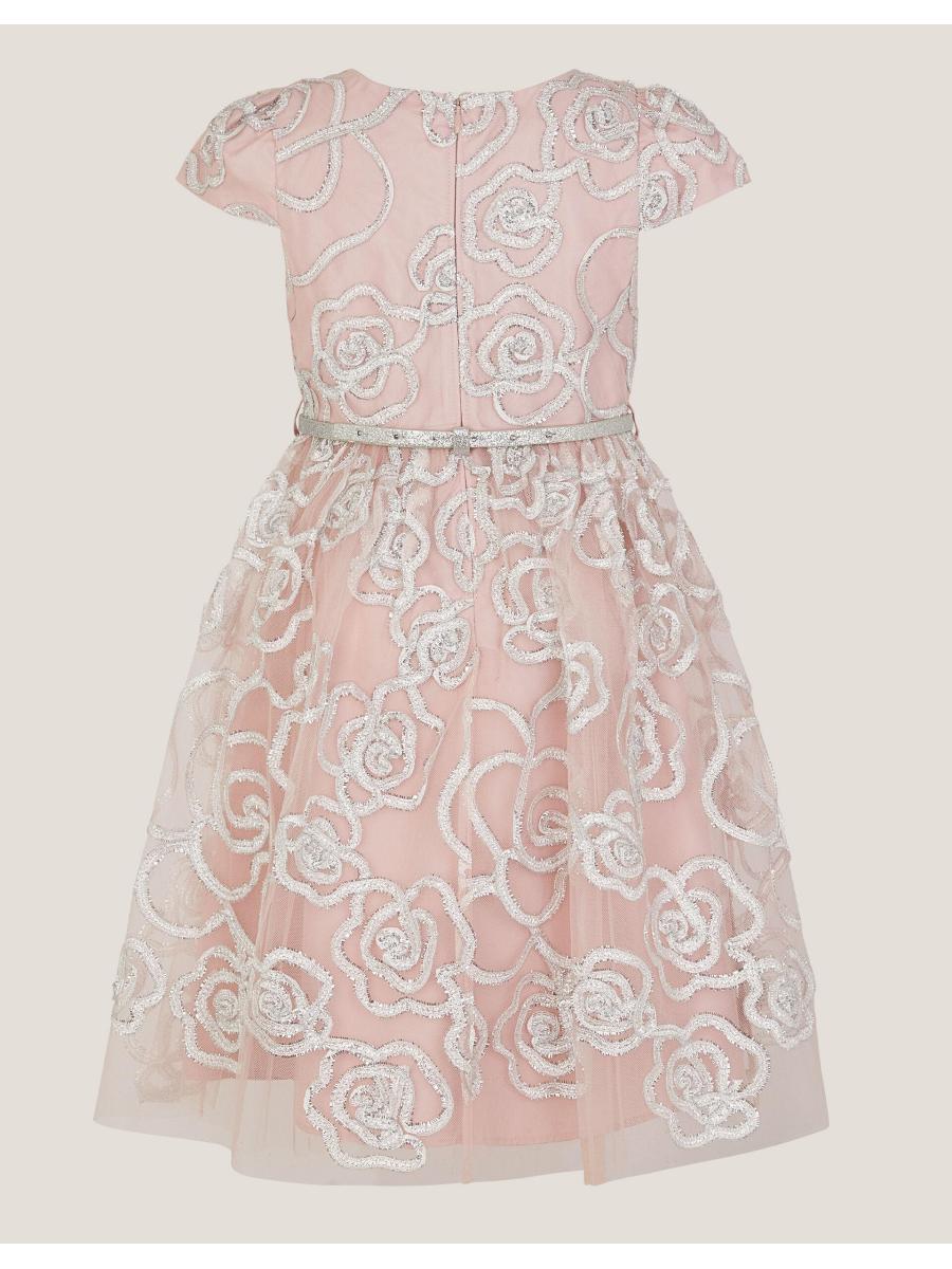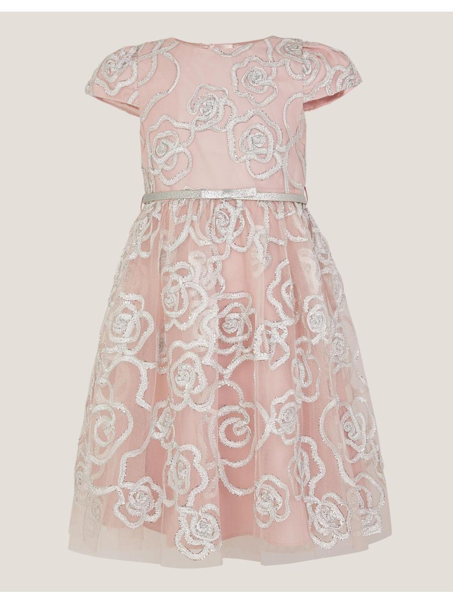 Party proof! A dress that will dazzle for any special occasion in your little one's social calendar. Designed with short sleeves and a swishy tulle skirt, it's decorated with tinsel swirling into rose shapes for an ultra-sparkly feel. Finished with a back zip fastening and silver waist belt. Pink