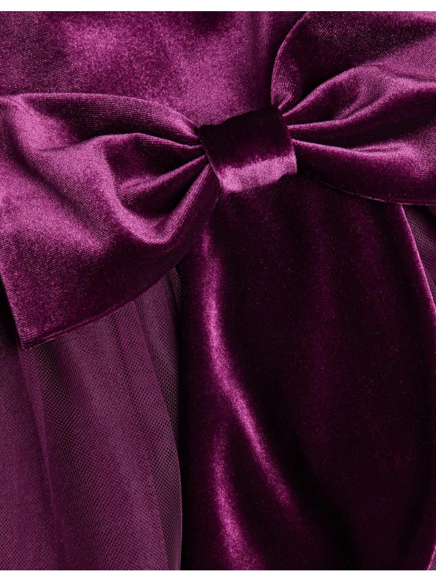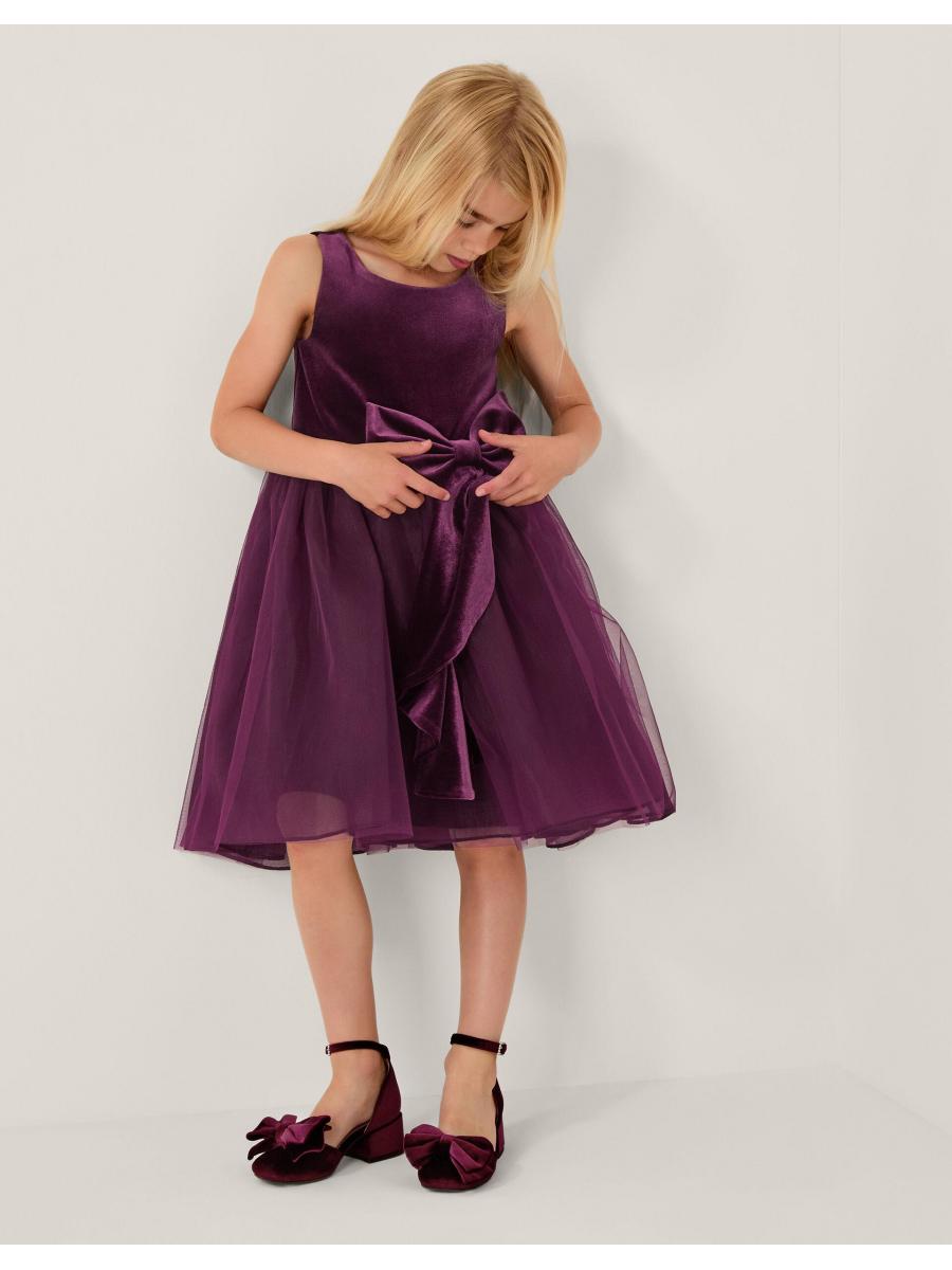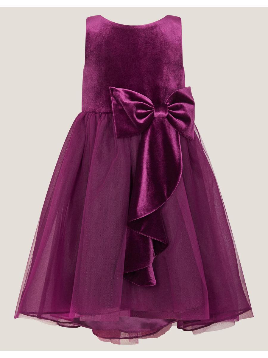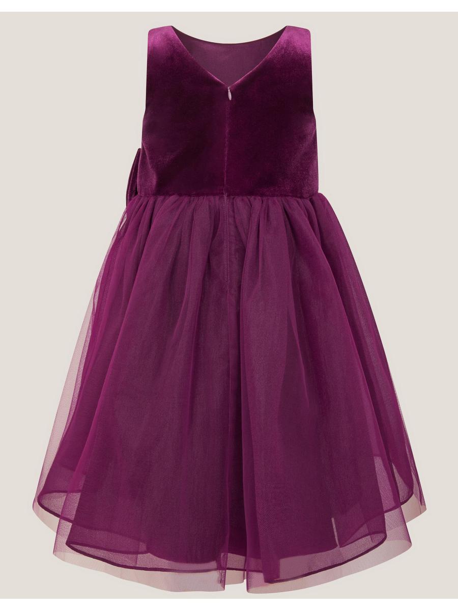 Party in style. Whether they're attending wedding celebrations or dressing up fancy for a birthday party, this dress is ready for any occasion. Designed with a sleeveless bodice in a soft velvet finish, it features a cascading bow at the waist to add even more drama above the puffy tulle hem. Finished with a discreet back zip fastening for easy dressing. Purple