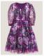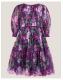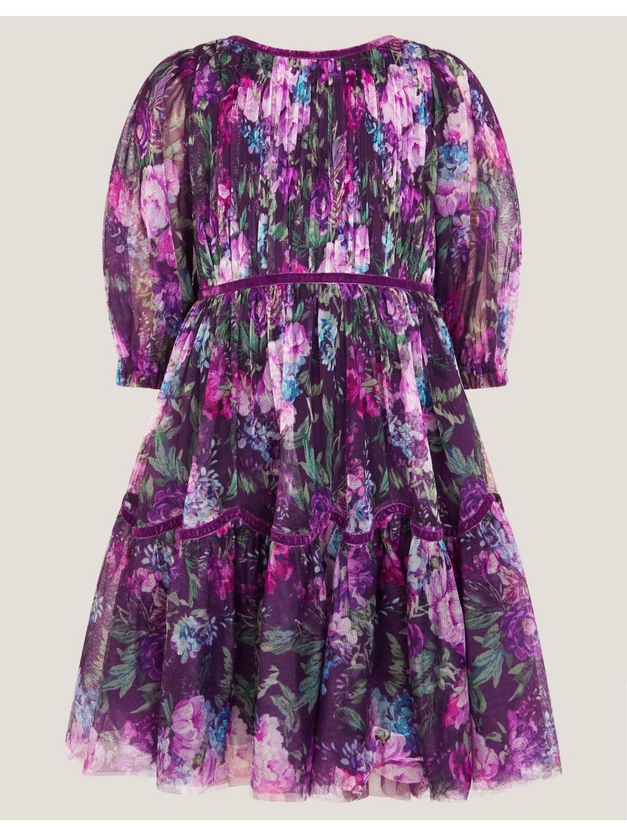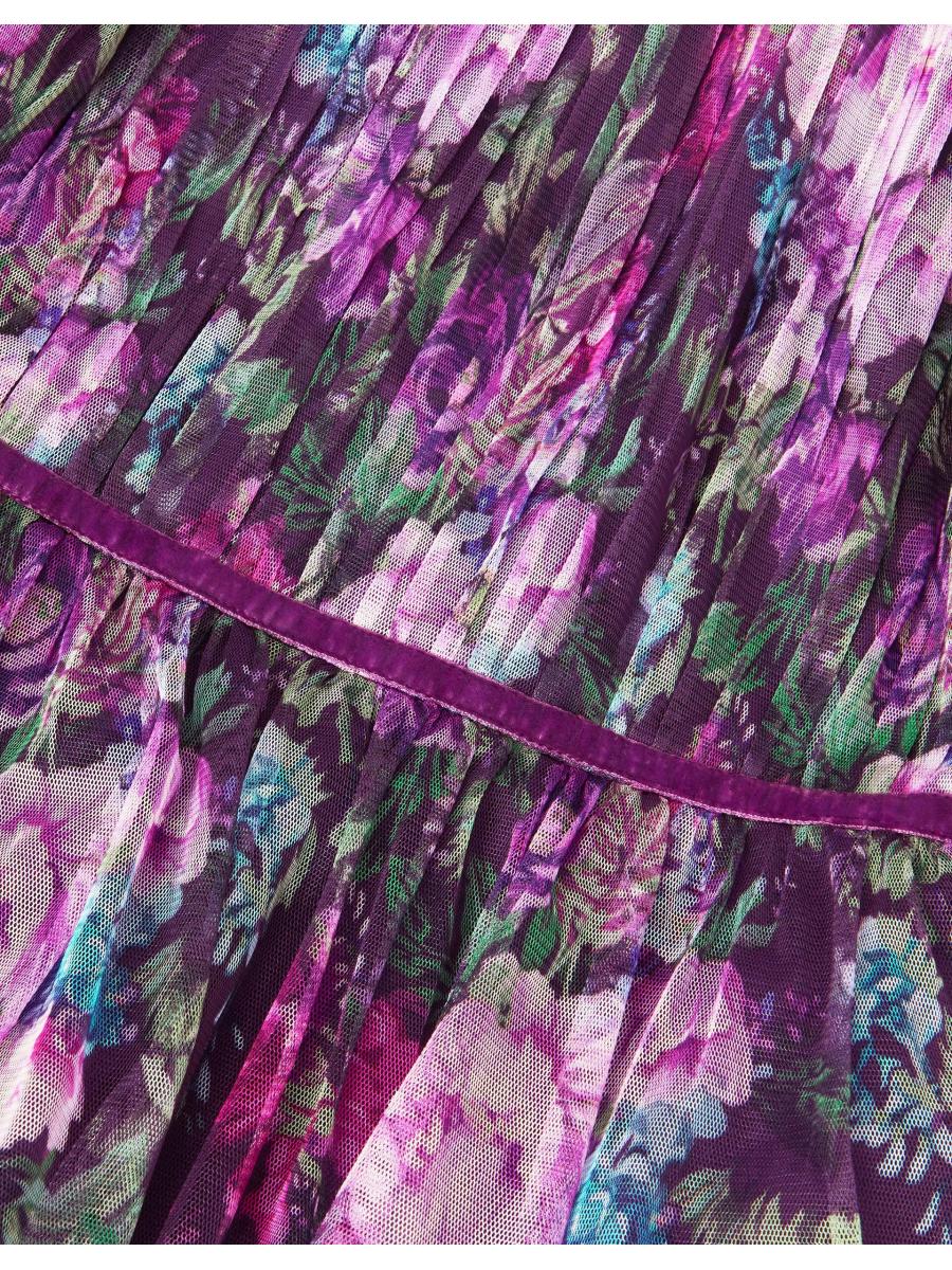 Dress for joy! Designed with puffy ¾ sleeves, a pleated bodice and twirl-worthy hem, this dress will dazzle at any occasion. Cloaked with heirloom florals over the dreamy plum backdrop, it's finished velvety soft trims to match. Purple