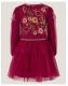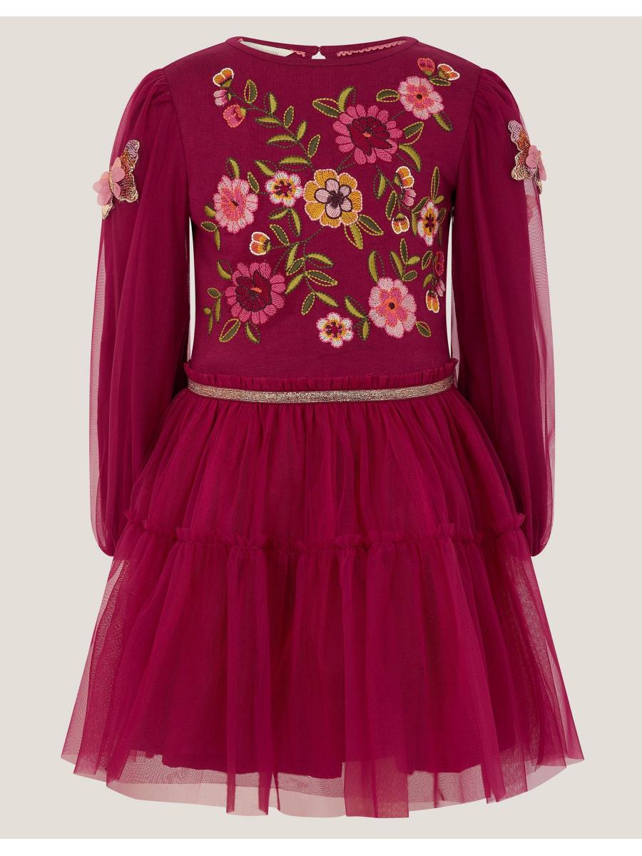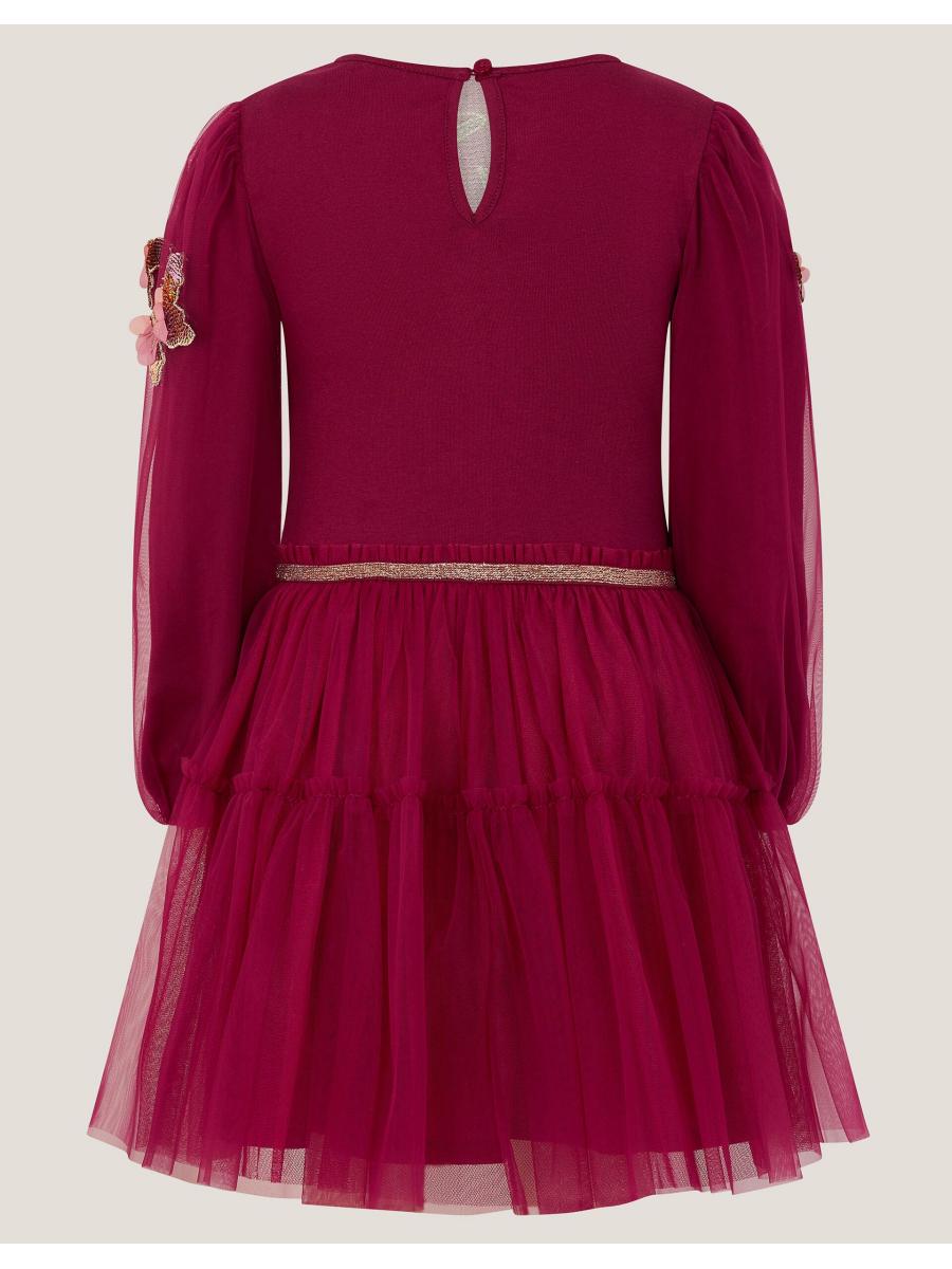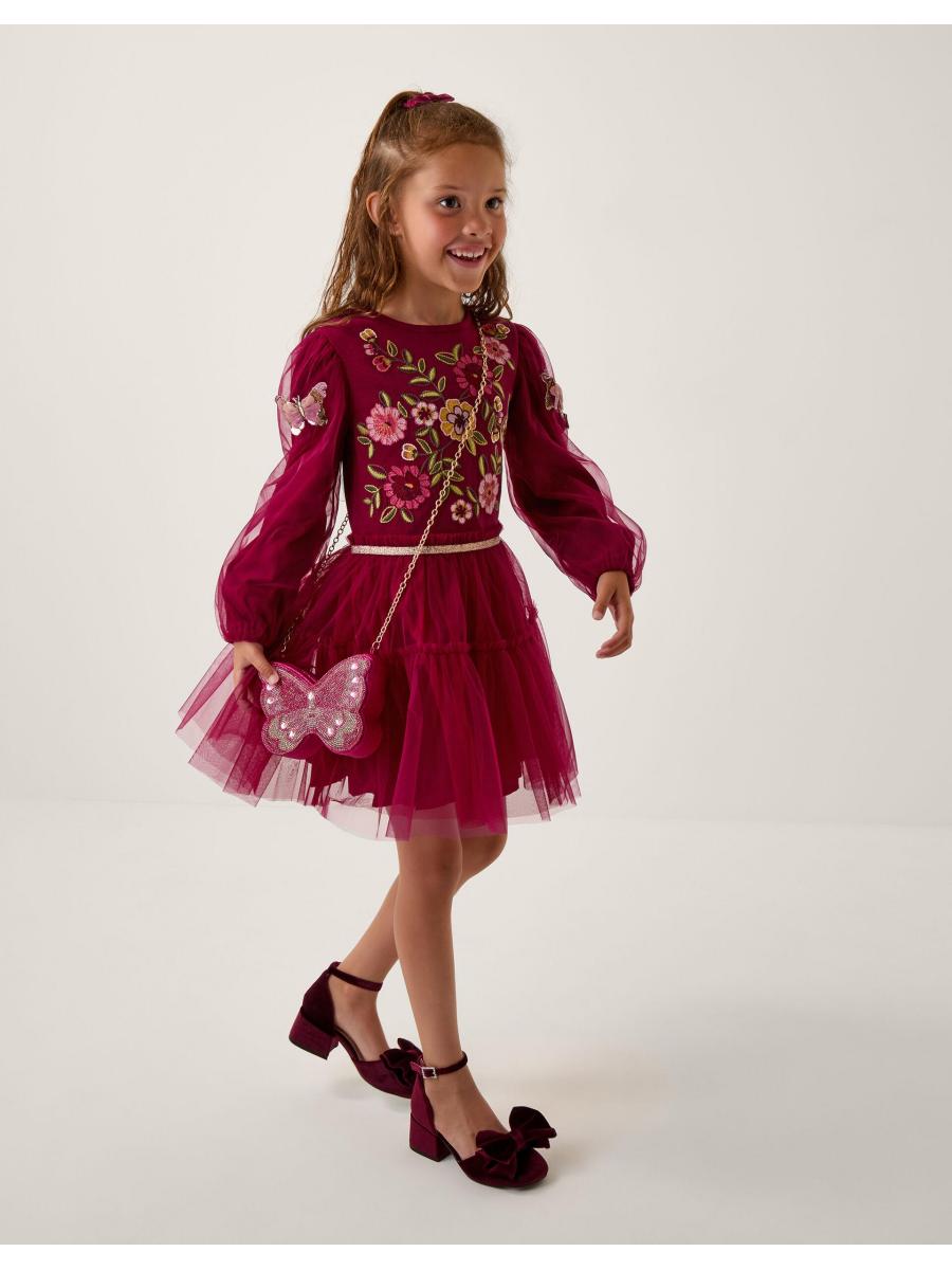 Watch me twirl! Designed in a rich burgundy hue, this dress is perfect for special occasions. Decorated with tulle ruffles and floral embroidery on the bodice, it's finished with butterfly embellishments on the long sleeves. Red