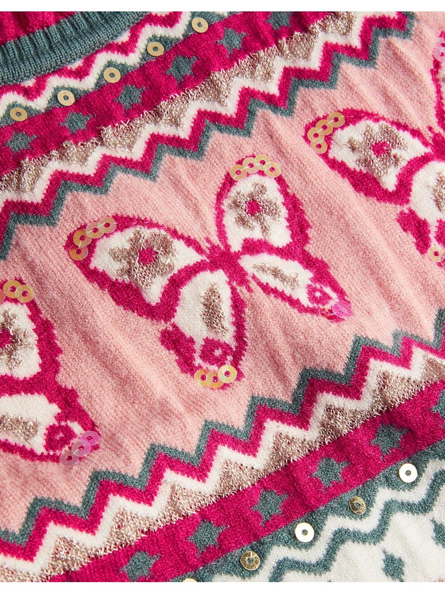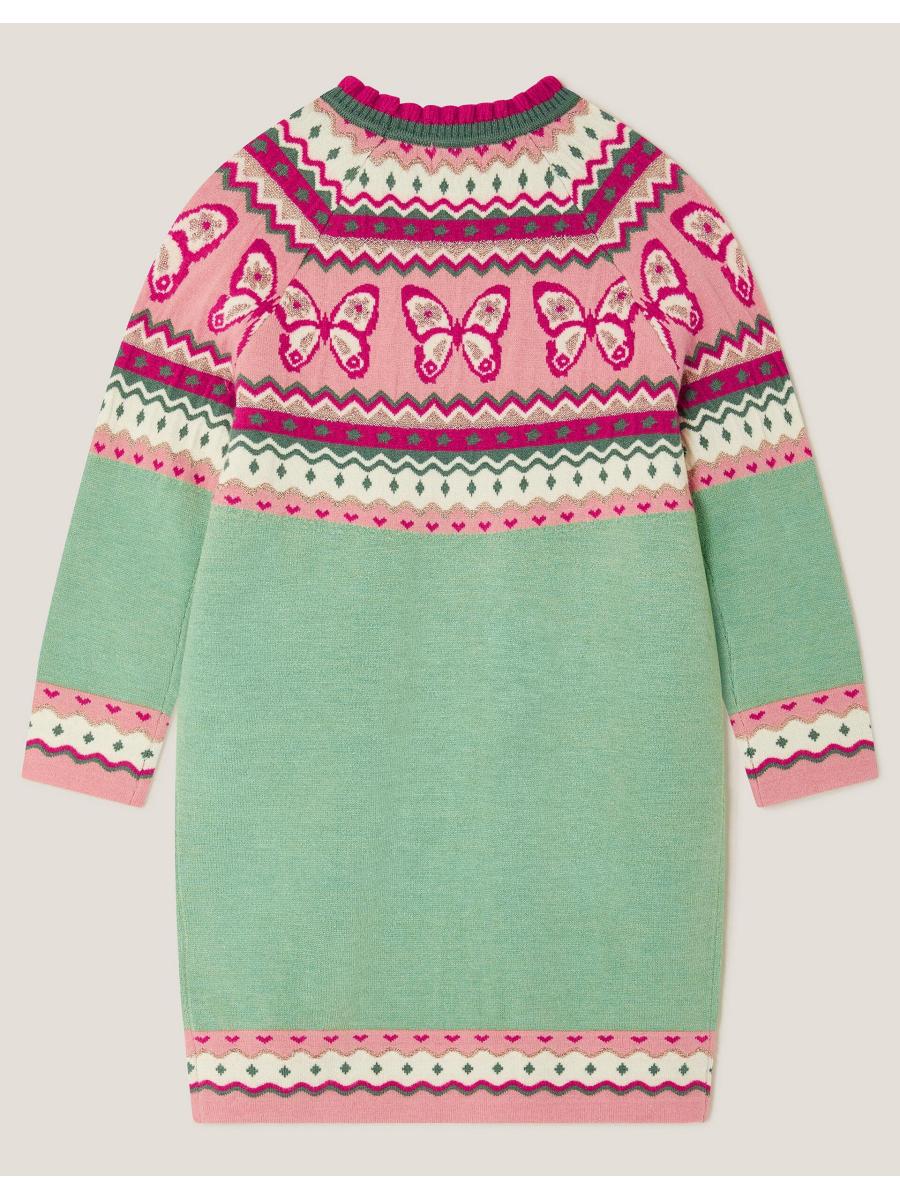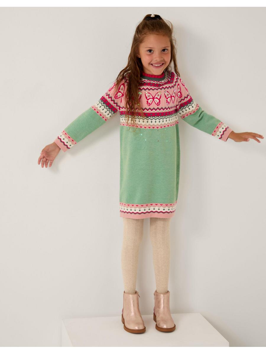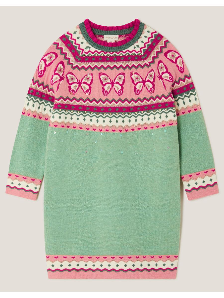 Jump(er) to it! The perfect pick for the chilly months ahead, this jumper dress showcases a butterfly Fair Isle pattern with small sparkly sequin embellishments. Complete the look with woolly tights and stompy boots. Green
