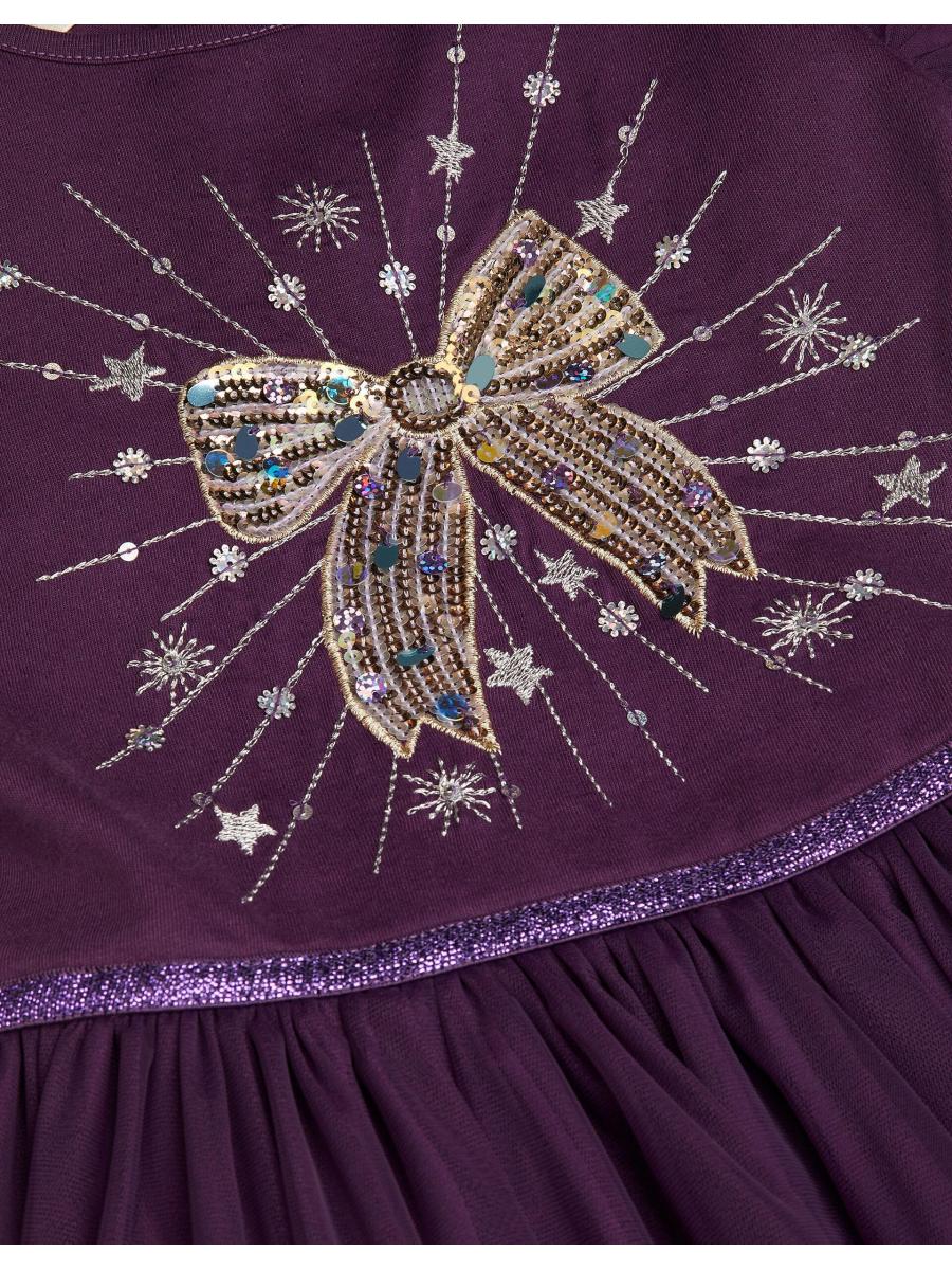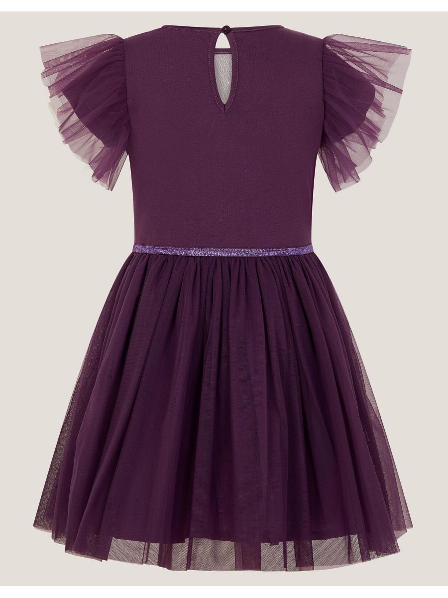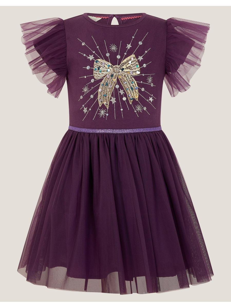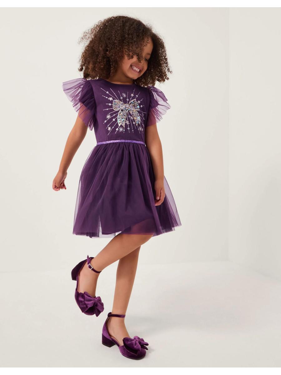 Take a bow! Designed in a rich purple hue, this dress is perfect for special occasions. Decorated with a statement bow embellishment on the bodice, it's complemented by an A-line tulle skirt featuring a sparkly waistband. Finished with ruffle sleeves. Purple