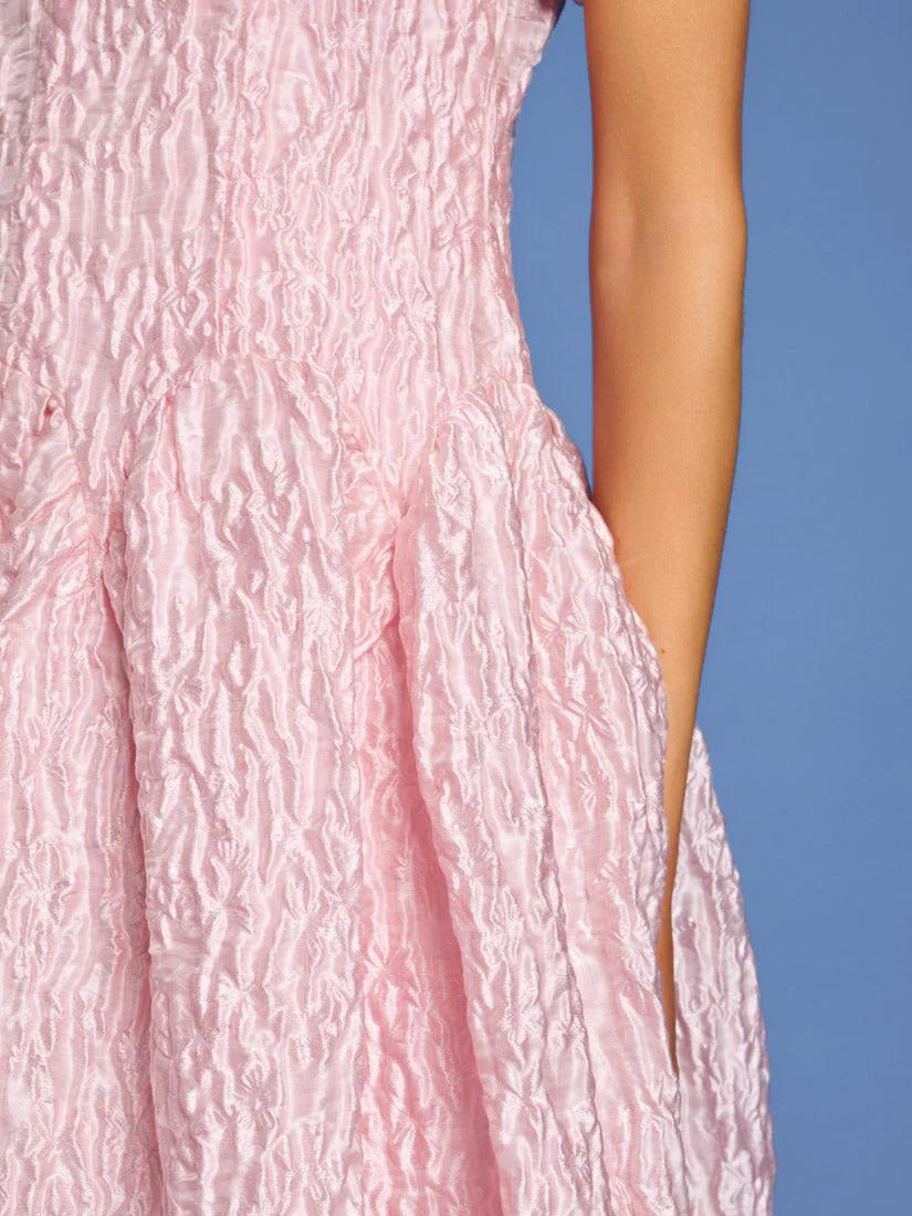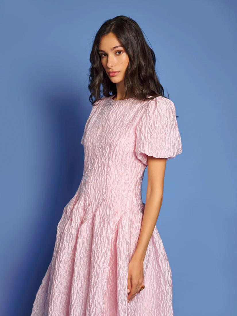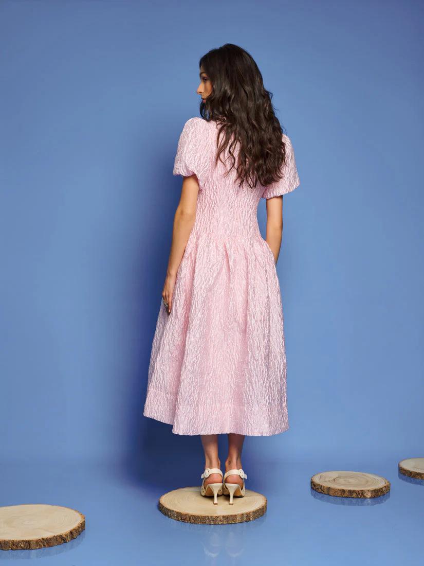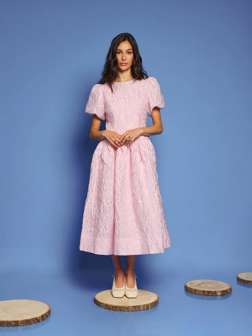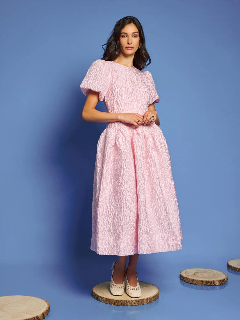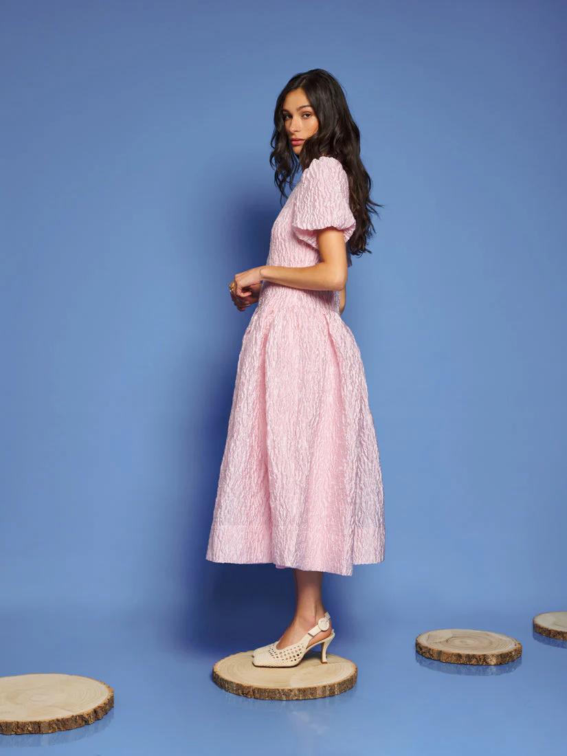 Rippling jacquard fabric cascades in fitted elegance, with a dropped waist curving like sunlit waves. The Ray Ripples Midi Dress is a dance of light and texture, perfect for days that stretch into golden dreams.