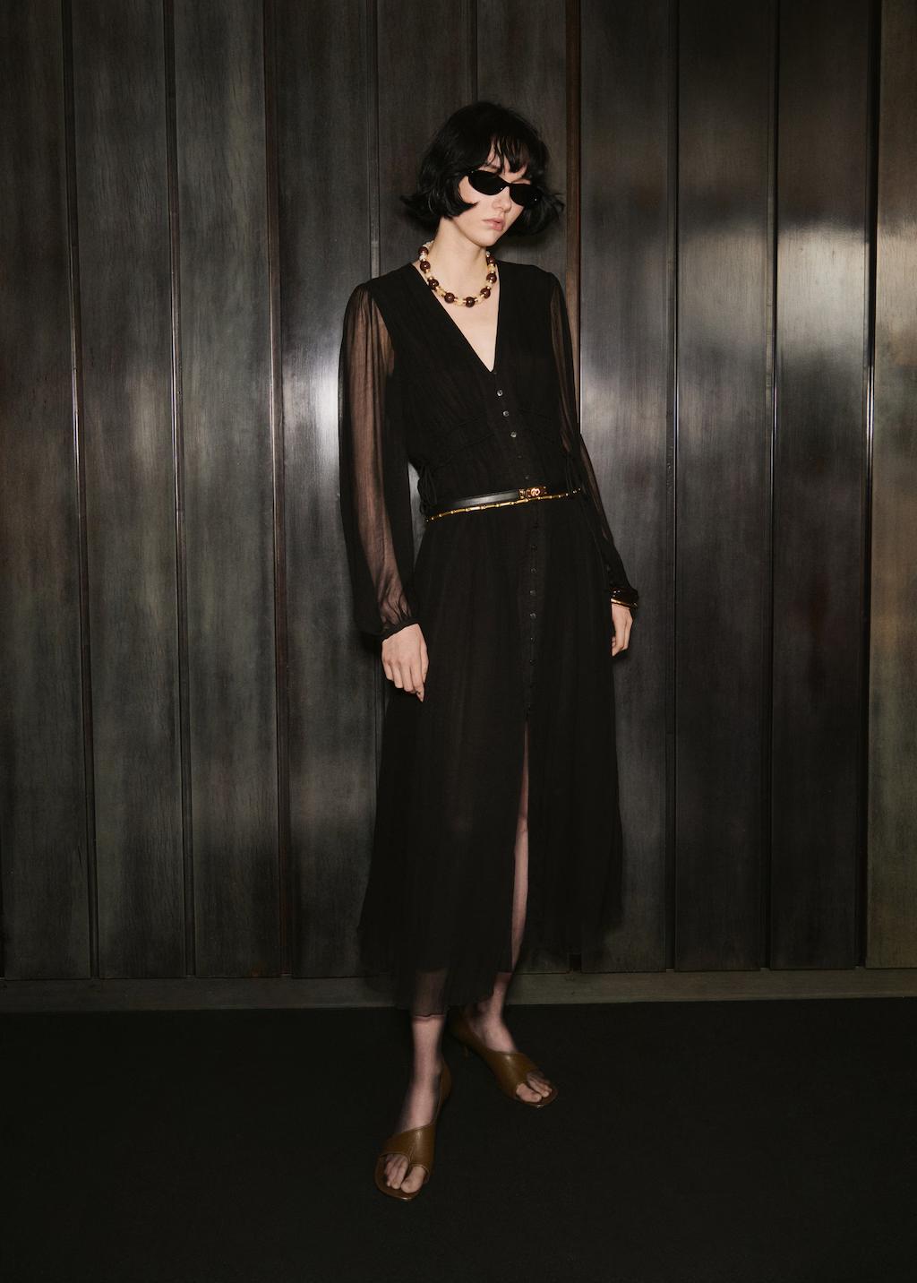 Tejido de gasa. Diseño midi. Diseño recto. Cuello pico. Manga larga abullonada. Lazos laterales. Abertura frontal en el bajo. Cierre delantero con botones. Forro interior